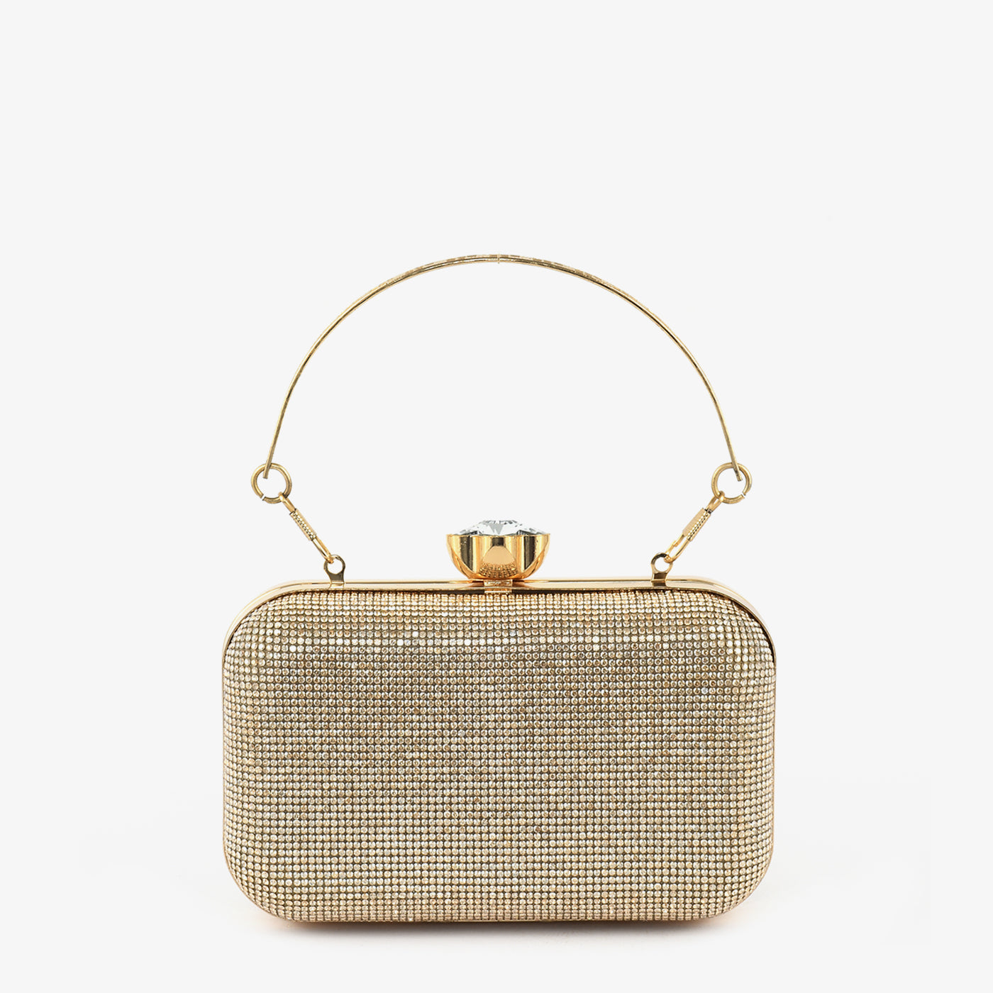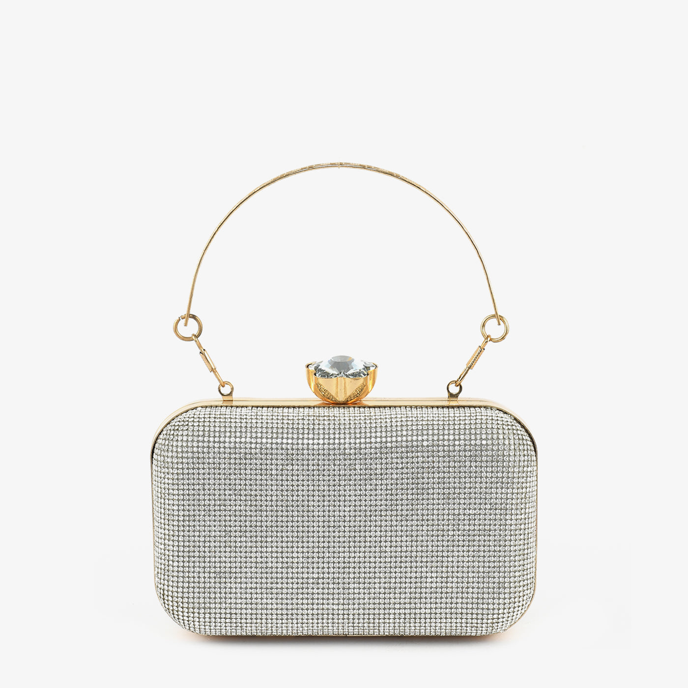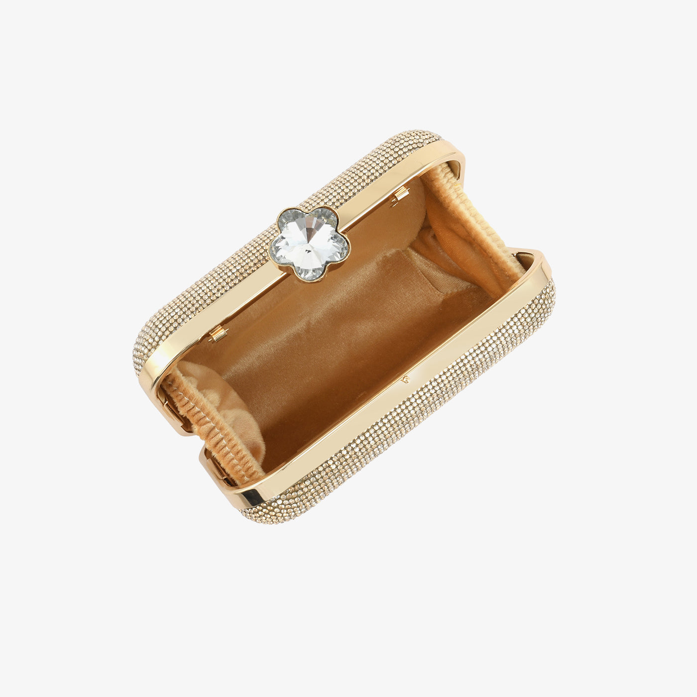A sleek clutch featuring fine all-over crystal detailing. Its structured rectangular shape and jeweled clasp make it timeless and versatile.