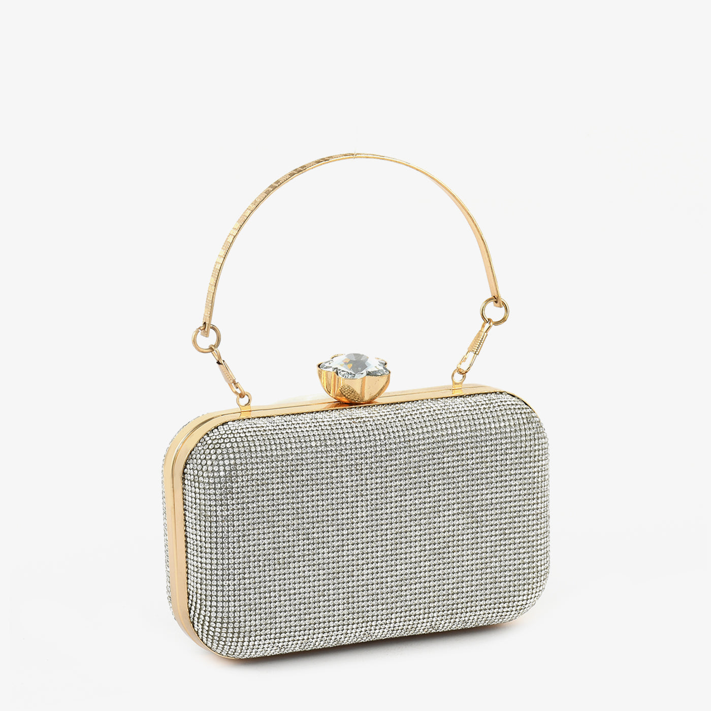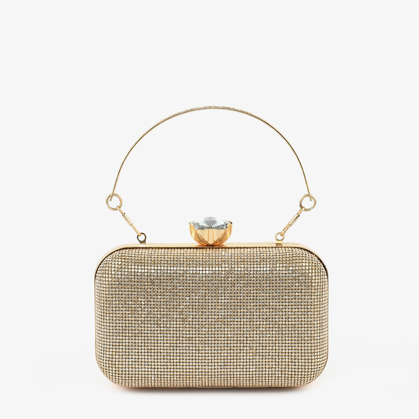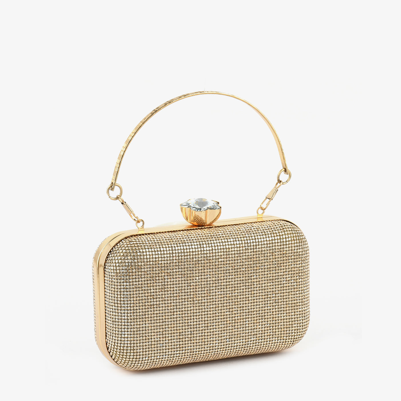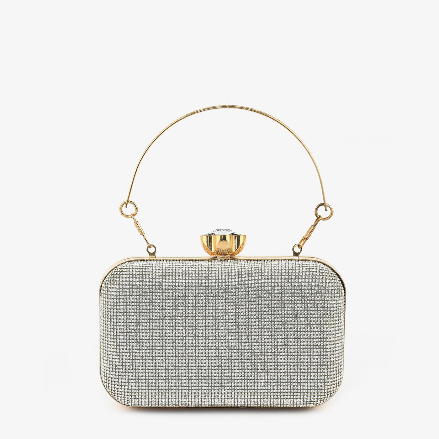 A sleek clutch featuring fine all-over crystal detailing. Its structured rectangular shape and jeweled clasp make it timeless and versatile.