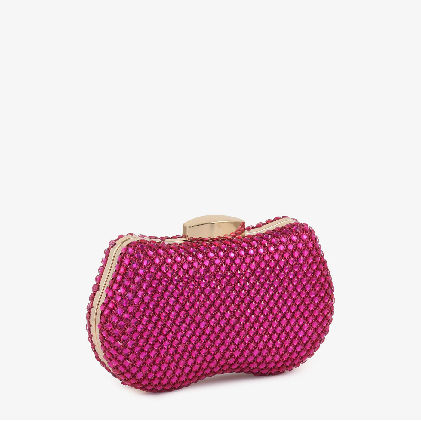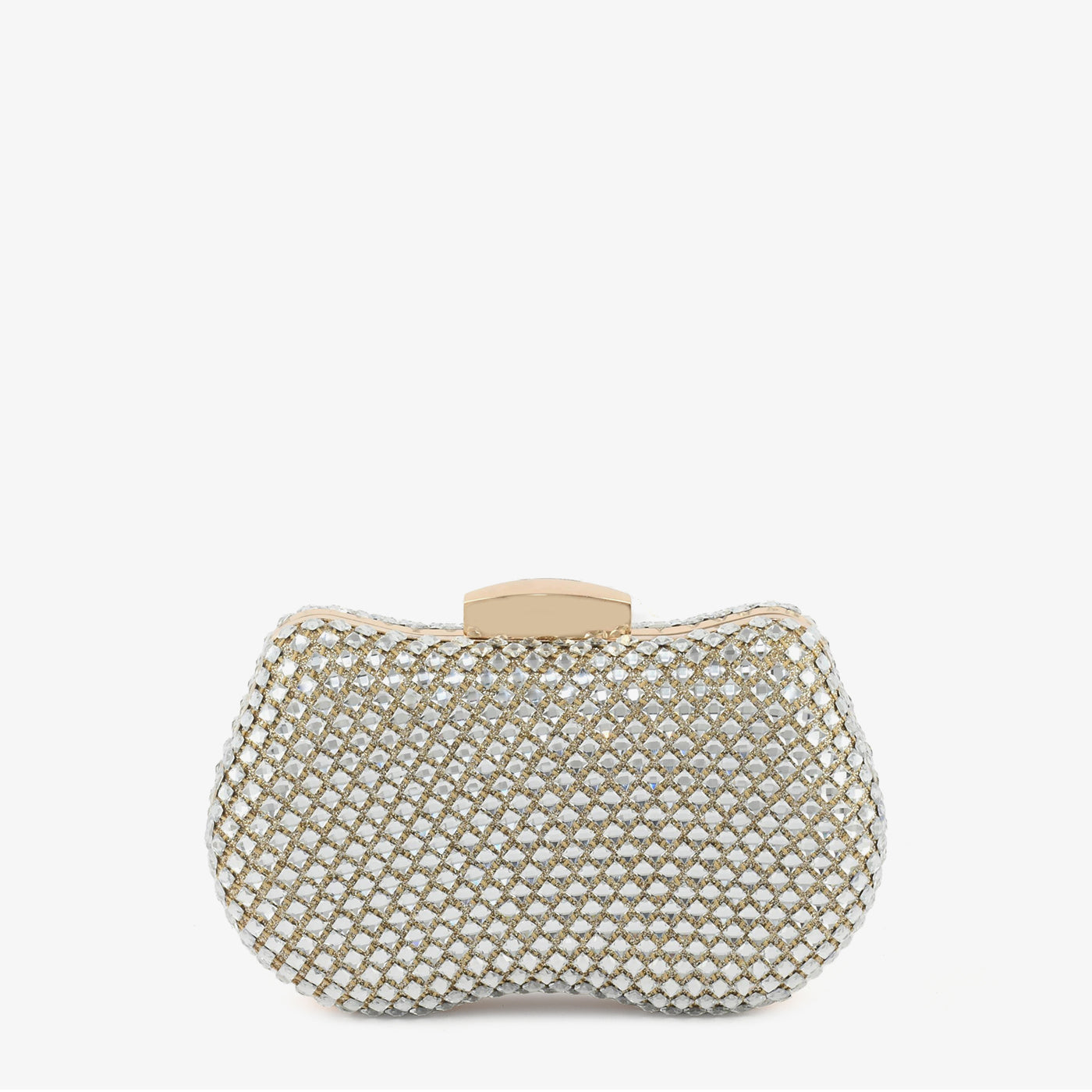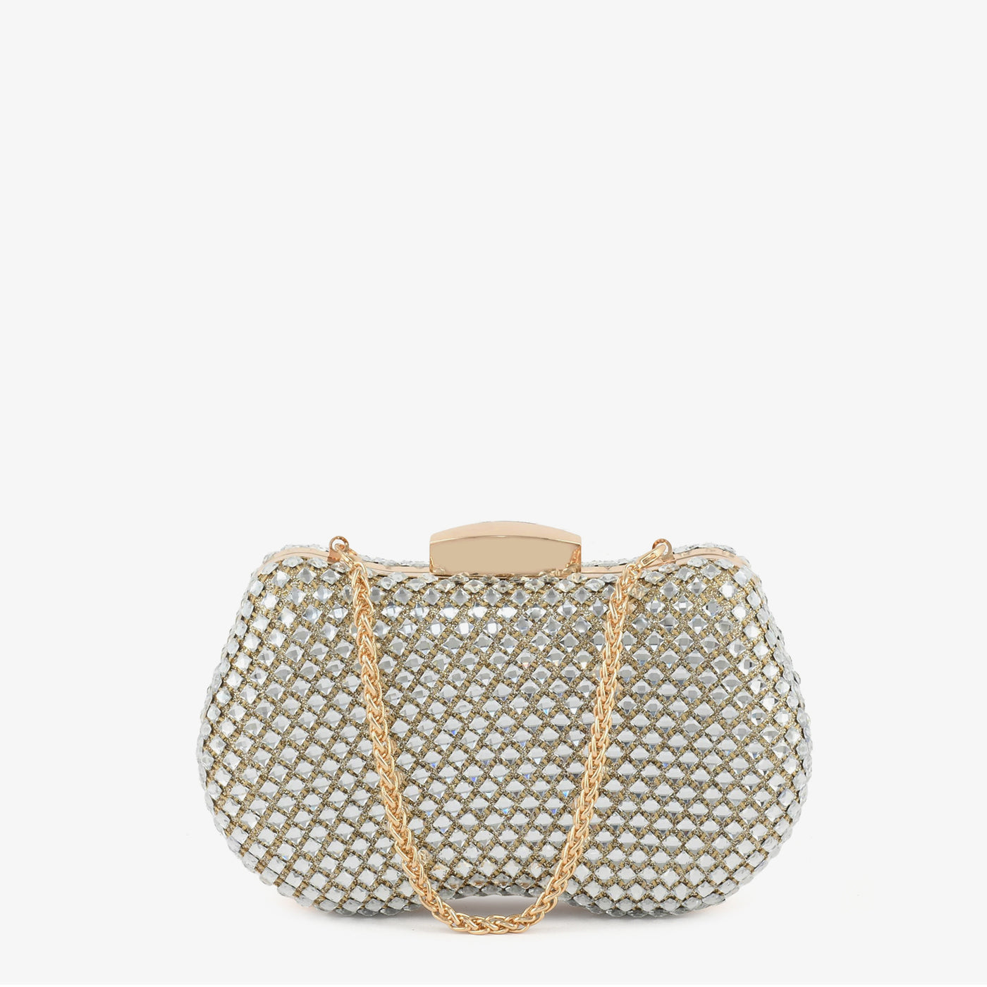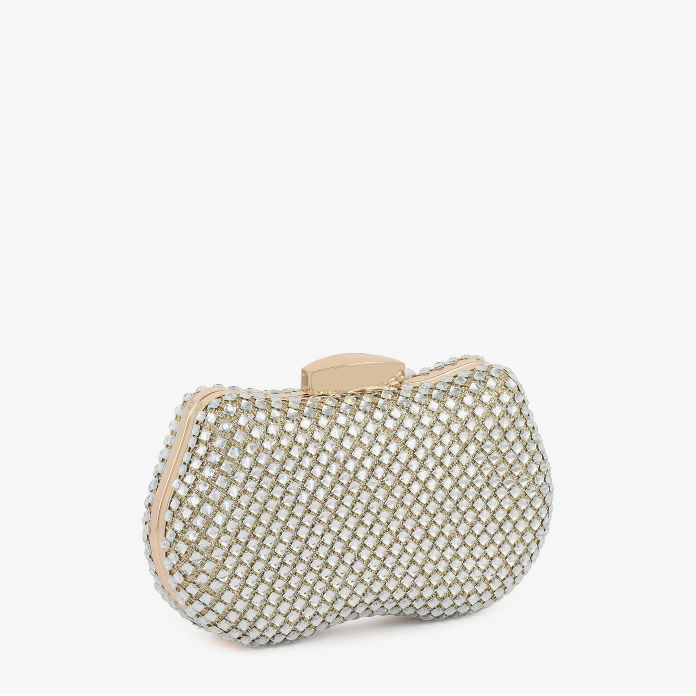 Crafted for festive evenings, this rounded oval frame features a fully covered silver diamond-cut crystal mesh exterior with a fine glitter base, creating a brilliant and eye-catching finish. The sleek gold bar clasp closure at the top adds a clean and refined accent, while the braided gold chain strap offers an elegant carry option. Compact and well-crafted, this piece is ideal for weddings, formal gatherings, and special occasions.