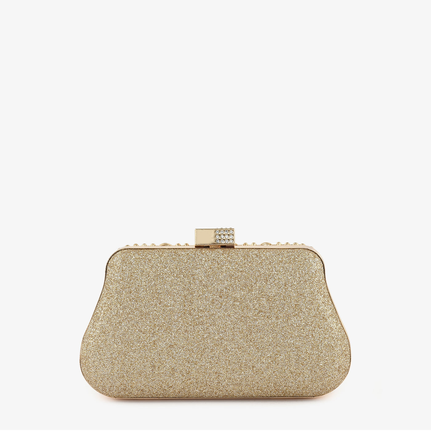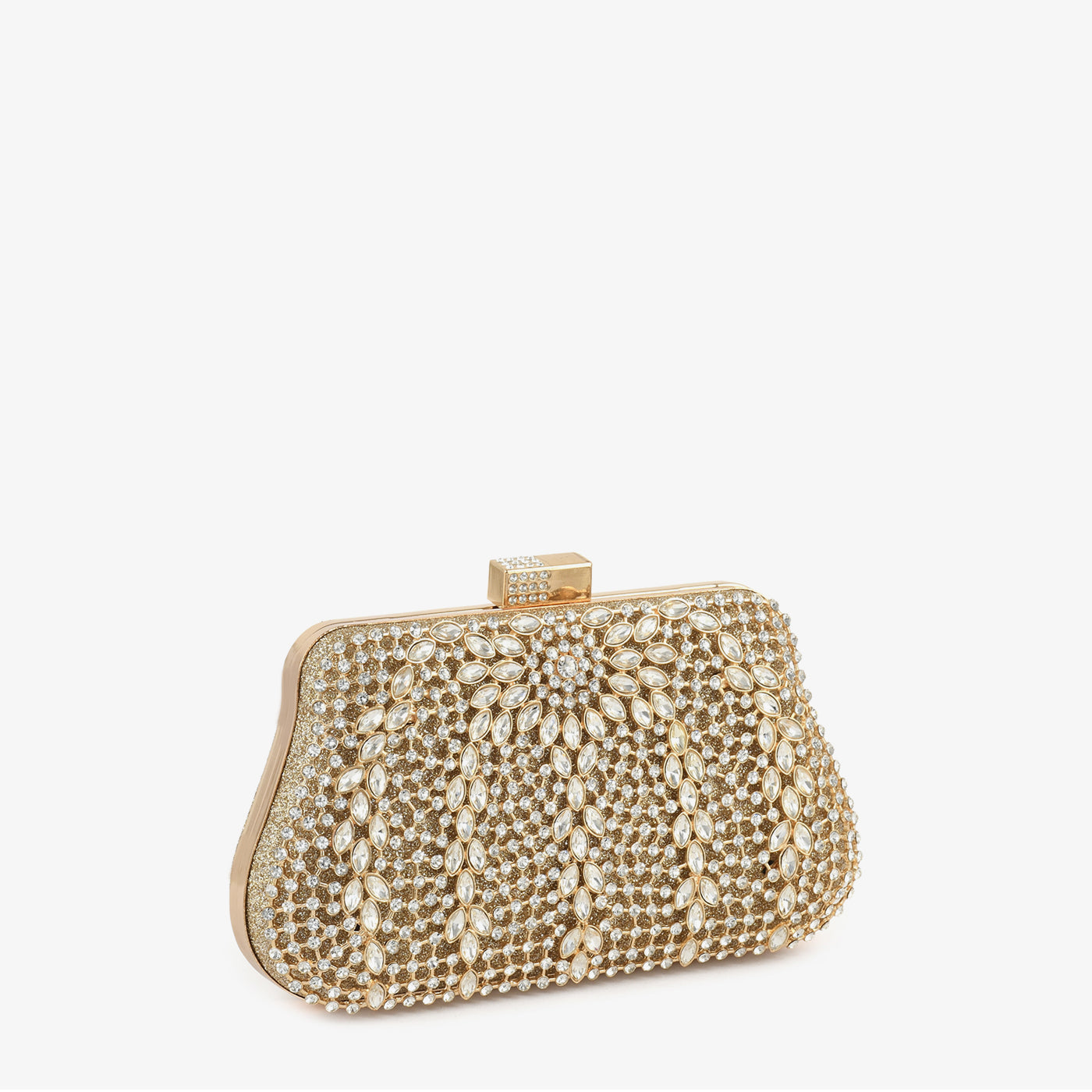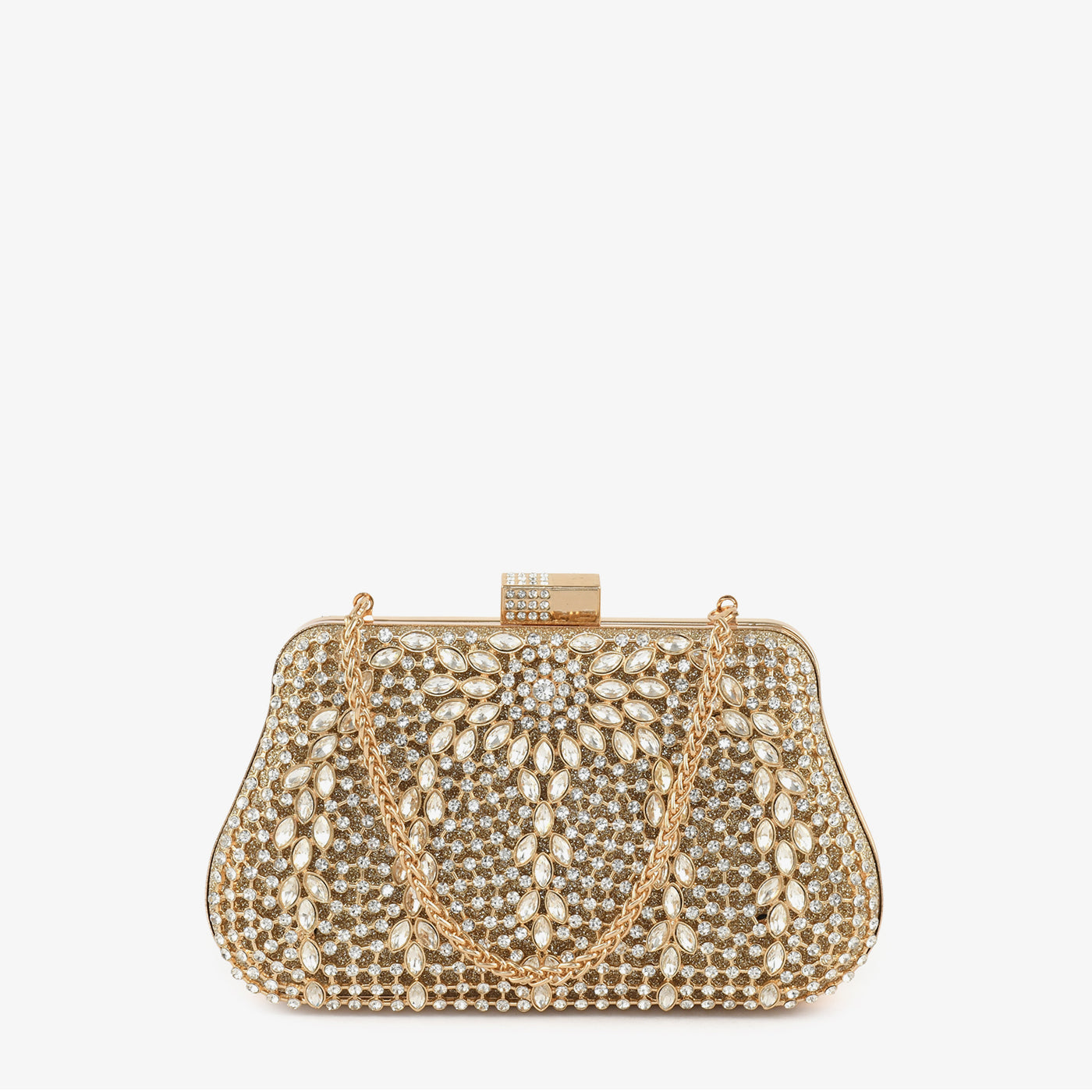 Crafted for festive evenings, this structured box features a fully covered gold glitter base densely adorned with marquise-cut crystal stones arranged in radiating petal clusters, interspersed with fine rhinestone detailing, creating a luminous and opulent finish. The crystal-studded gold rectangular clasp closure adds a sleek and refined accent, while the compact frame makes it ideal for weddings, formal gatherings, and special occasions.