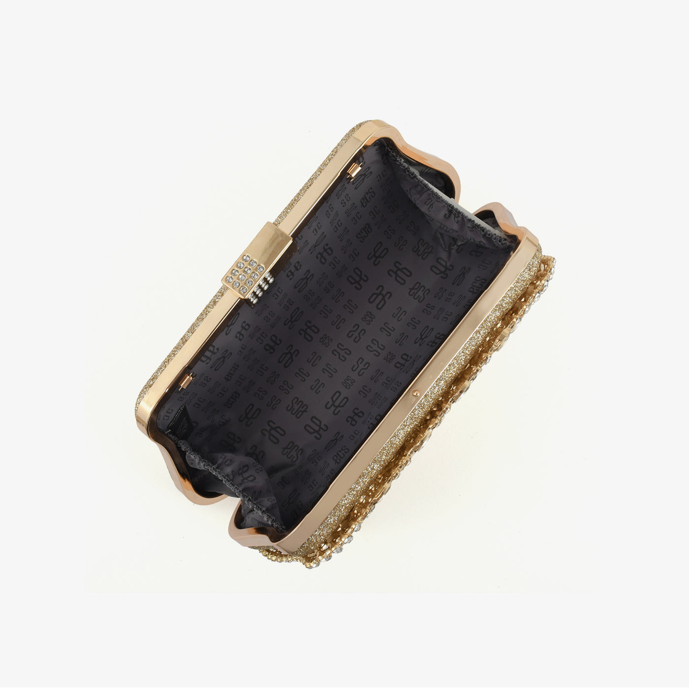 • Design: Structured box with radiating petal arrangement and crystal-studded gold clasp