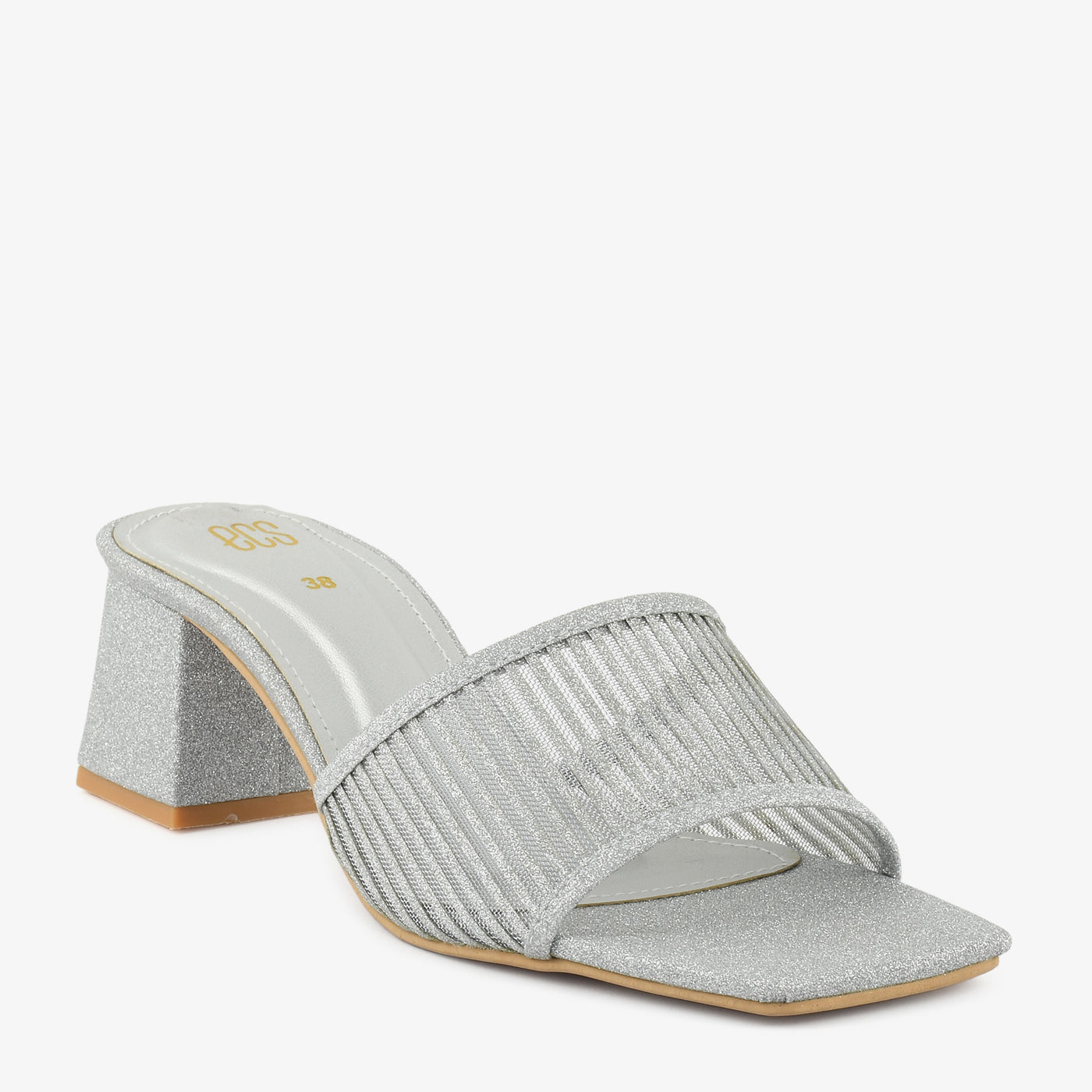 A refined slipper designed with shimmer-textured detailing and a modern striped upper. The block heel offers enhanced stability, while the comfortable footbed ensures all-day wearability. Its open-toe silhouette creates an airy feel perfect for warm weather. Suitable for semi-formal events, dinners, or stylish everyday wear.