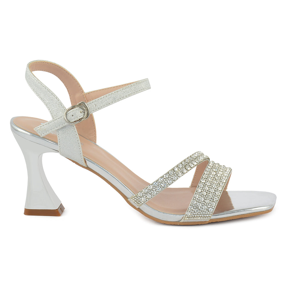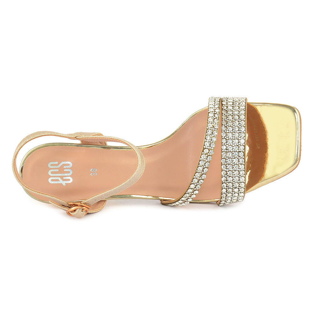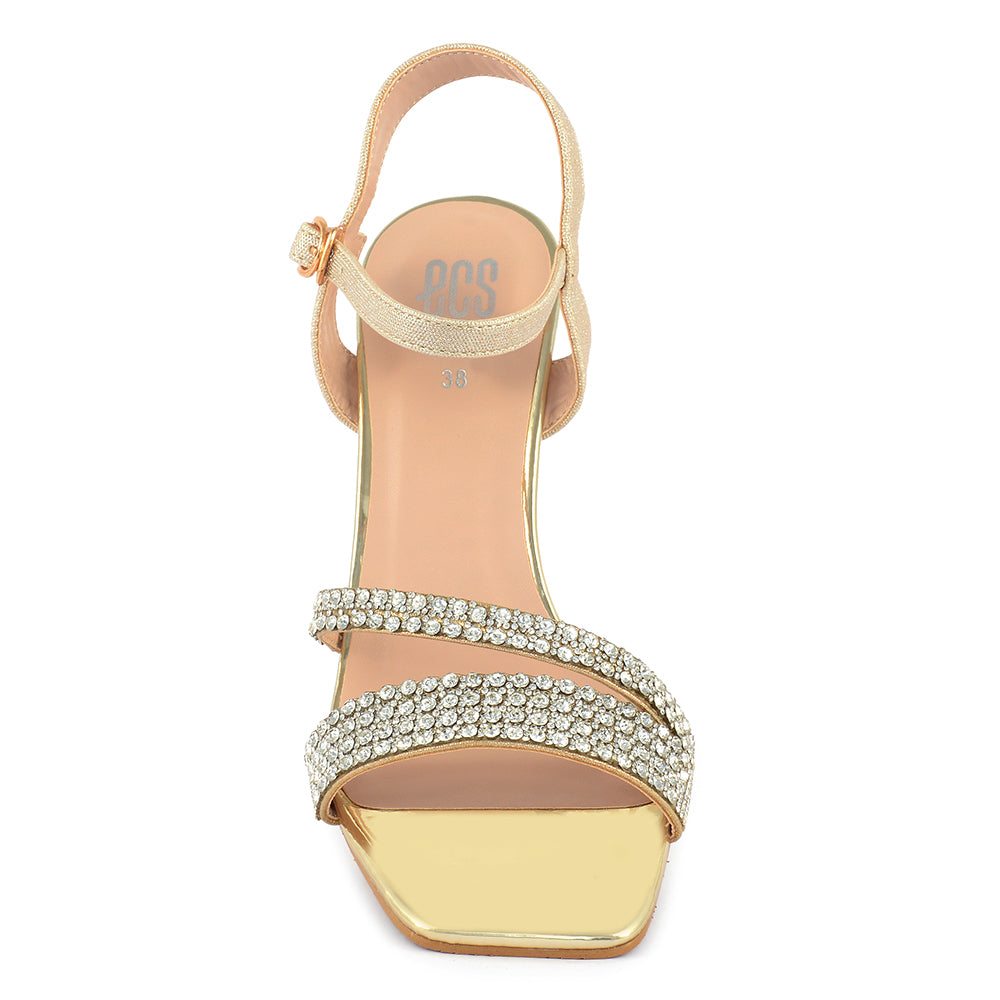The sandal showcases dual embellished straps with shimmering rhinestones and metallic detailing. Its sleek heel and ankle strap ensure both style and stability, perfect for parties and dinners.