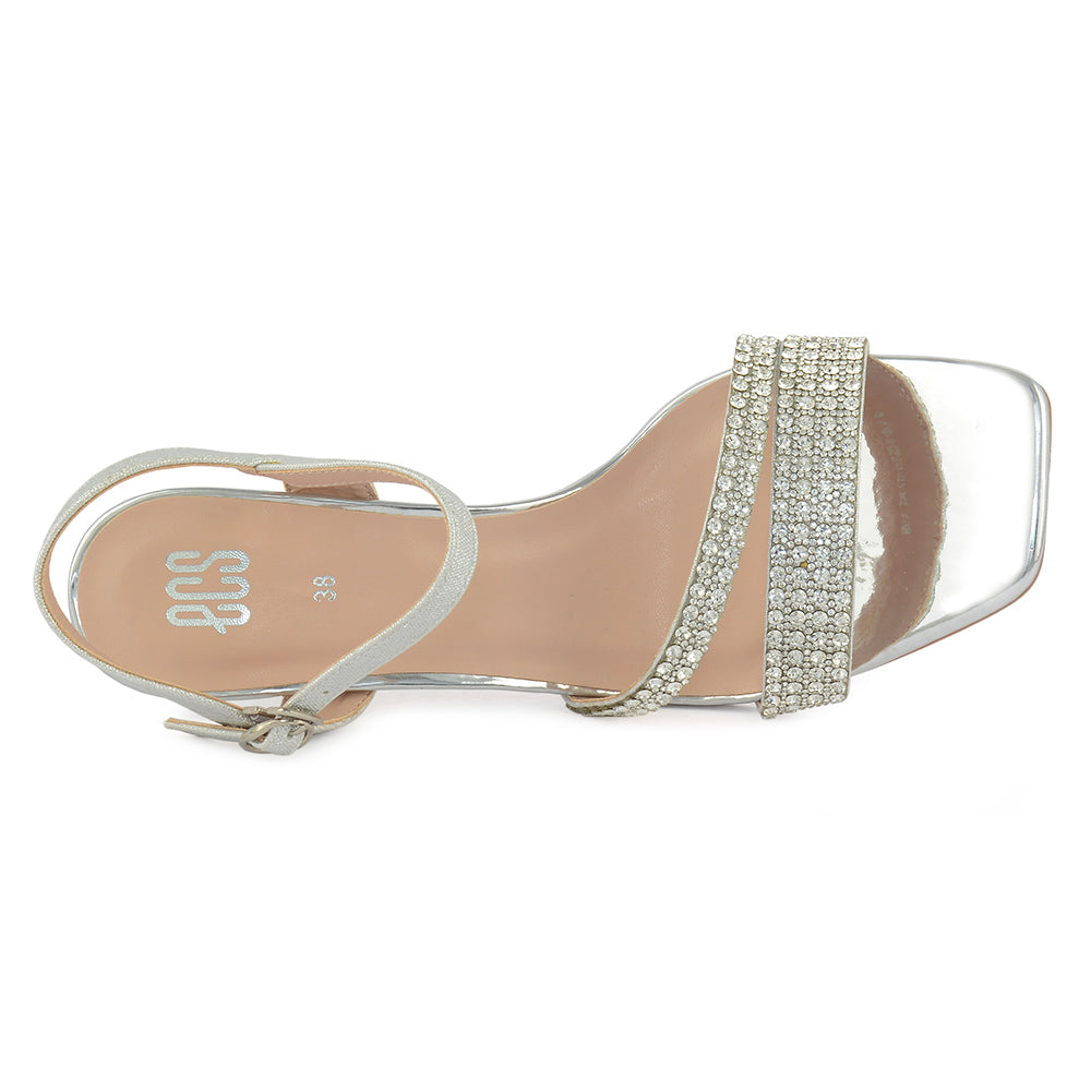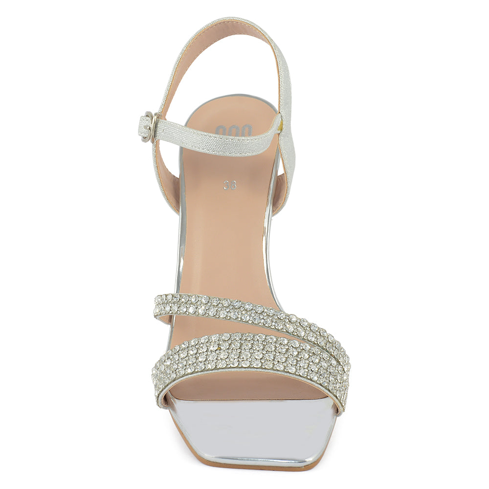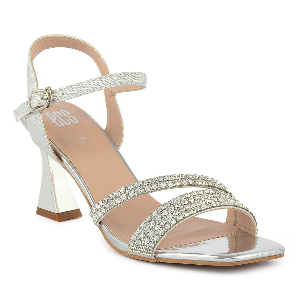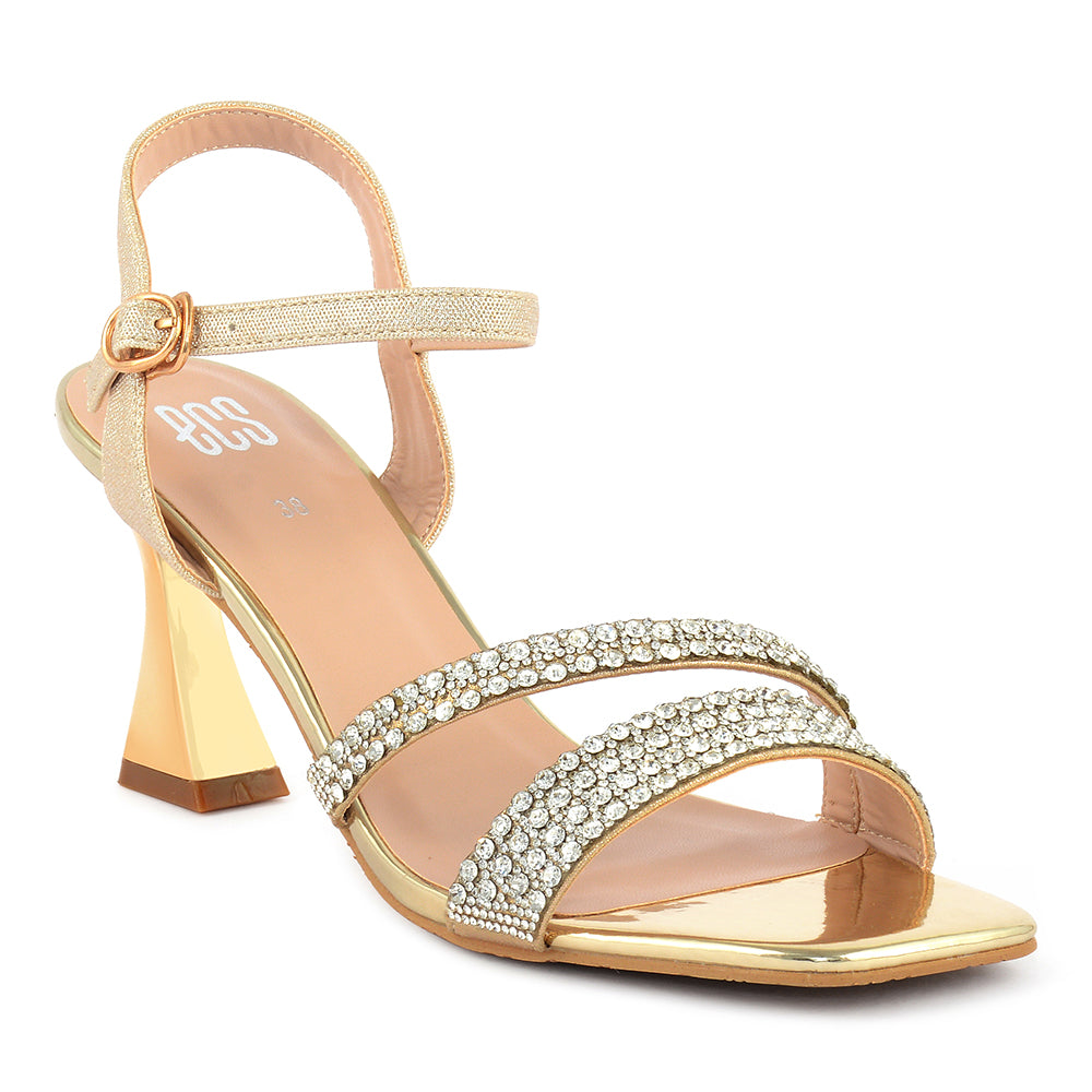 The sandal showcases dual embellished straps with shimmering rhinestones and metallic detailing. Its sleek heel and ankle strap ensure both style and stability, perfect for parties and dinners.