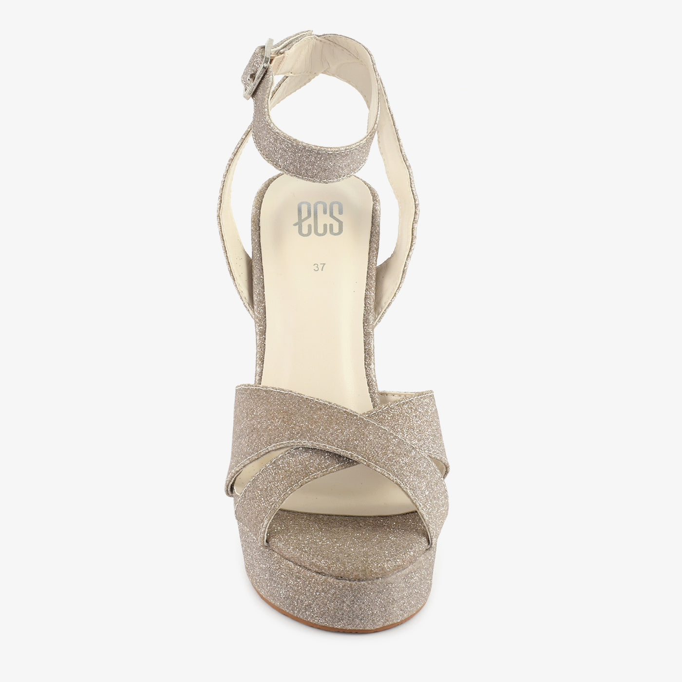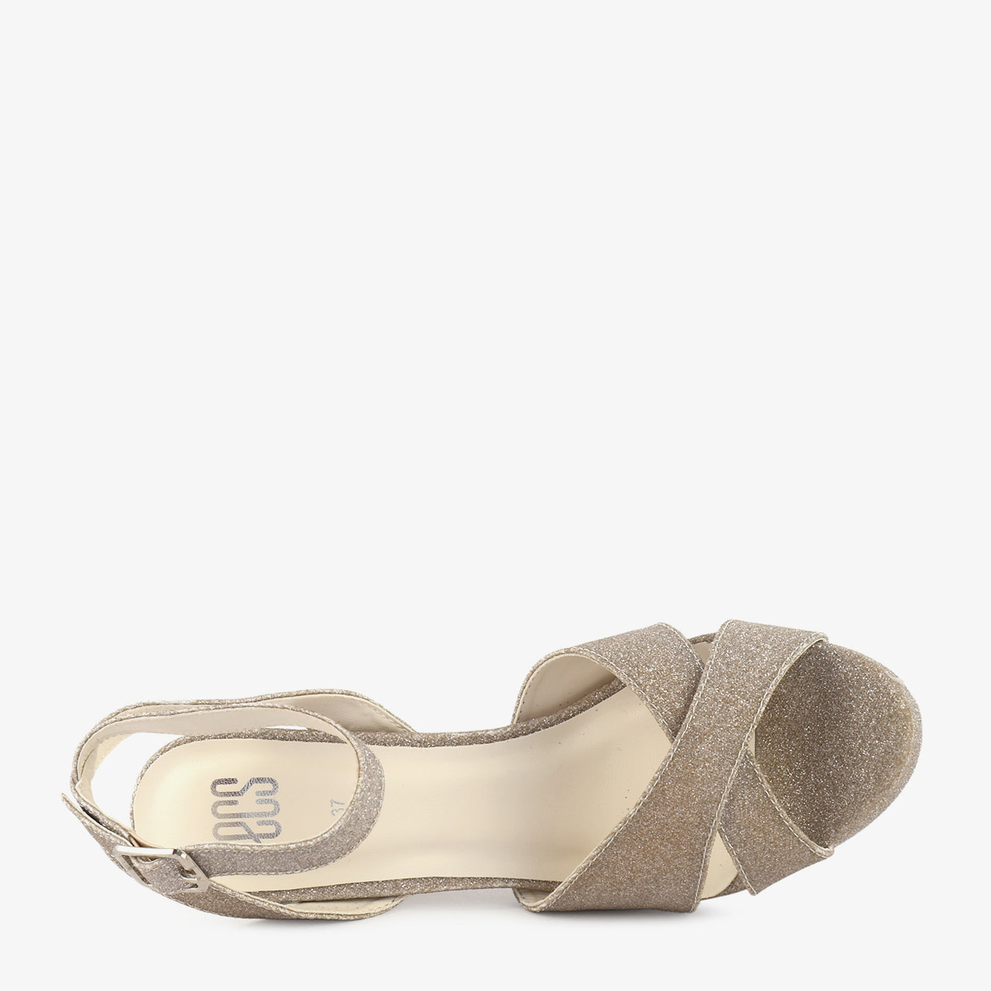 Step into dazzling style with these gold glitter platform sandals, featuring a high stiletto heel and crisscrossing straps. The adjustable ankle strap provides a secure and glamorous fit for your special occasions in Lahore.