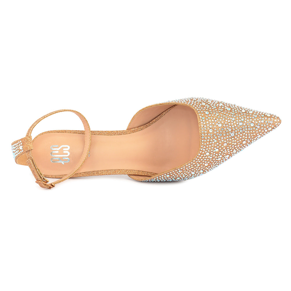 A stylish gold low-heel pump. It features a pointed toe and a unique, hourglass-shaped heel. The shimmering material and delicate ankle strap make it a versatile choice.