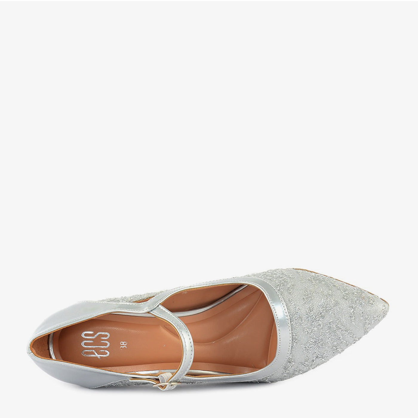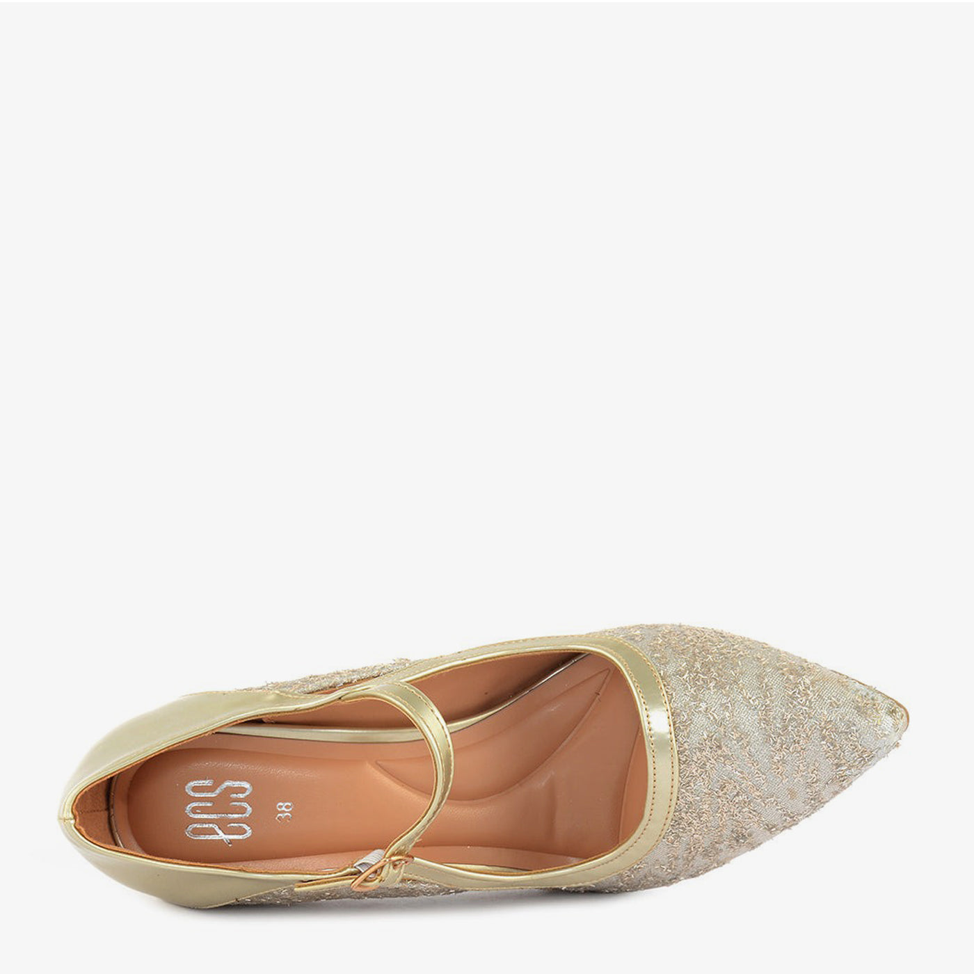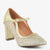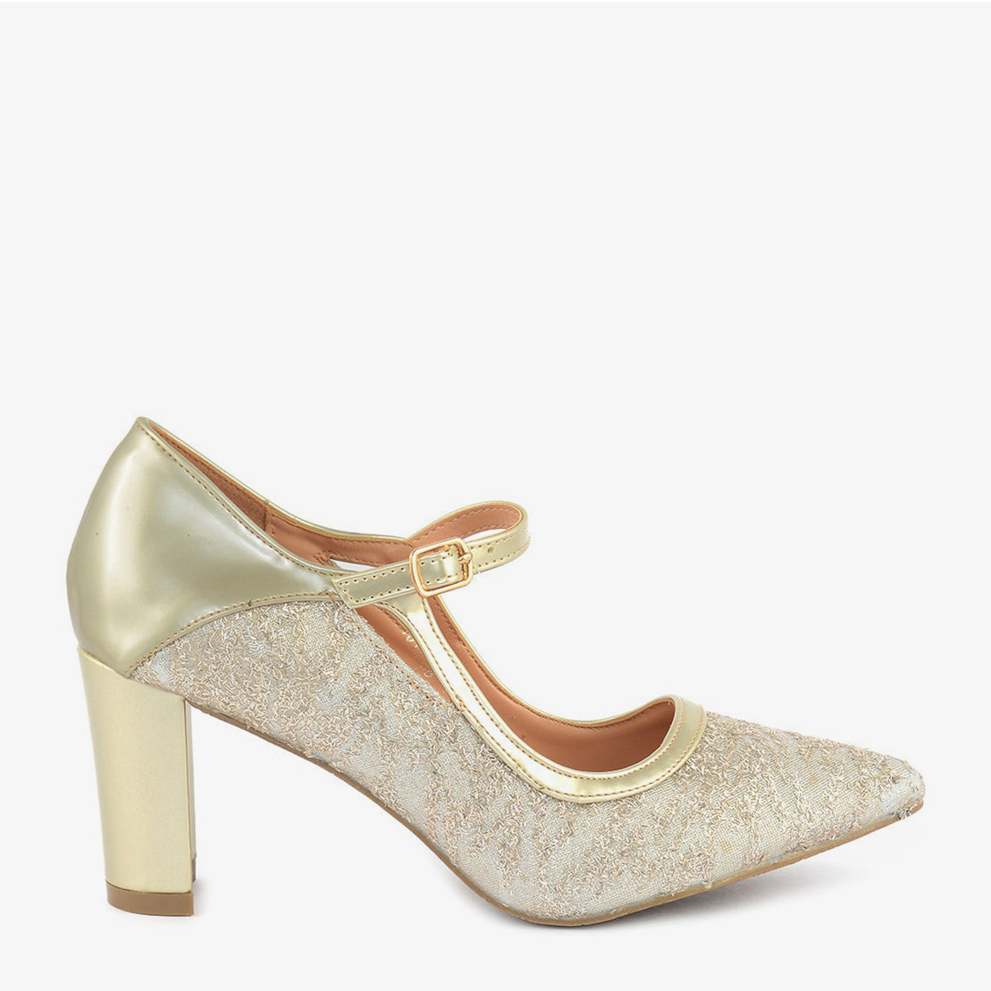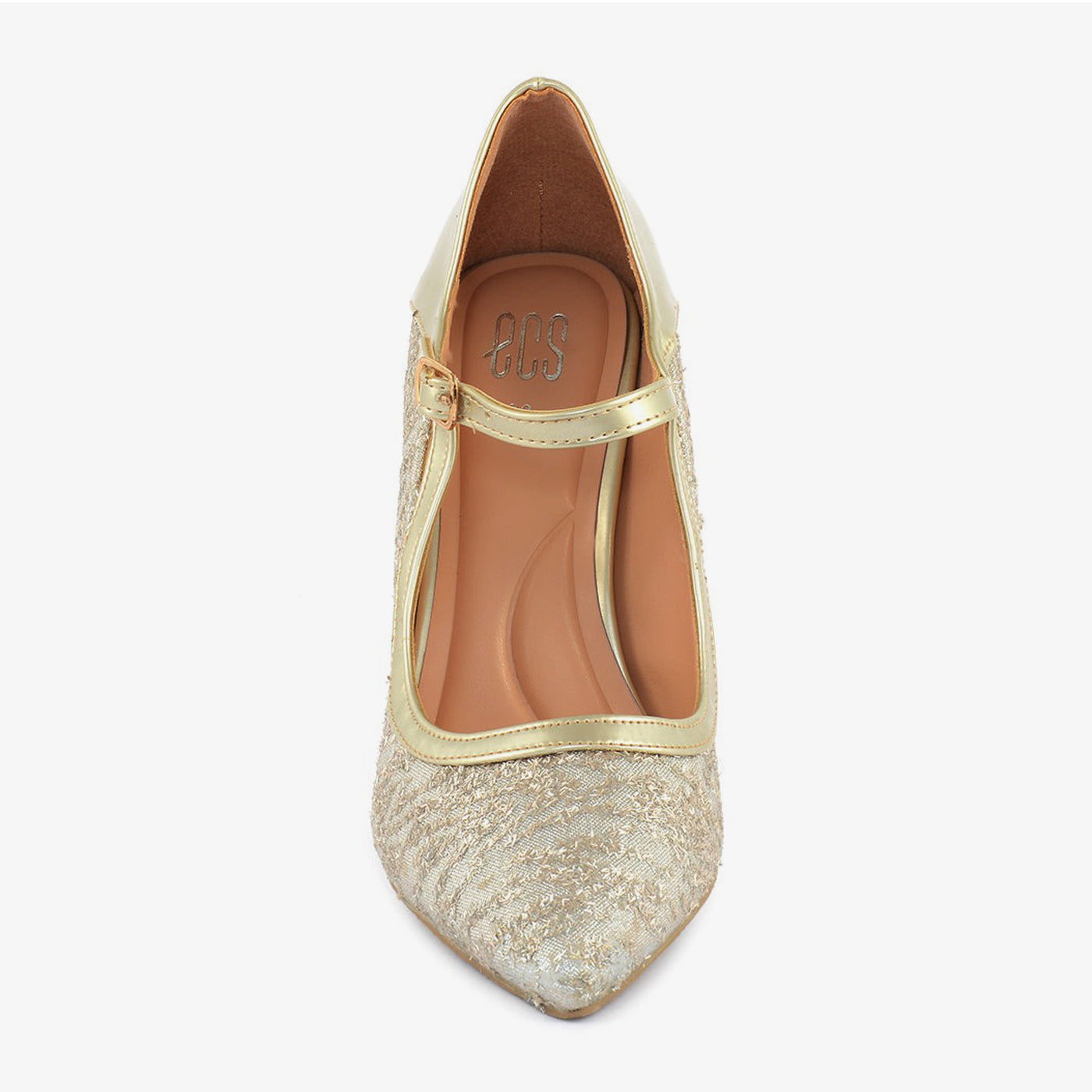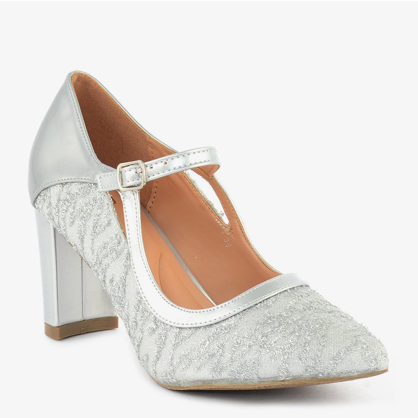 This closed-toe heel combines classic structure with a modern T-strap and soft shimmer. It offers comfort without compromising elegance.