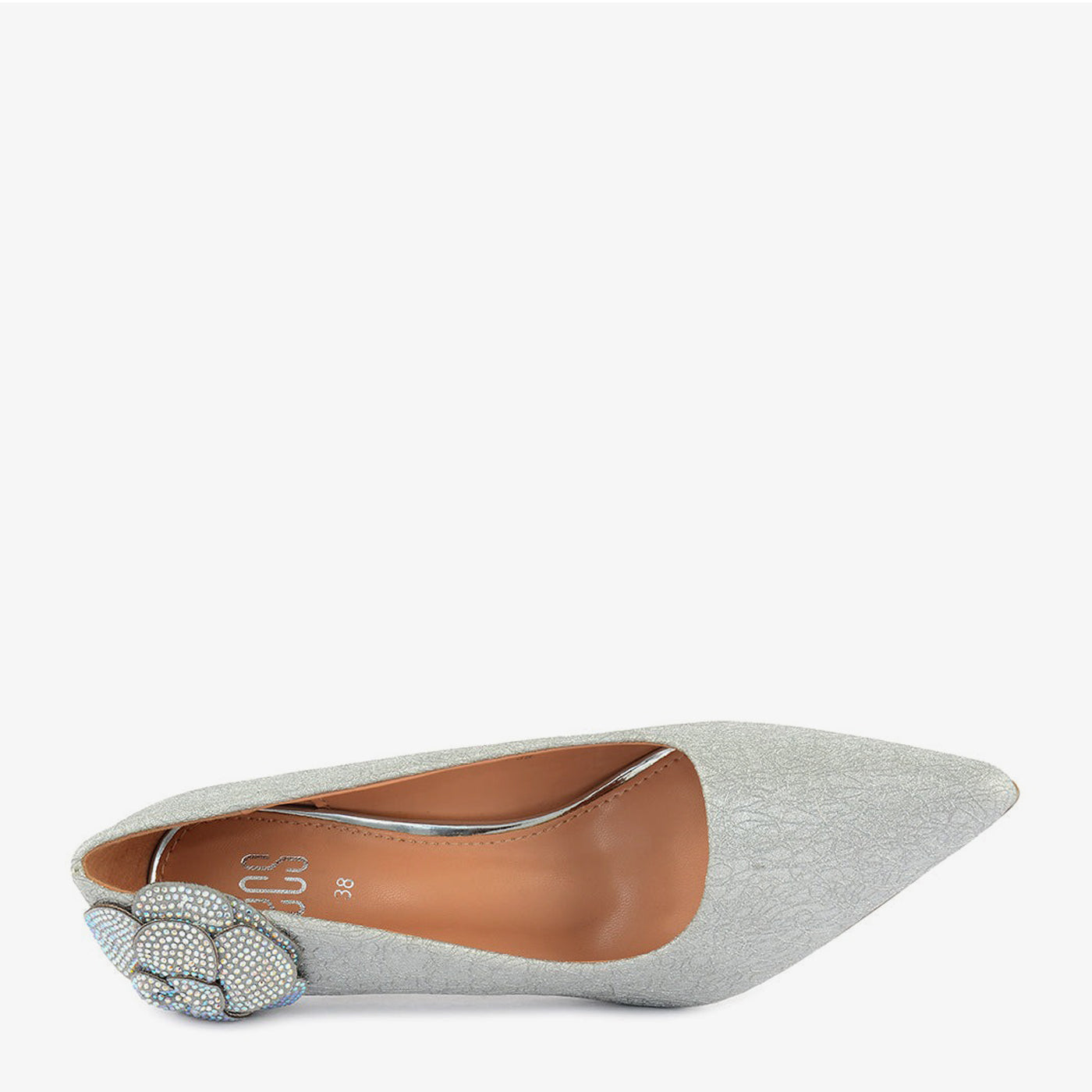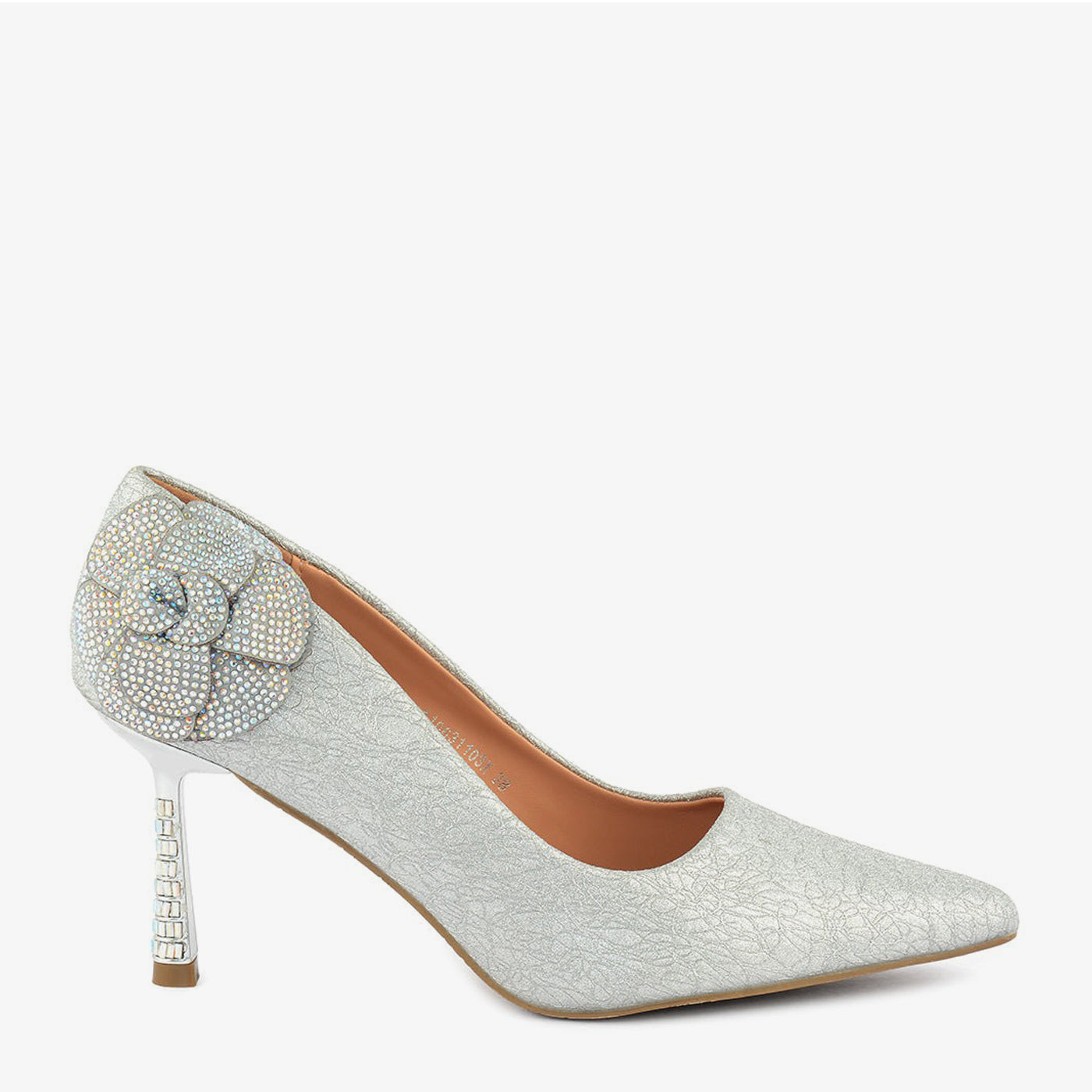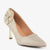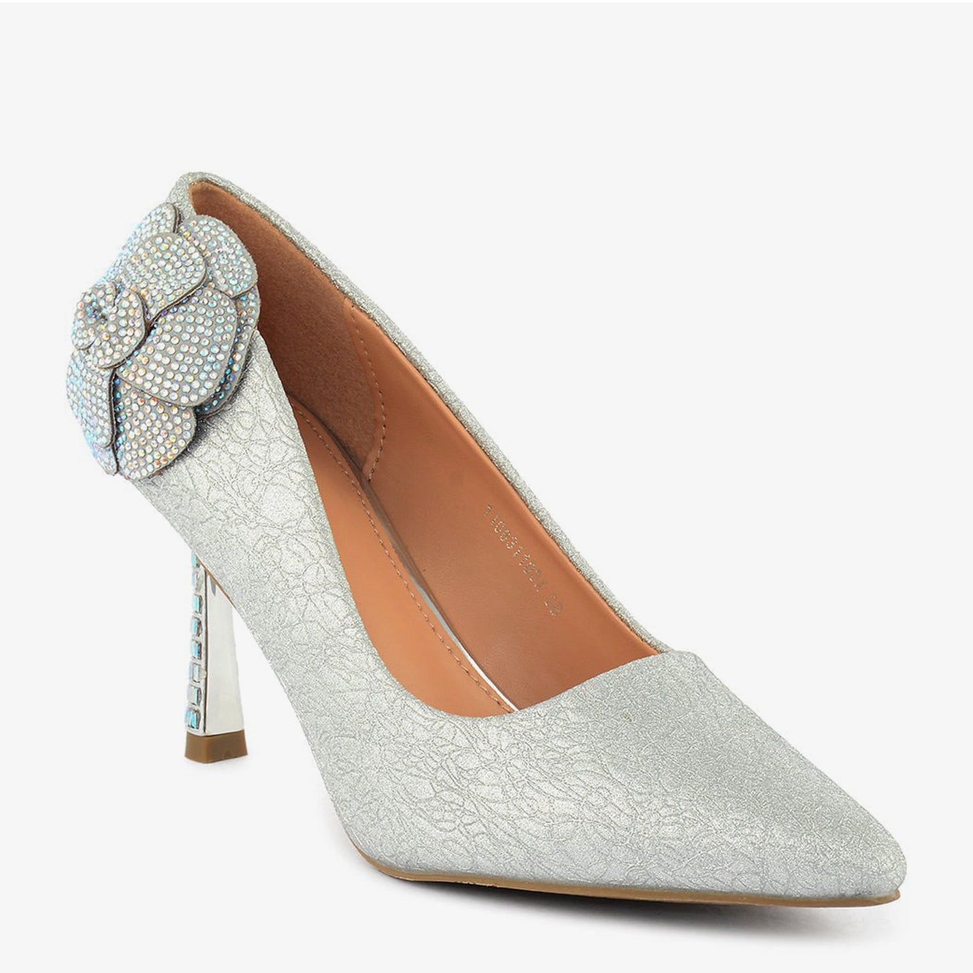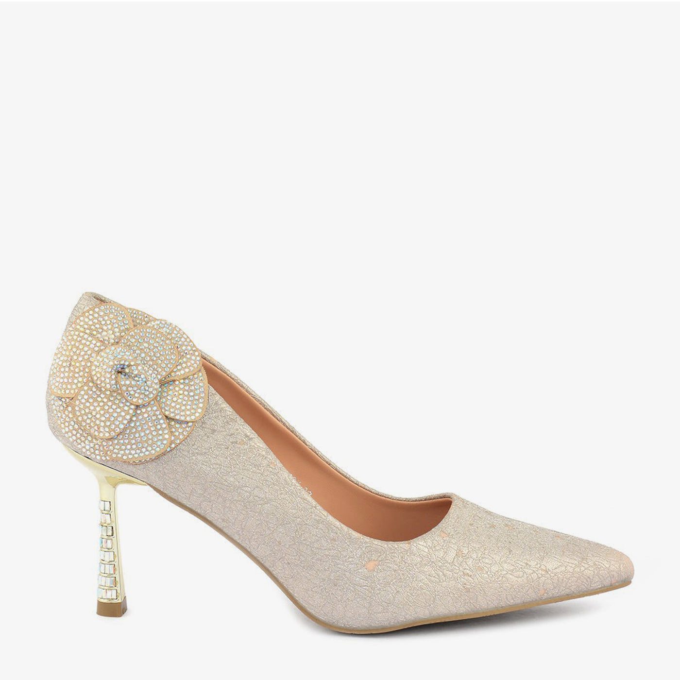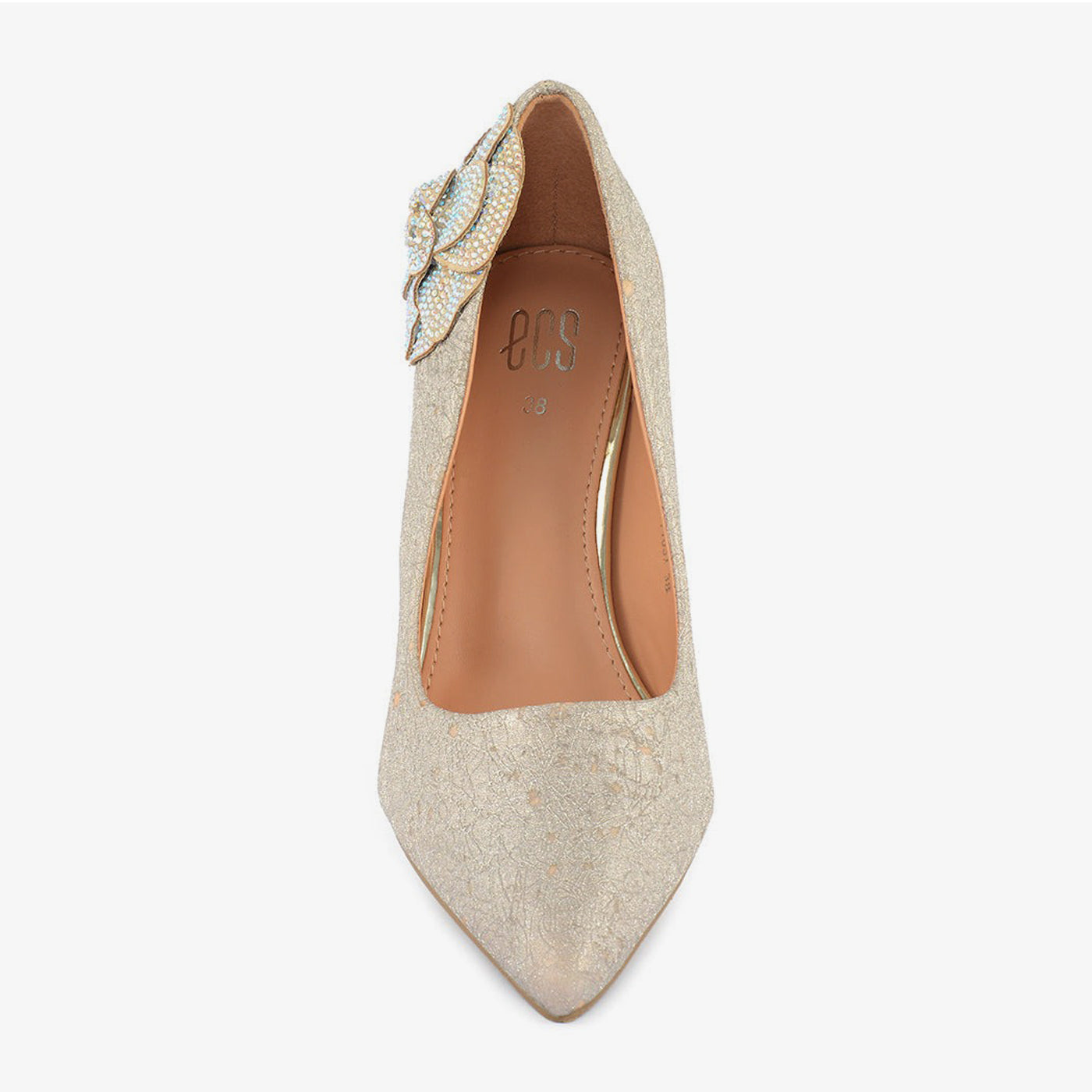 Elevated with a rhinestone floral detail, this heel brings elegance and charm. The lightly textured upper and gold-toned heel give it graceful appeal.