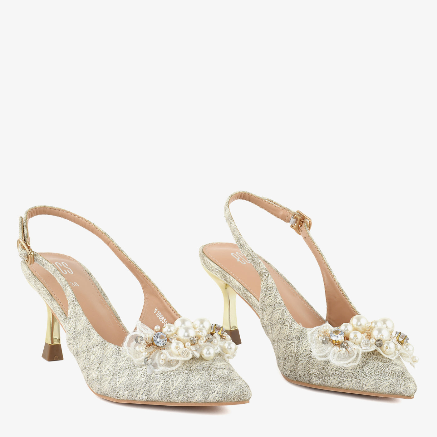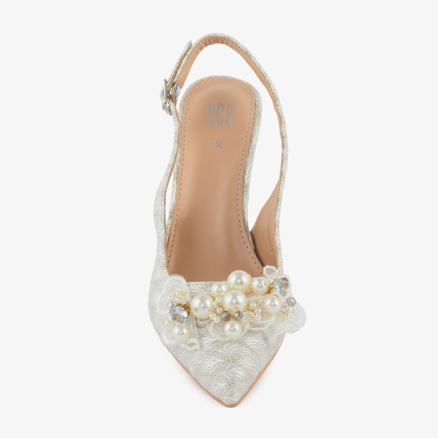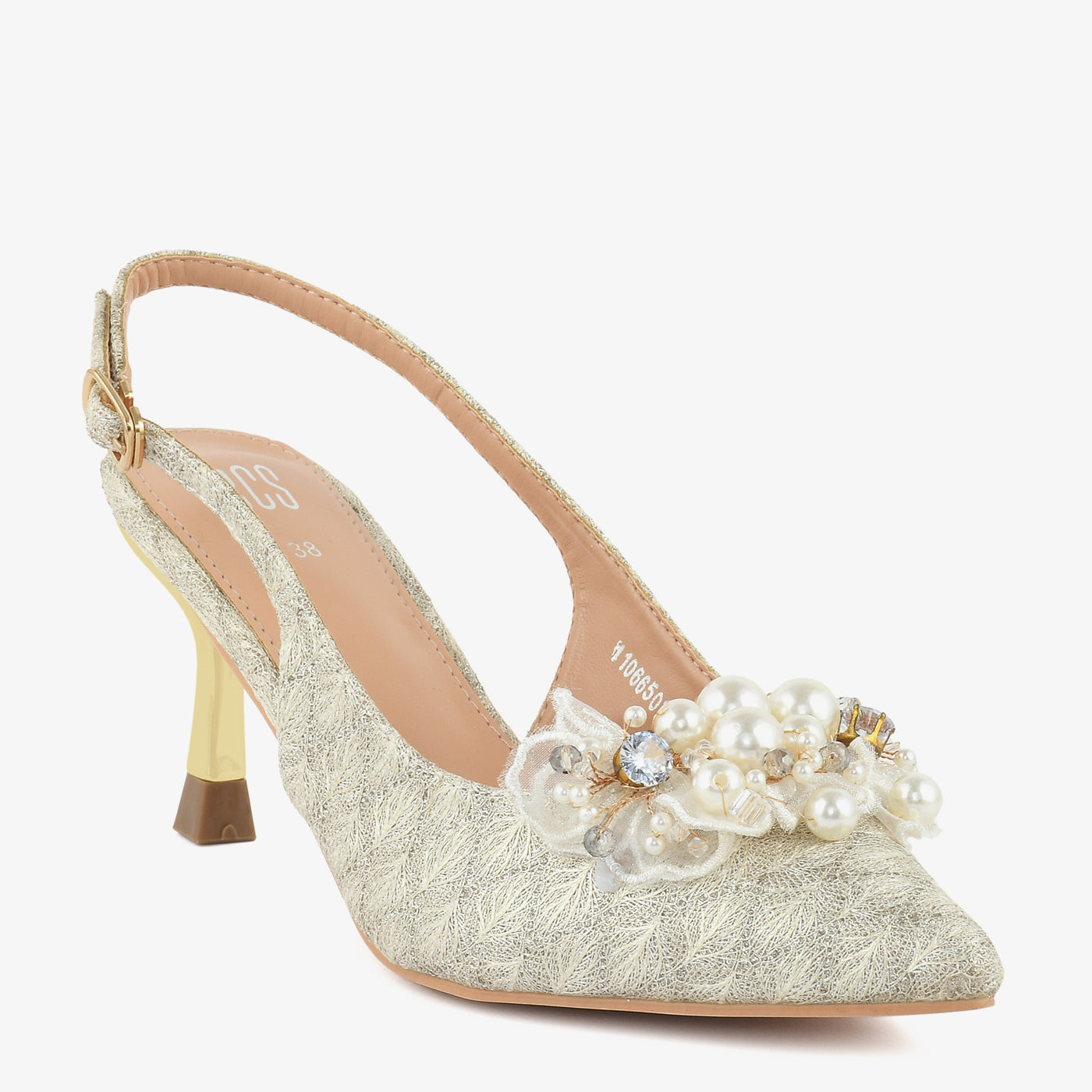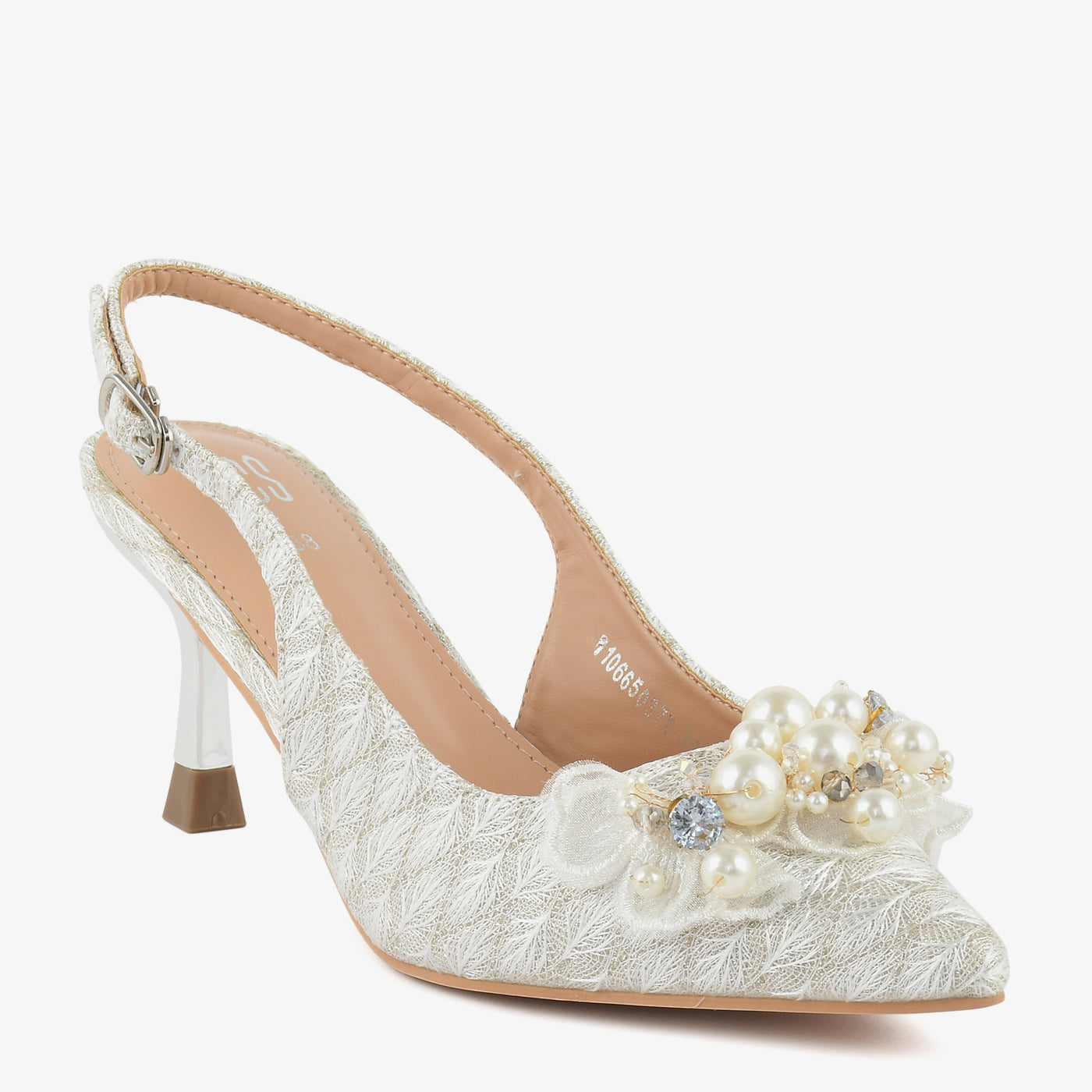 A delicate court shoe adorned with floral lace and pearl embellishments. The slingback strap adds a touch of refinement, while the cushioned sole keeps you comfortable all day. Ideal for weddings, festive occasions, or elegant evenings.