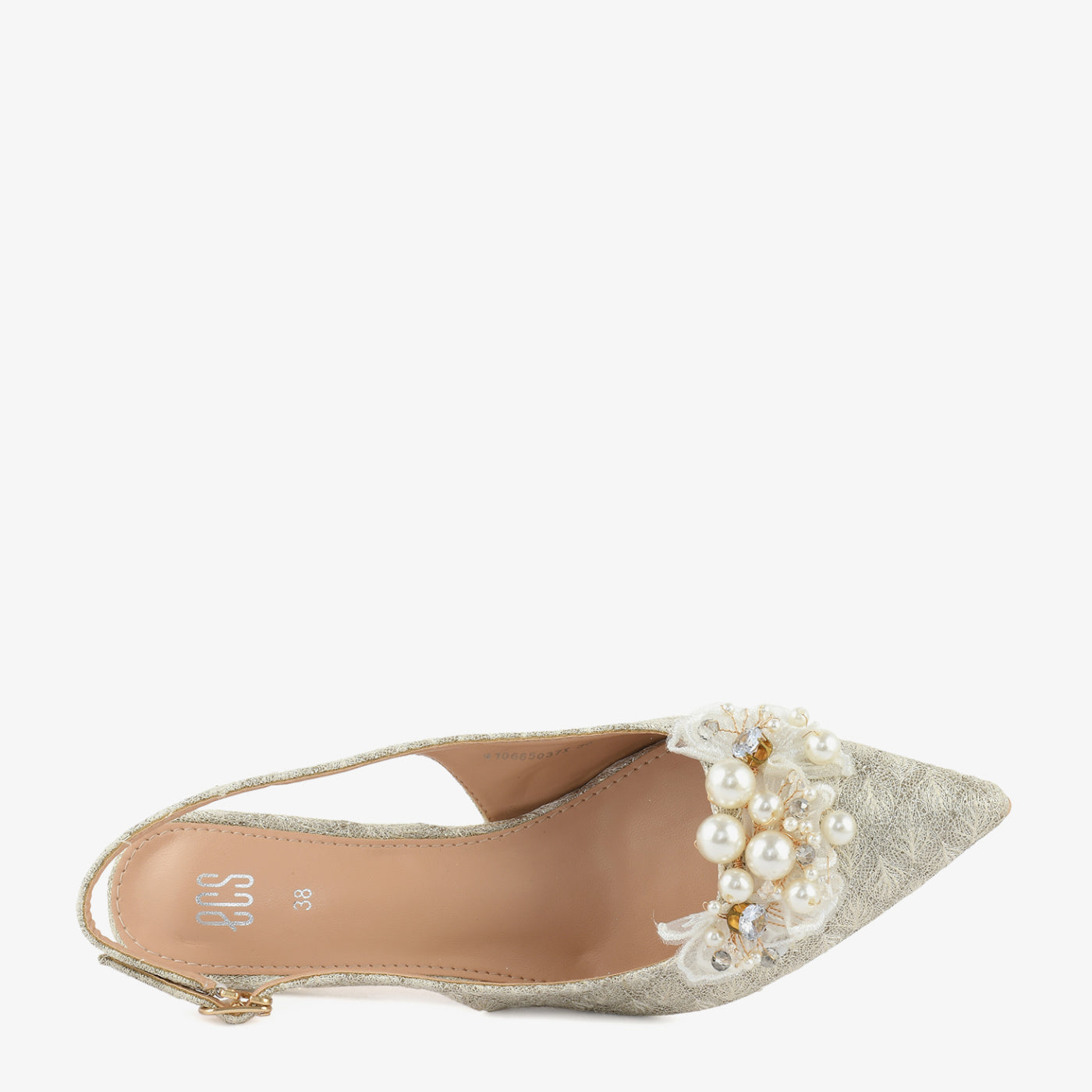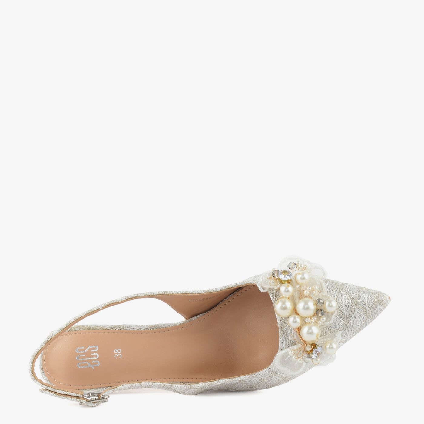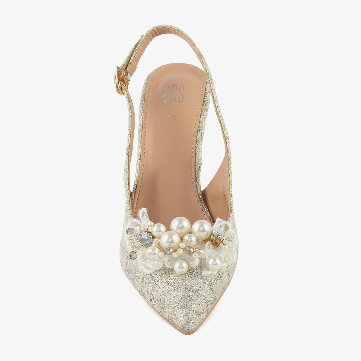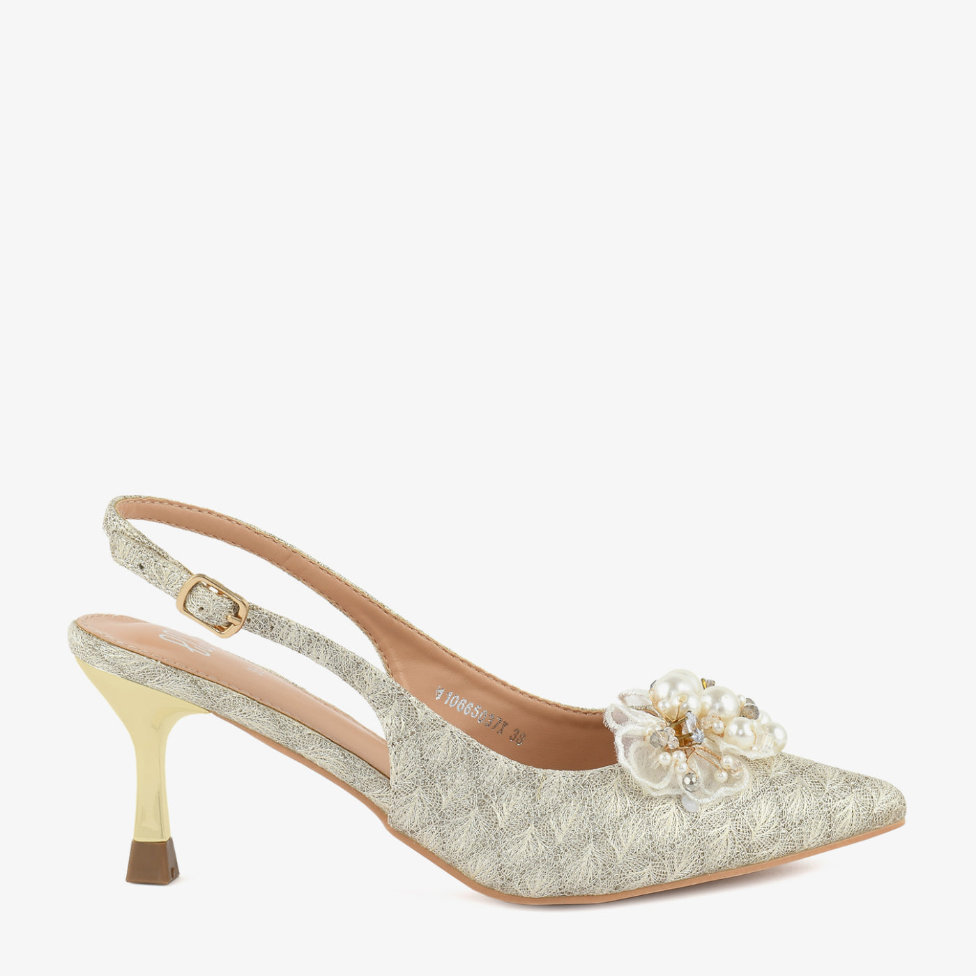 A delicate court shoe adorned with floral lace and pearl embellishments. The slingback strap adds a touch of refinement, while the cushioned sole keeps you comfortable all day. Ideal for weddings, festive occasions, or elegant evenings.