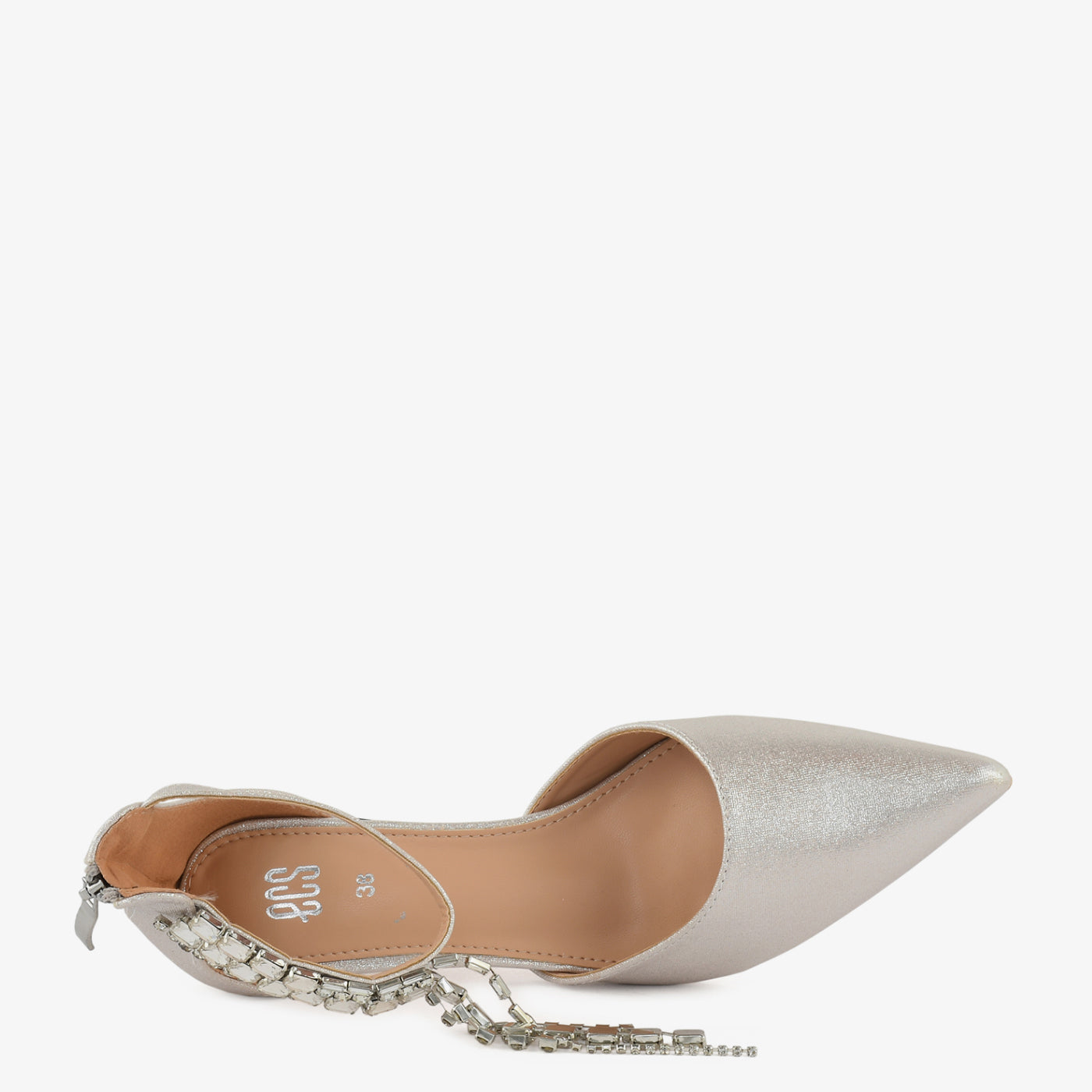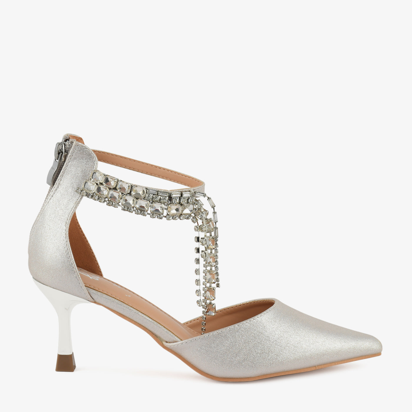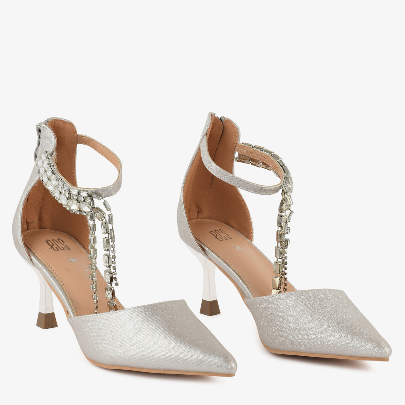 A glamorous pointed coat shoe designed to captivate at every step. Sparkling minimal chains add graceful movement and high-fashion charm. Lightweight padding ensures comfort while you shine all evening.