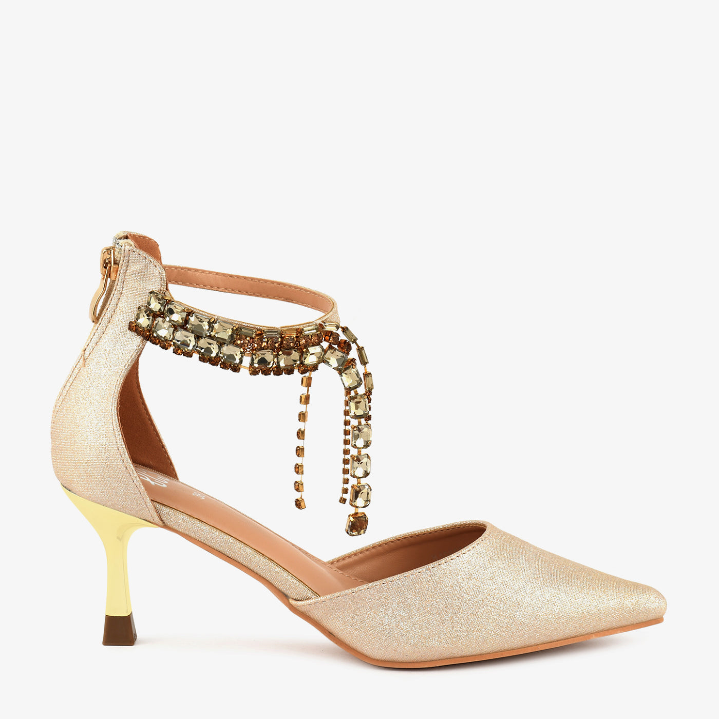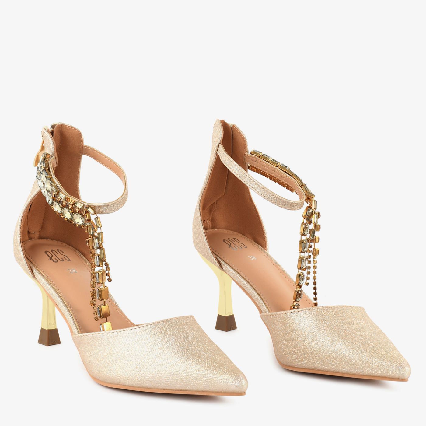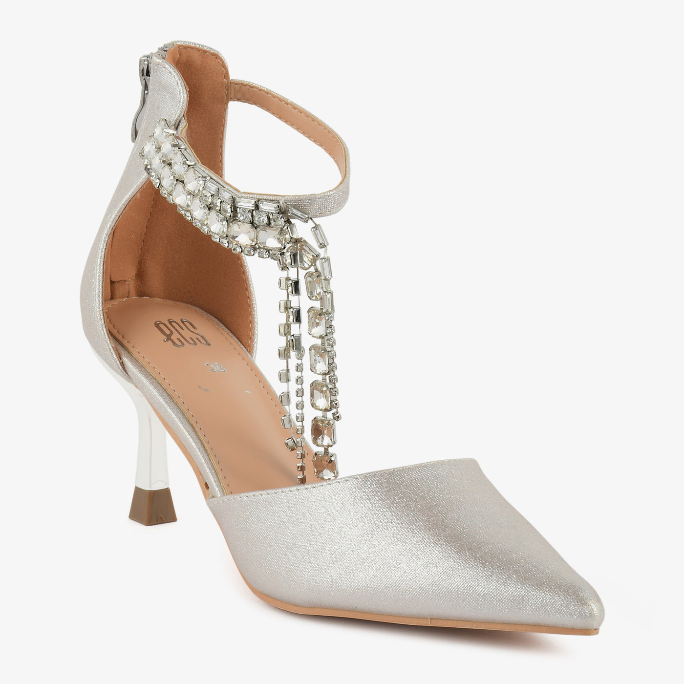 A glamorous pointed coat shoe designed to captivate at every step. Sparkling minimal chains add graceful movement and high-fashion charm. Lightweight padding ensures comfort while you shine all evening.