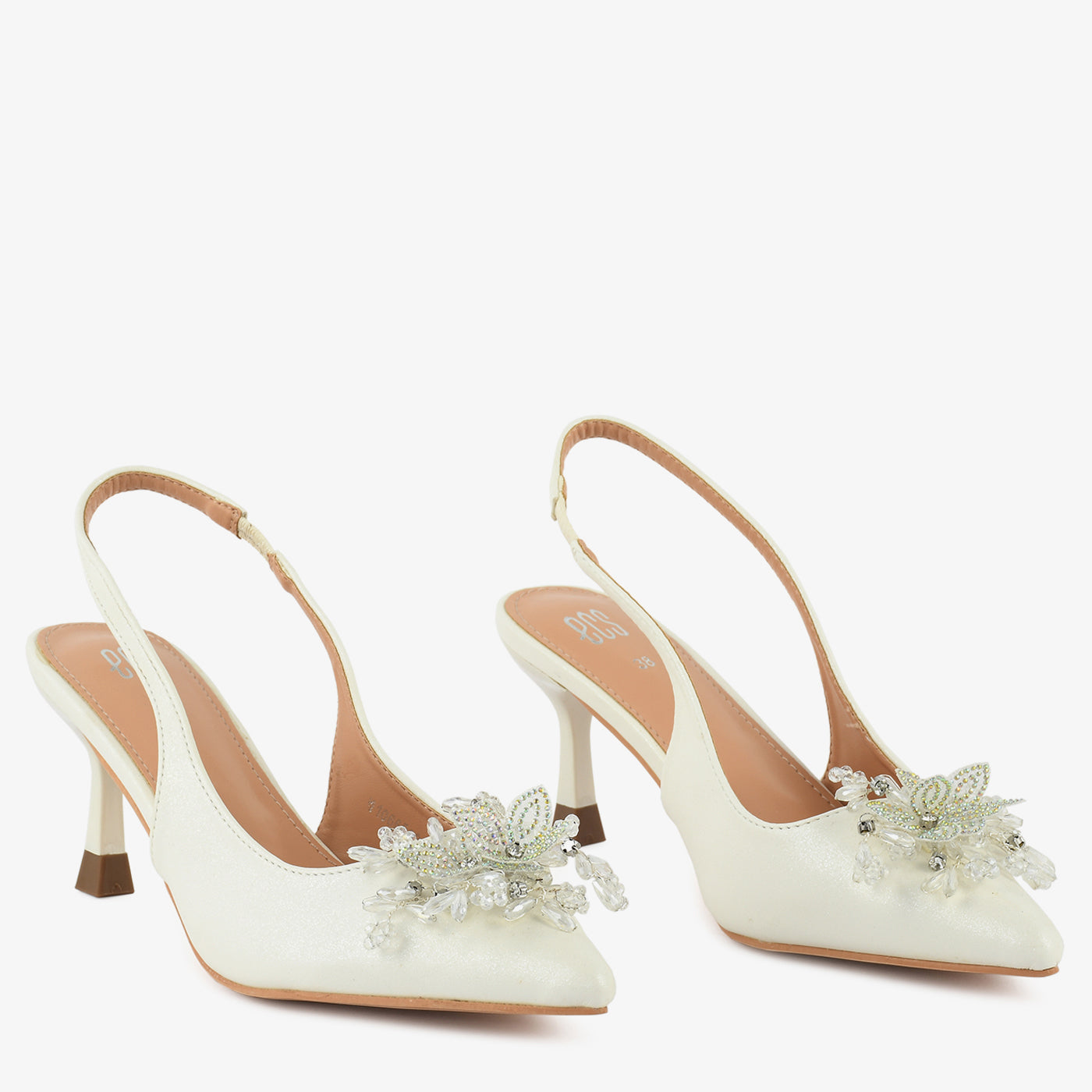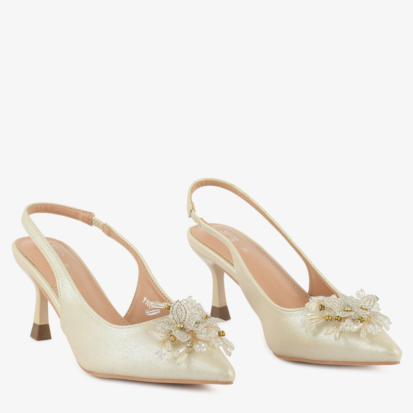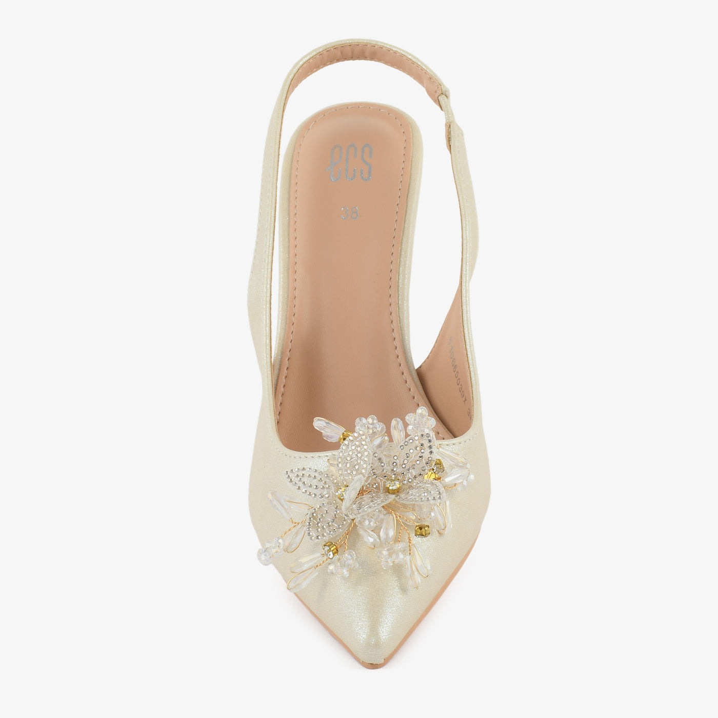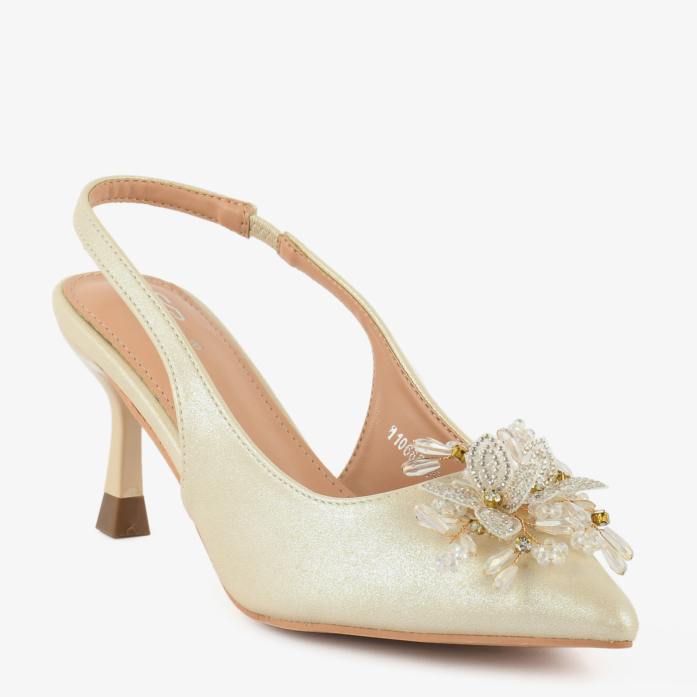 This graceful court shoe features intricate beaded embellishments on a sleek, shimmering base. Its elegant pointed toe and slingback design make it the perfect match for grand events or special celebrations. A true blend of comfort and elegance.
