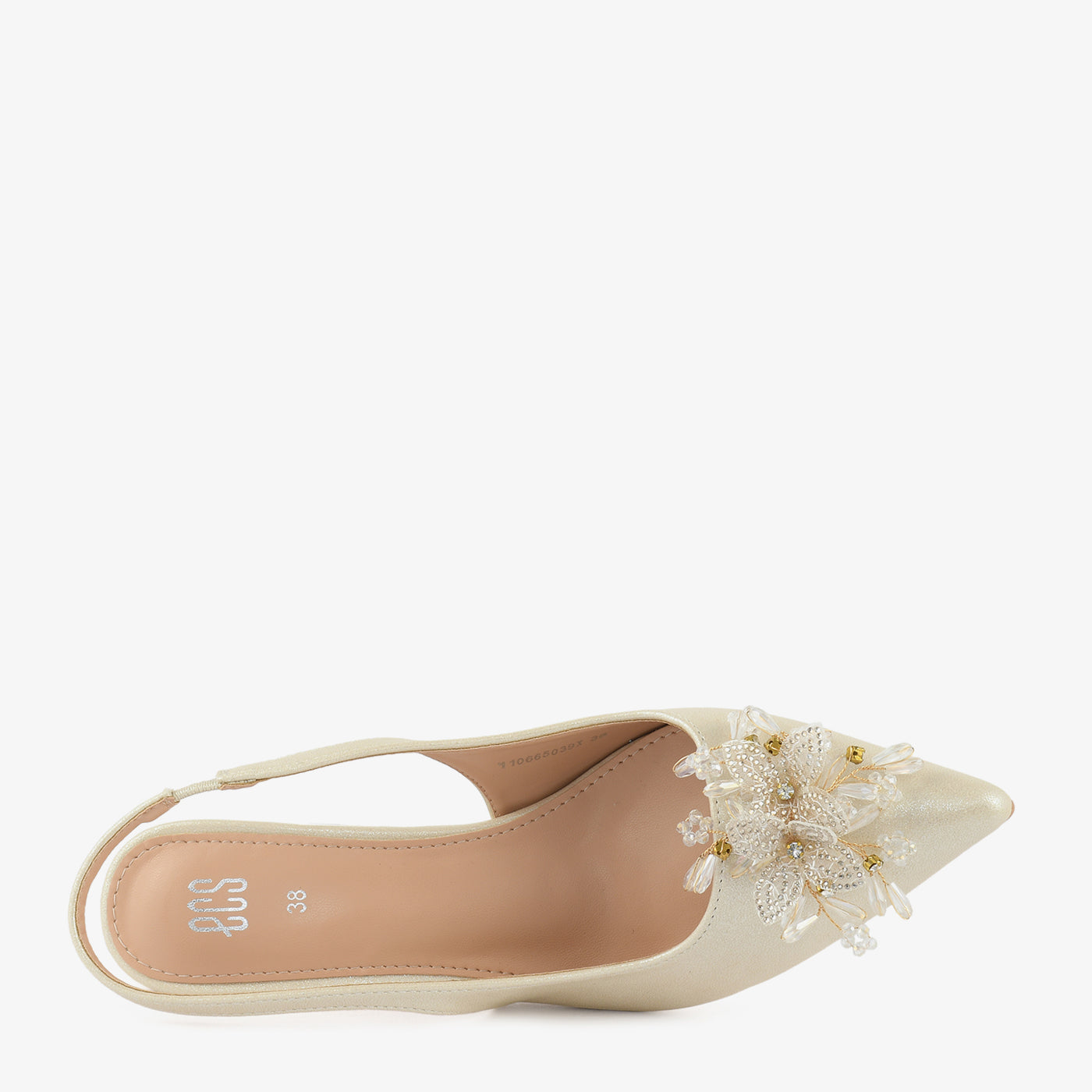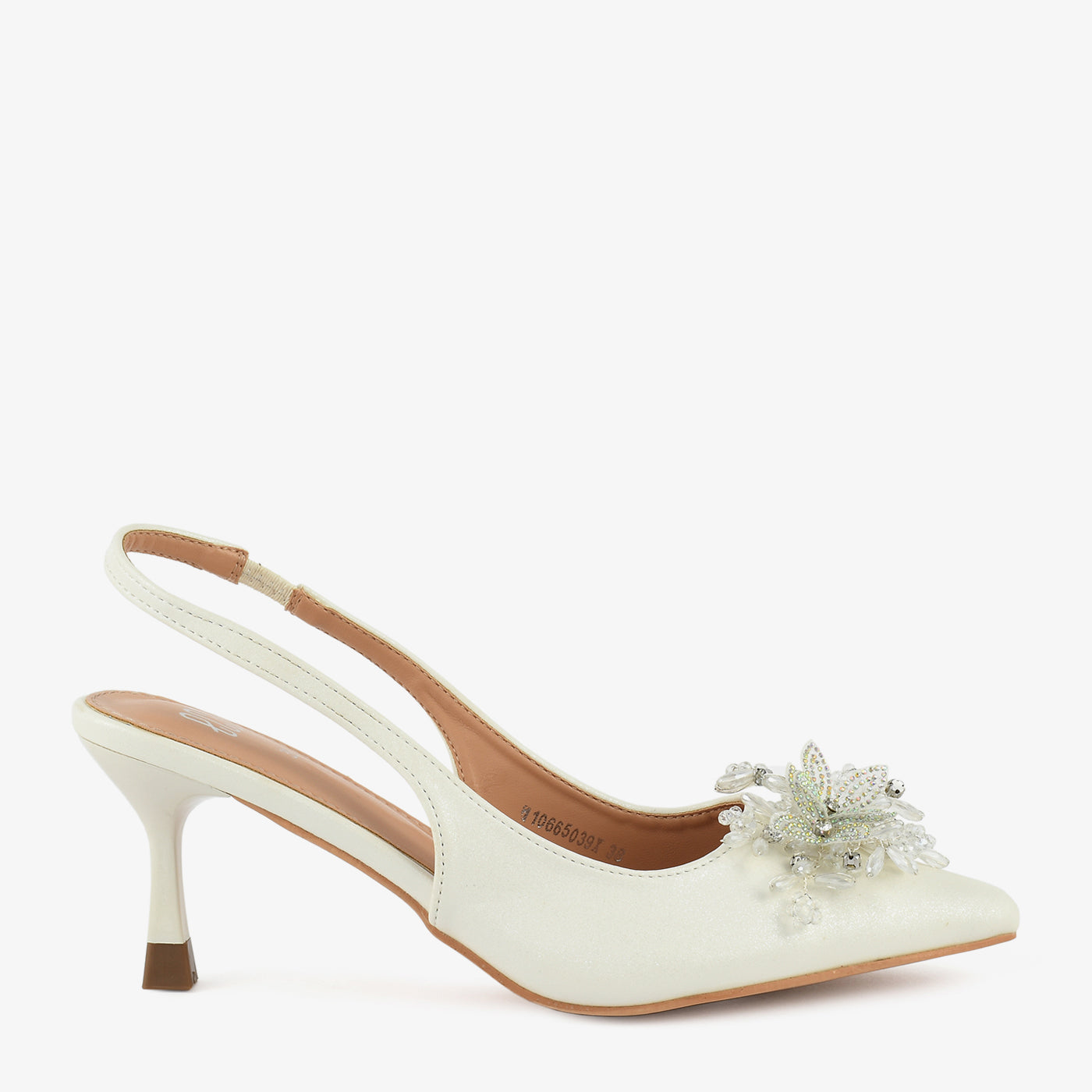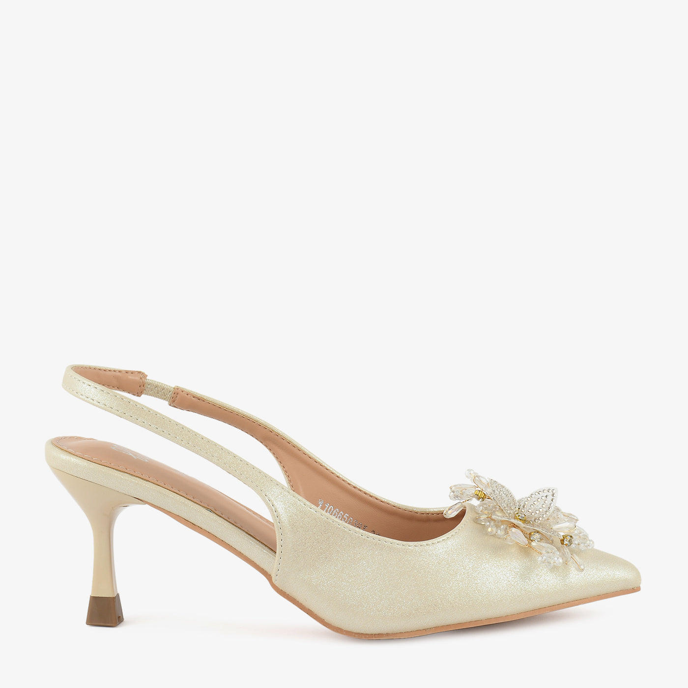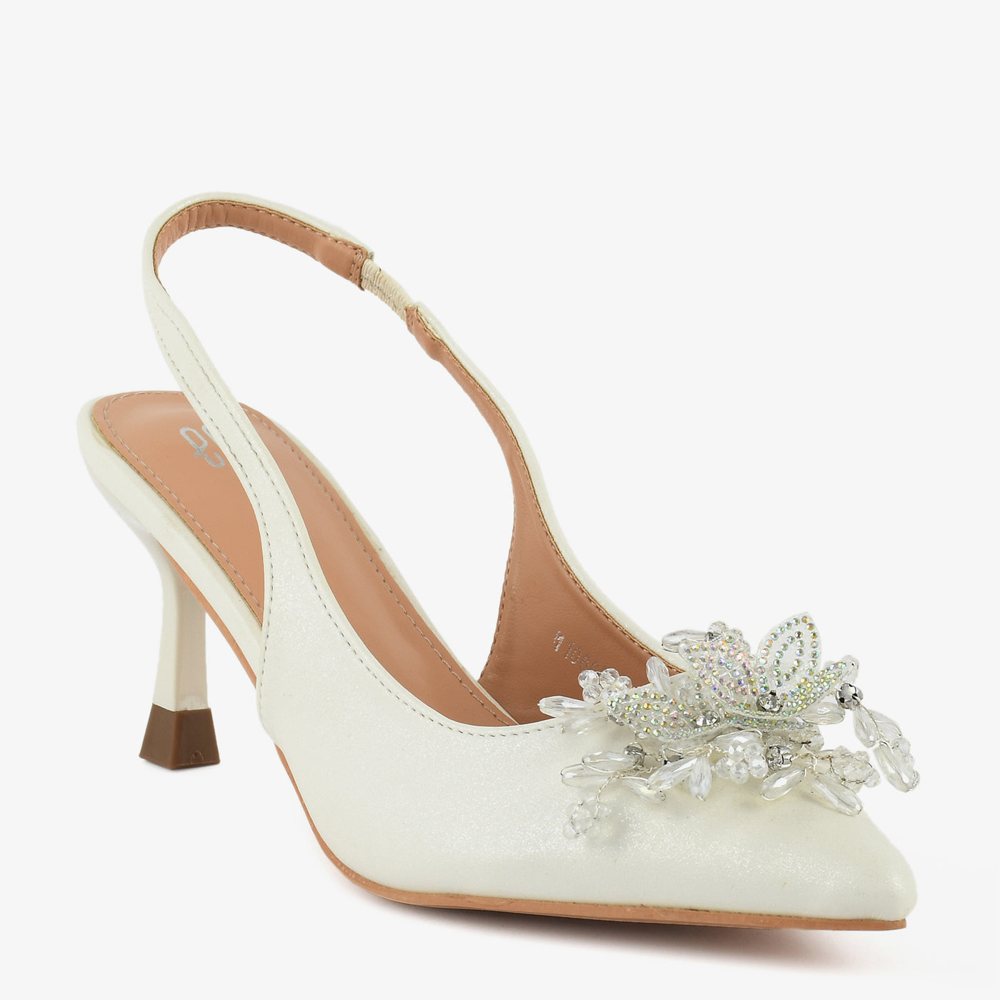 This graceful court shoe features intricate beaded embellishments on a sleek, shimmering base. Its elegant pointed toe and slingback design make it the perfect match for grand events or special celebrations. A true blend of comfort and elegance.