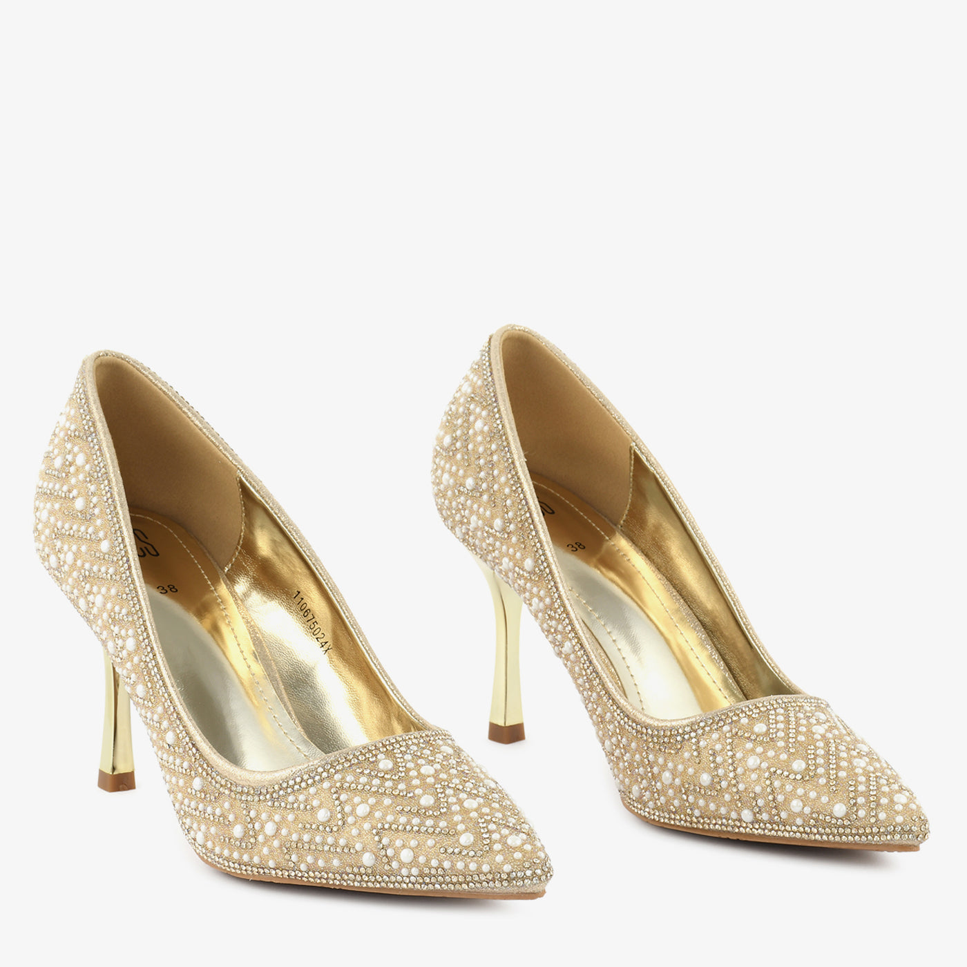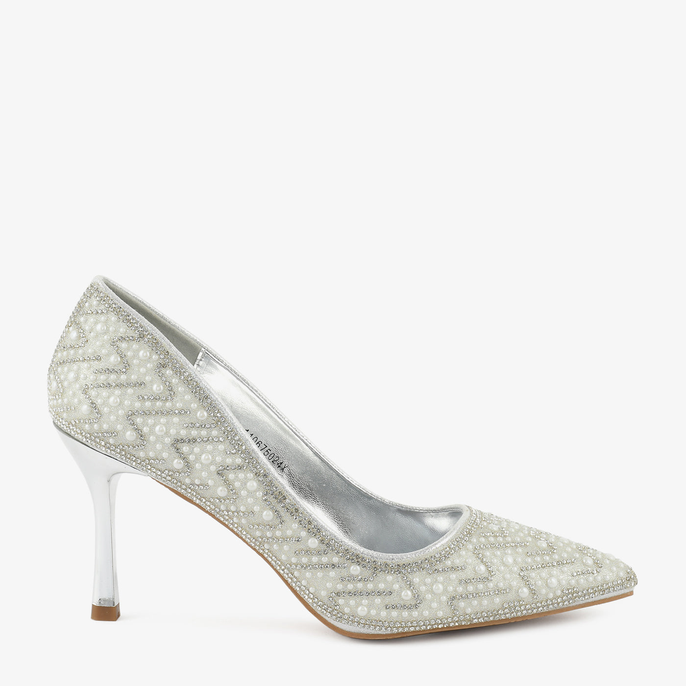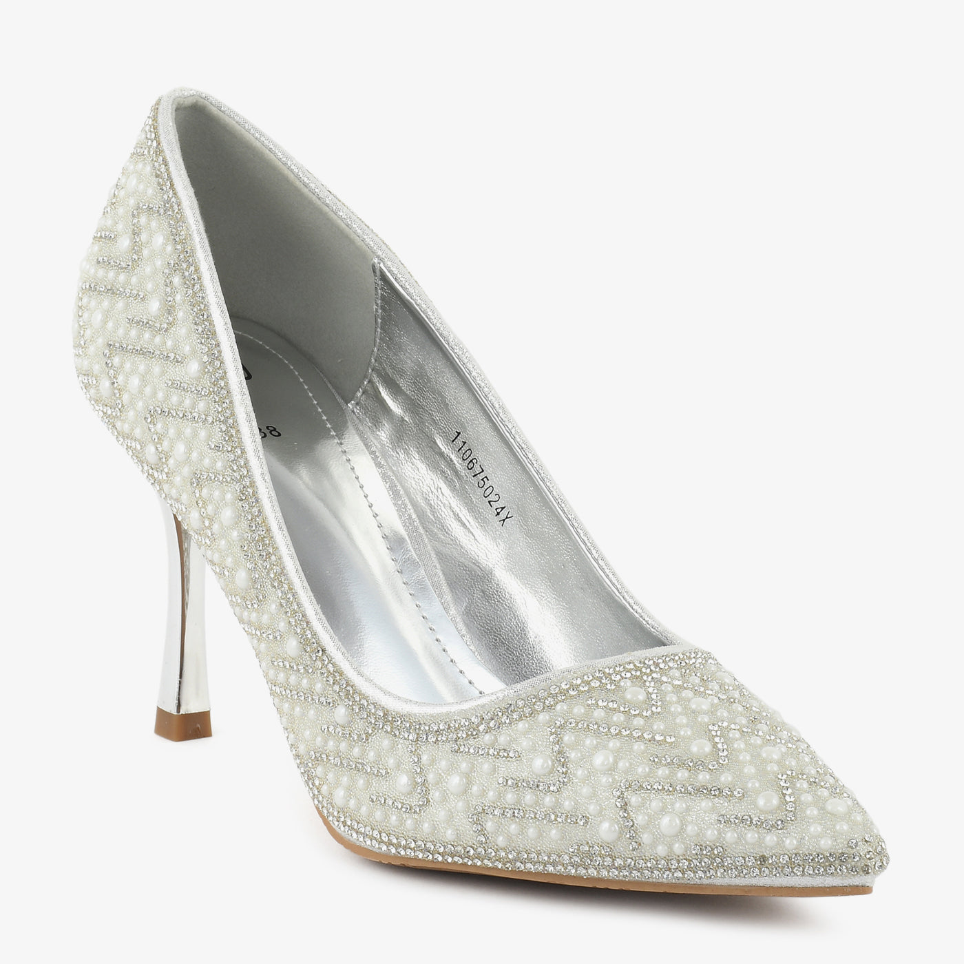This style features intricate pearl and stone embellishments arranged in elegant patterns. Its sharp front and sleek silhouette add to the overall grace, perfect for enhancing festive or...