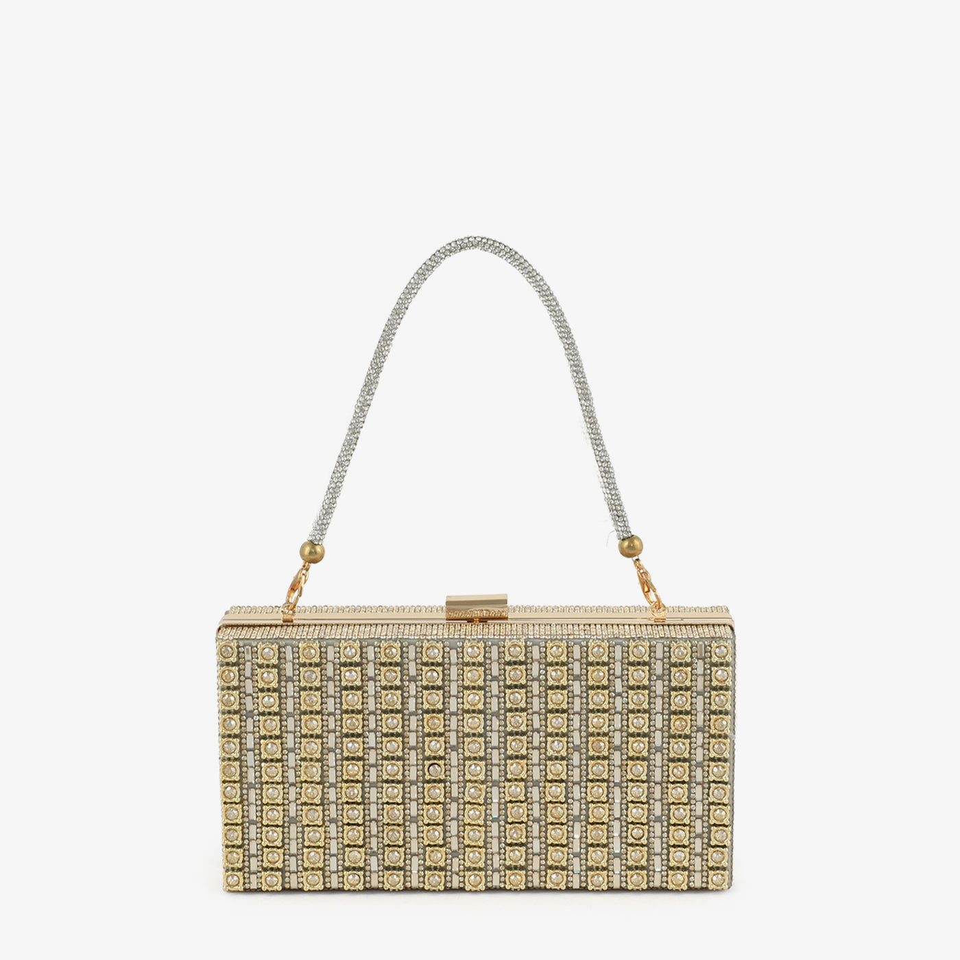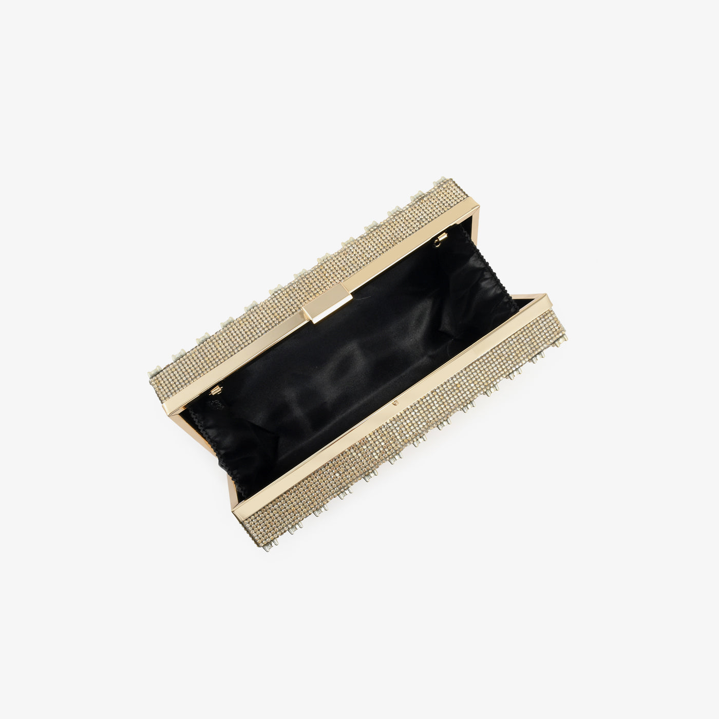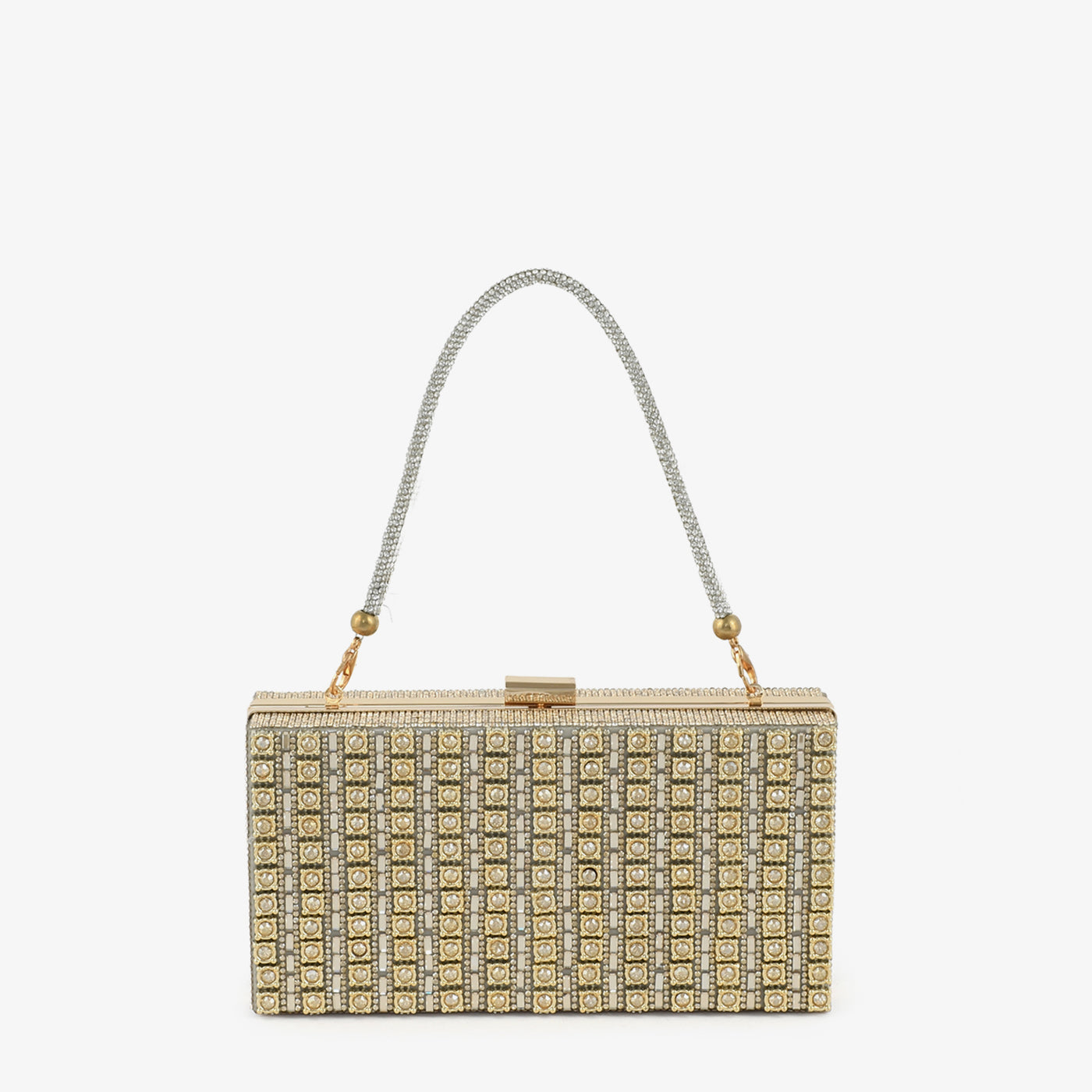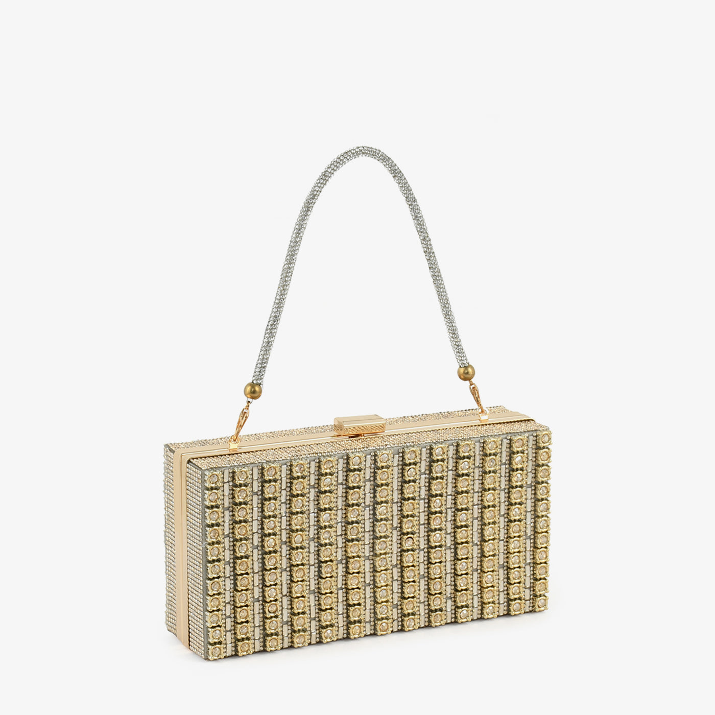 This rectangular bag is fully embellished with shimmering crystal details that catch the light at every angle. The structured body and metallic handle bring elegance and sophistication, making it a true statement piece.