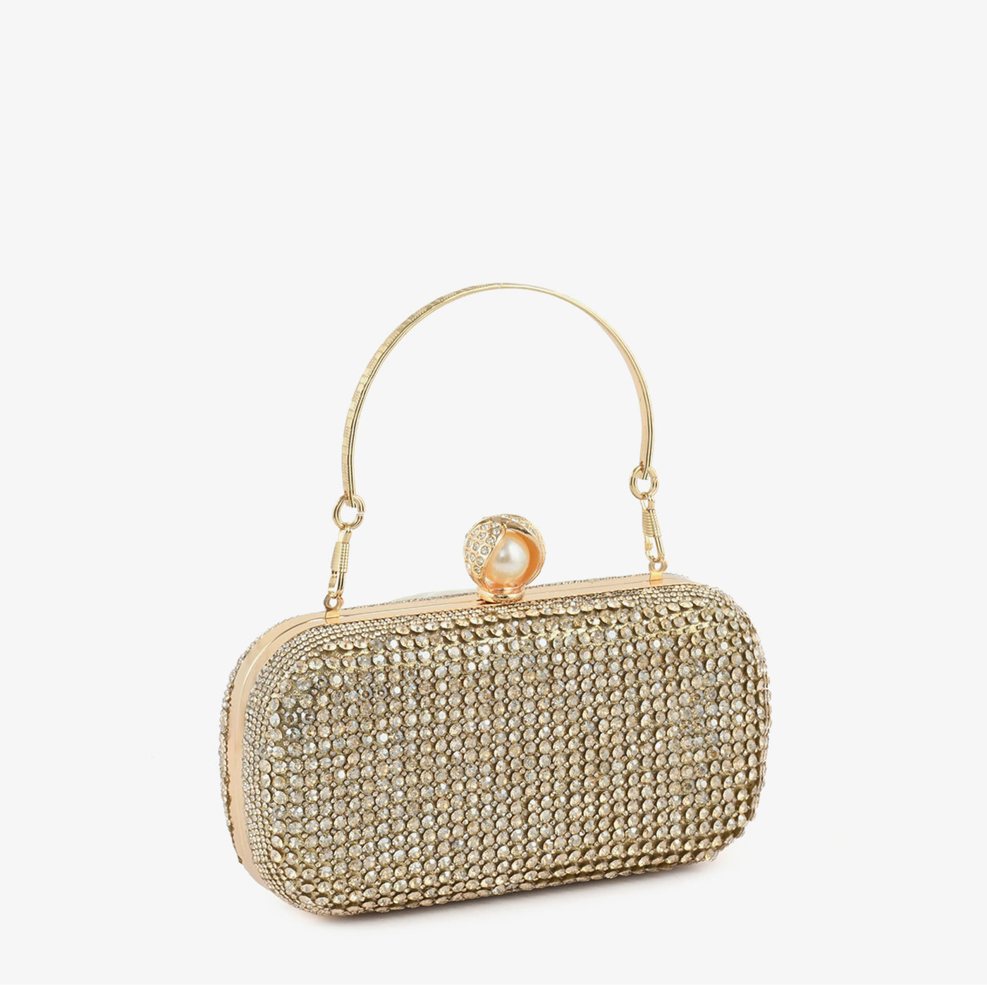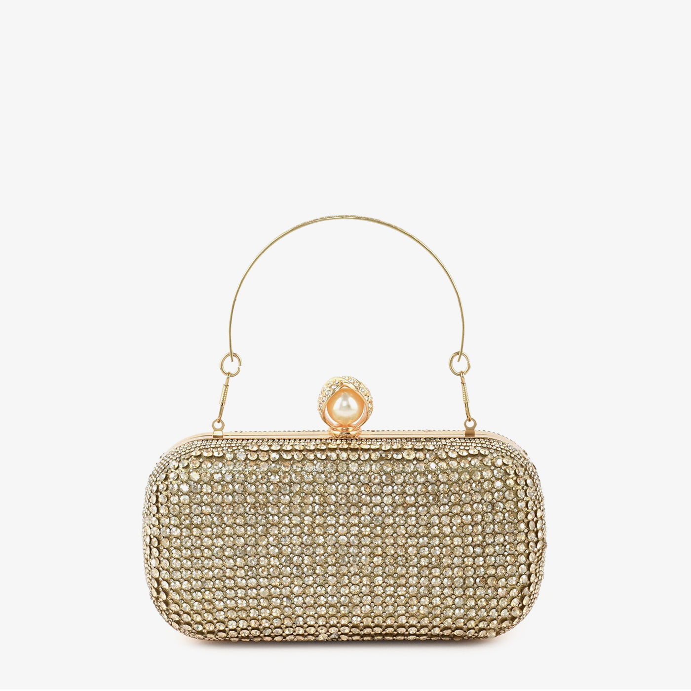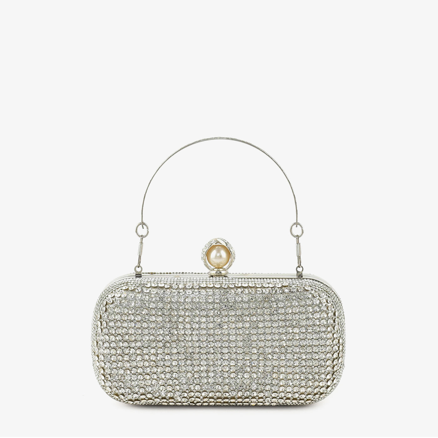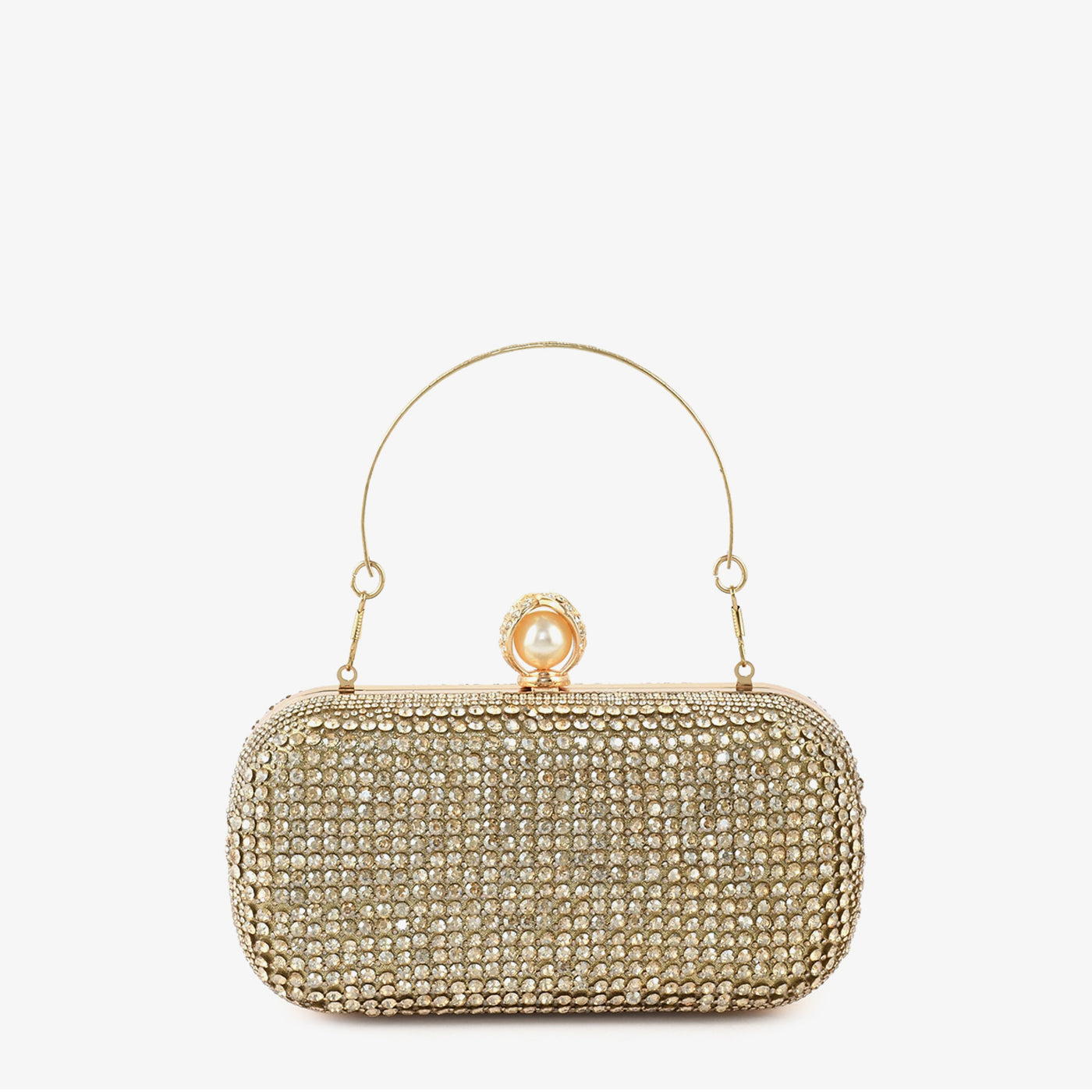 A structured box clutch fully covered in a dense all-over pavé setting of faceted round crystals across the entire surface, including the sides and base. The uniform crystal coverage gives this clutch a polished and luminous character suited for formal and festive occasions. A slim gold-tone wire top handle allows for easy hand carry throughout the event. A pearl and crystal ball-clasp closure at the top adds a refined accent to the overall design. The compact rounded rectangular form offers a sleek and elegant silhouette for carrying essentials. This clutch suits formal gatherings, festive events, and bridal occasions with a polished finish.