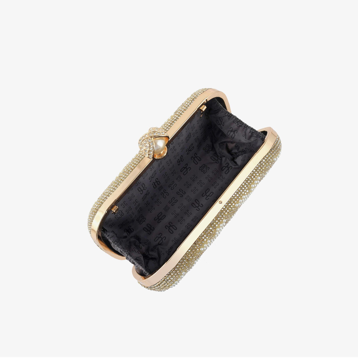 • Material: Fabric base with full pavé crystal embellishment, gold-tone wire handle, and pearl ball-clasp closure
