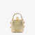 - Material: Textured synthetic exterior with embellished fabric panel and metal handle