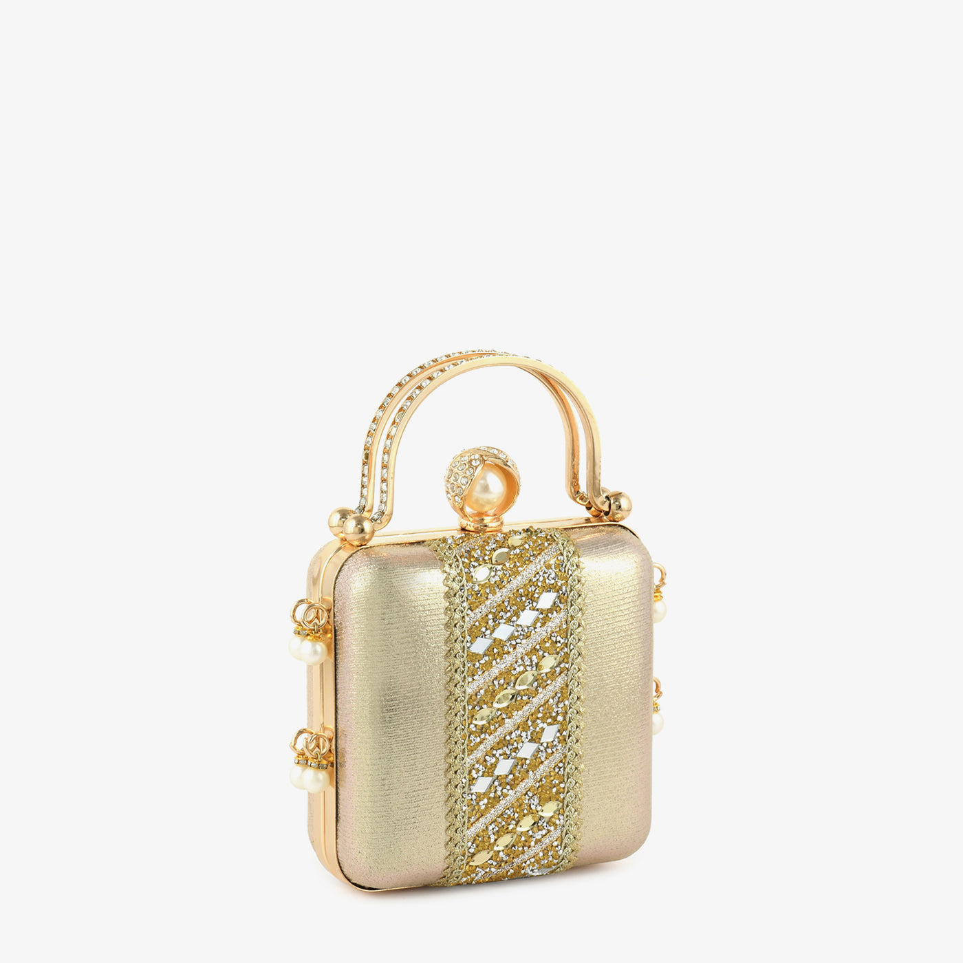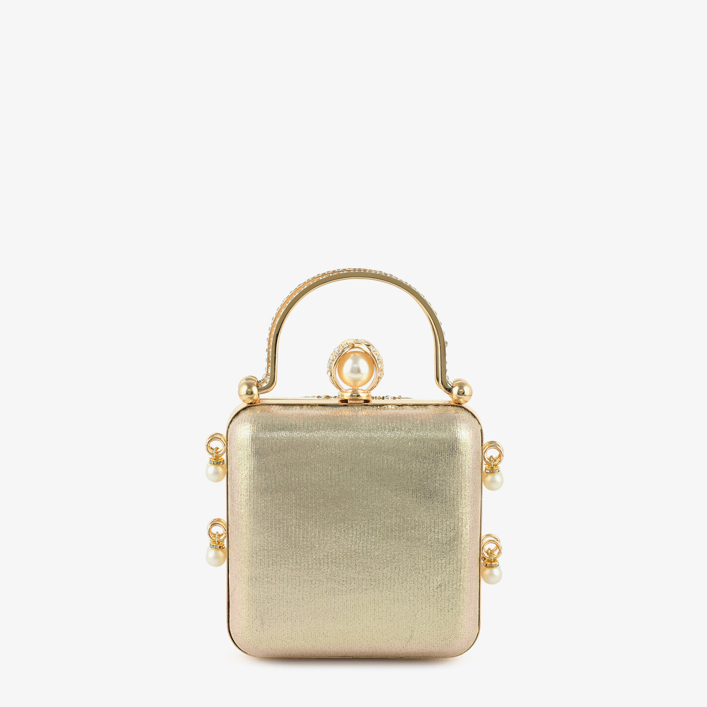 - Design: Structured box clutch with top handle, pearl accents, and decorative front panel
