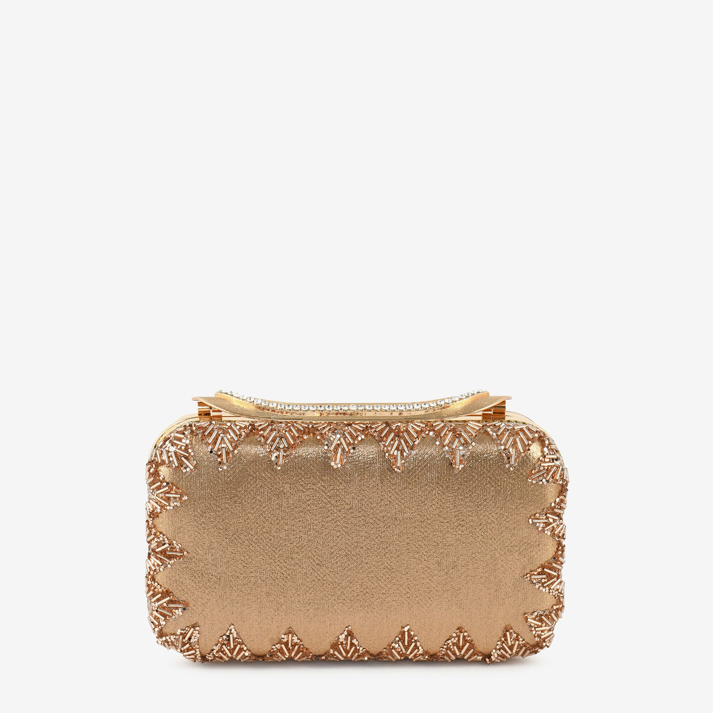 - Design: Structured box clutch with decorative borders and crystal clasp