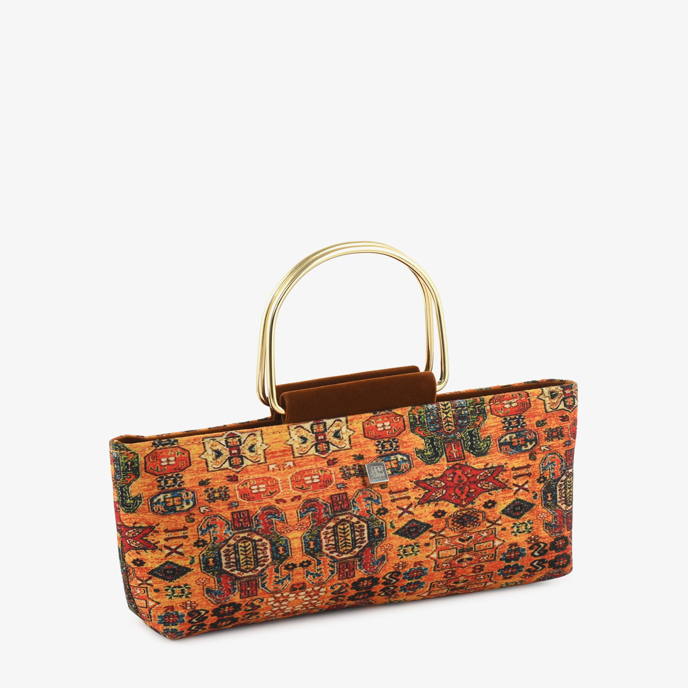 This elegant clutch is designed with a richly patterned fabric that brings a traditional and artistic feel. The structured body offers a refined shape that holds essentials neatly. Its firm base helps maintain form while carrying. The sturdy handle adds ease and balance during use. Lightweight construction makes it comfortable to carry for longer hours. Ideal for festive gatherings and cultural occasions.