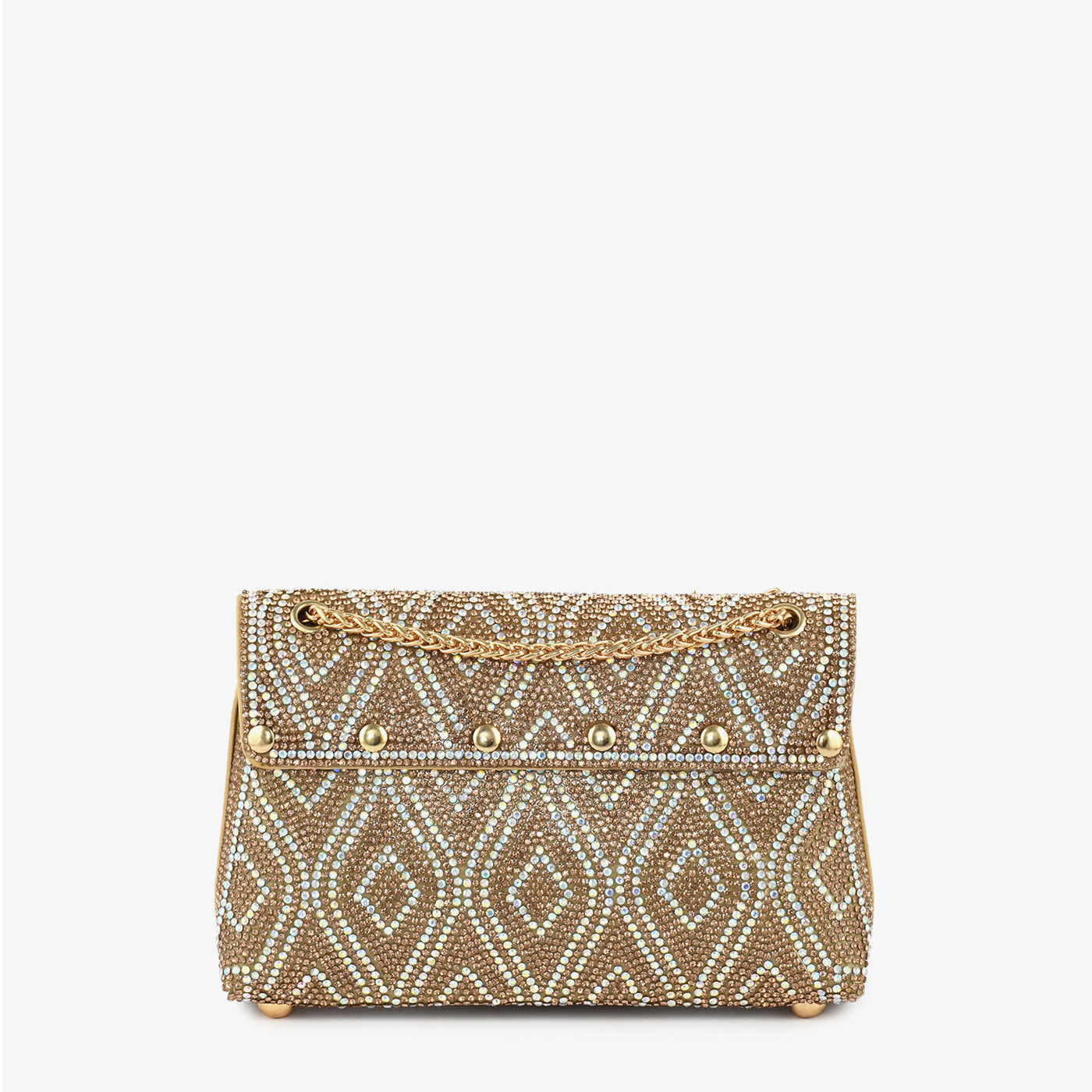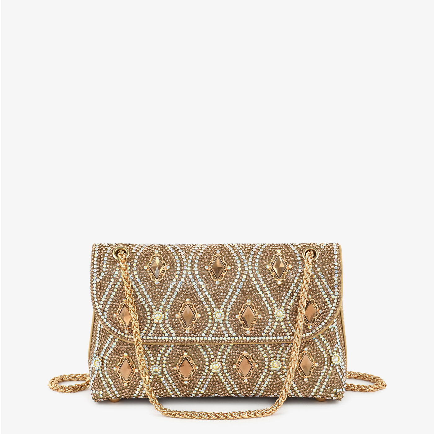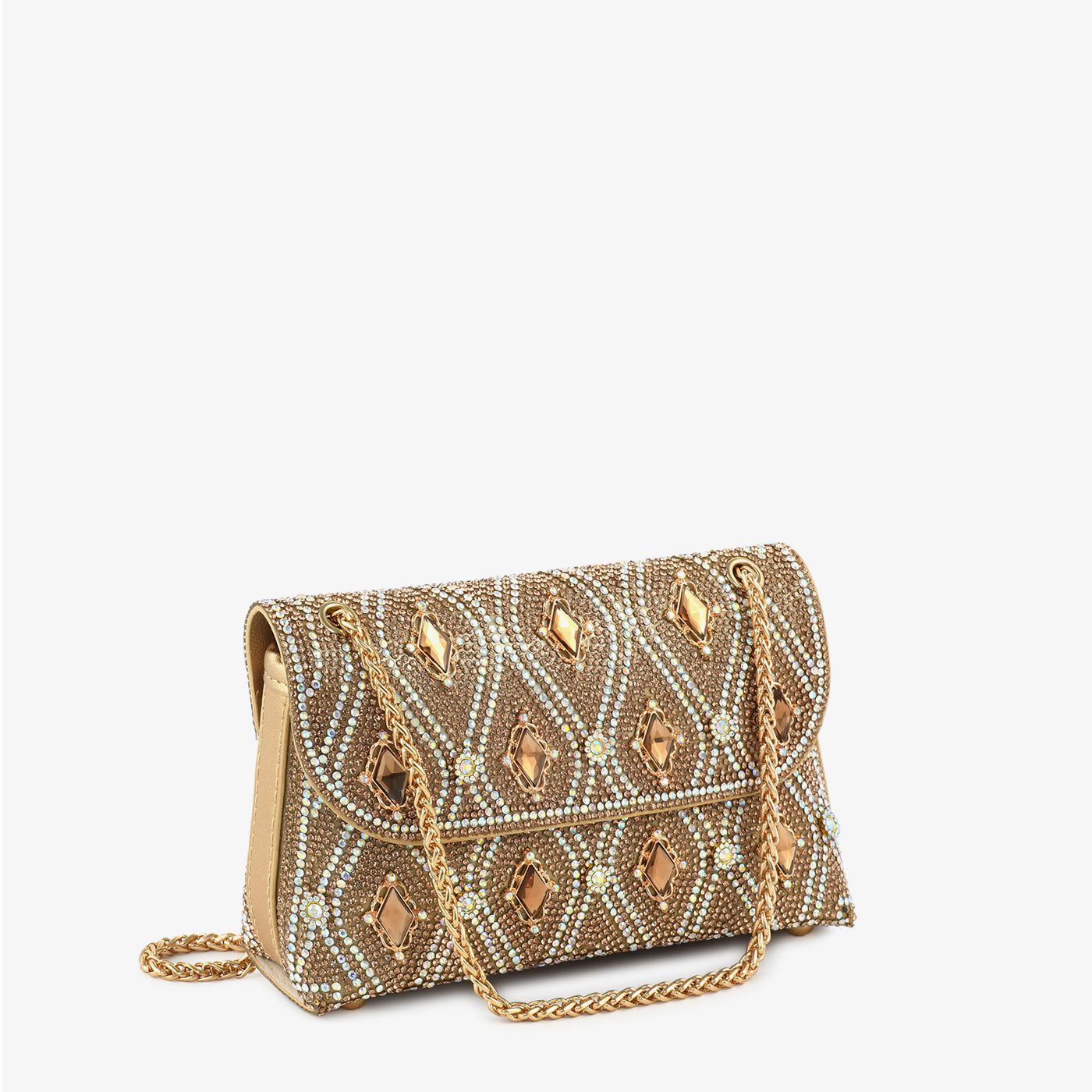 An elegant clutch designed with intricate beadwork and gemstone accents. The gold-tone chain adds a hint of sophistication while offering easy carry options. Ideal for weddings, parties, and formal events.