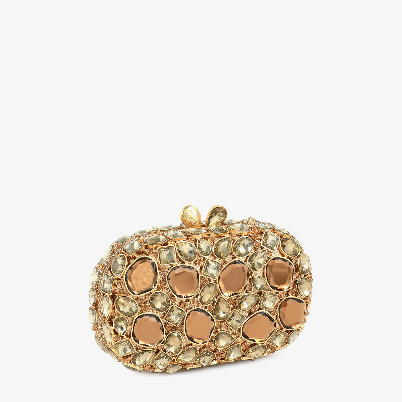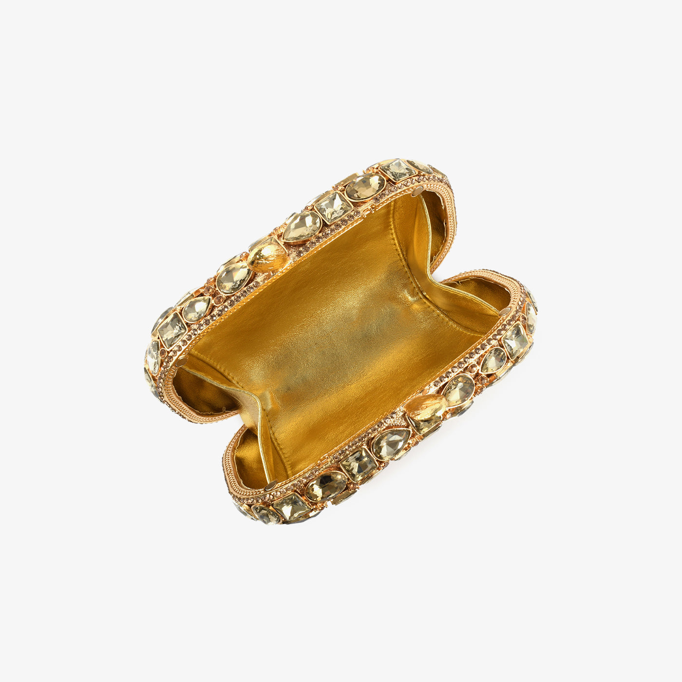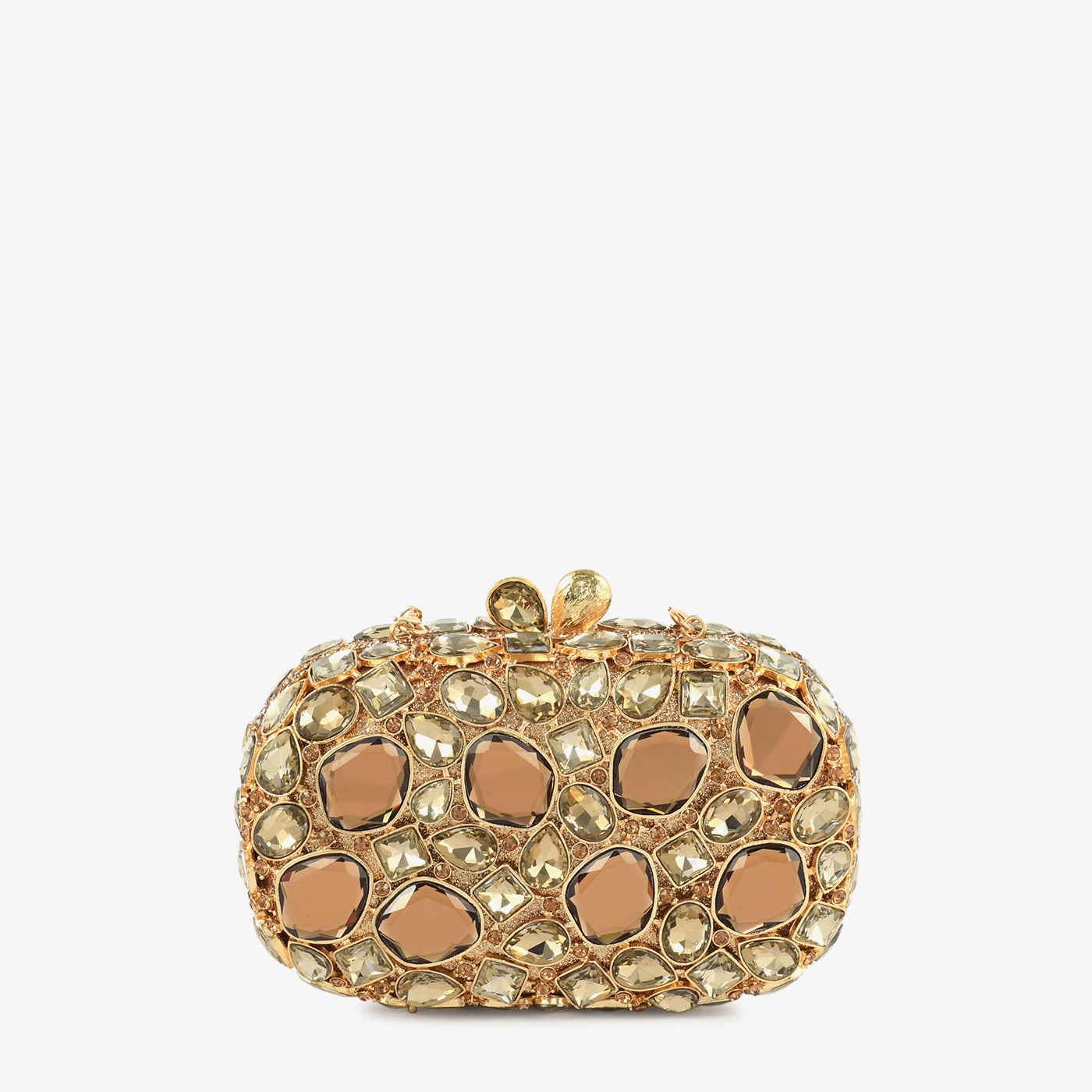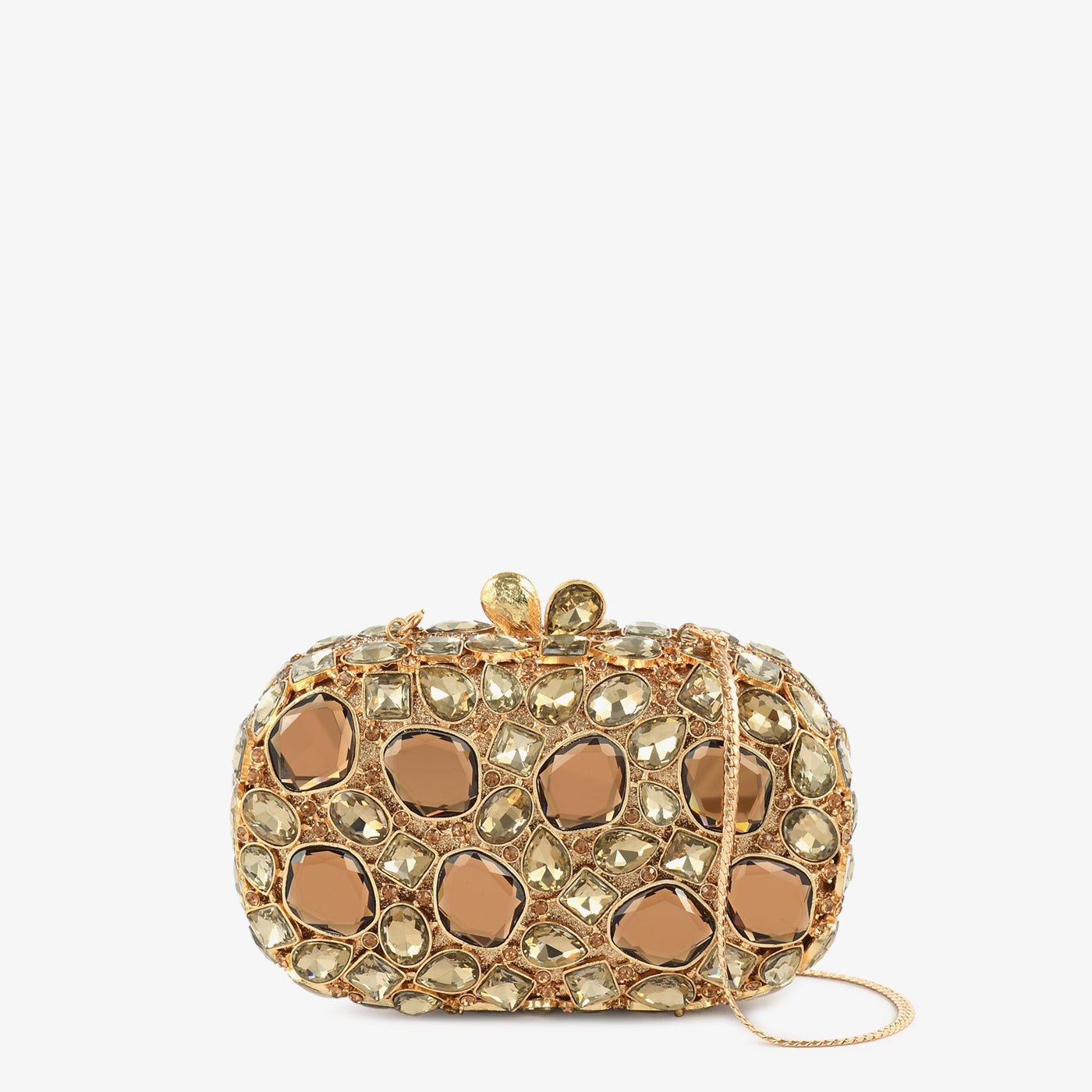 A statement clutch designed with multi-shaped crystal stones arranged in a rich mosaic pattern. The structured body offers a luxe feel while maintaining a compact and elegant silhouette. Ideal for weddings and formal evenings, it adds instant glamour without overpowering your outfit. A secure clasp keeps essentials safe throughout the event.