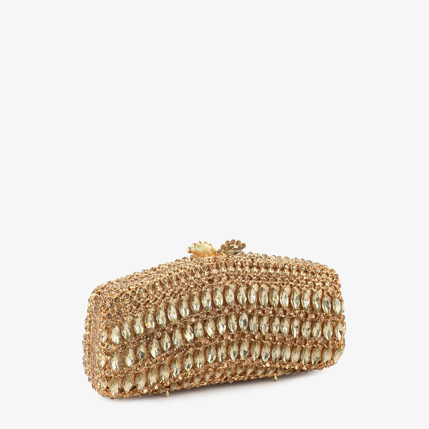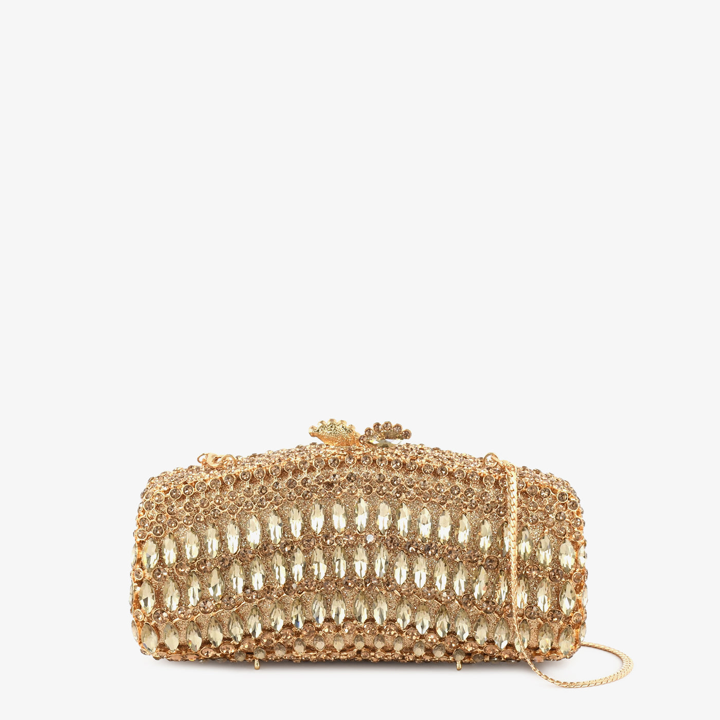 This clutch features horizontal rows of elongated stones that create a clean yet luxurious look. The layered arrangement adds texture while keeping the design sleek and modern. Ideal for both formal and semi-formal occasions.