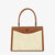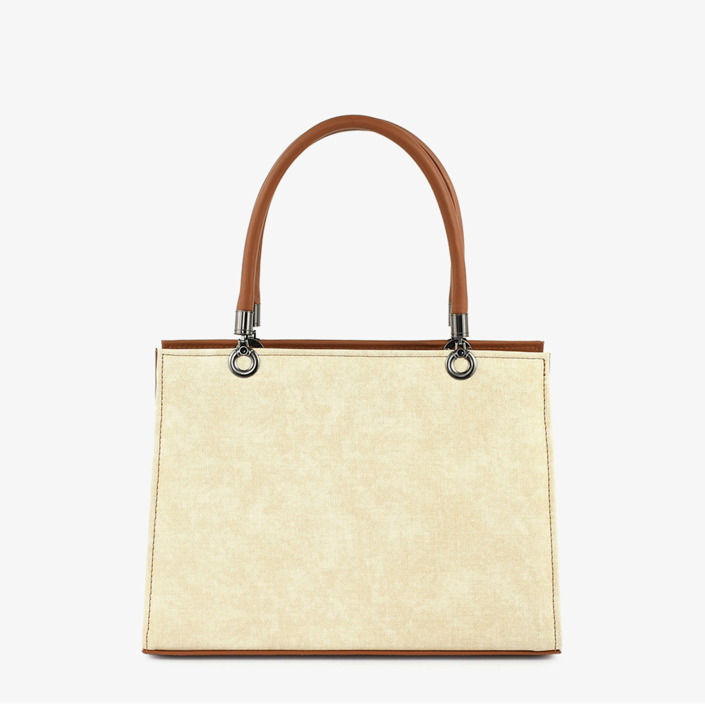 A structured women's top-handle bag crafted from a mixed-material upper combining a smooth faux PU frame panel at the top and sides with a large canvas centre panel on the...