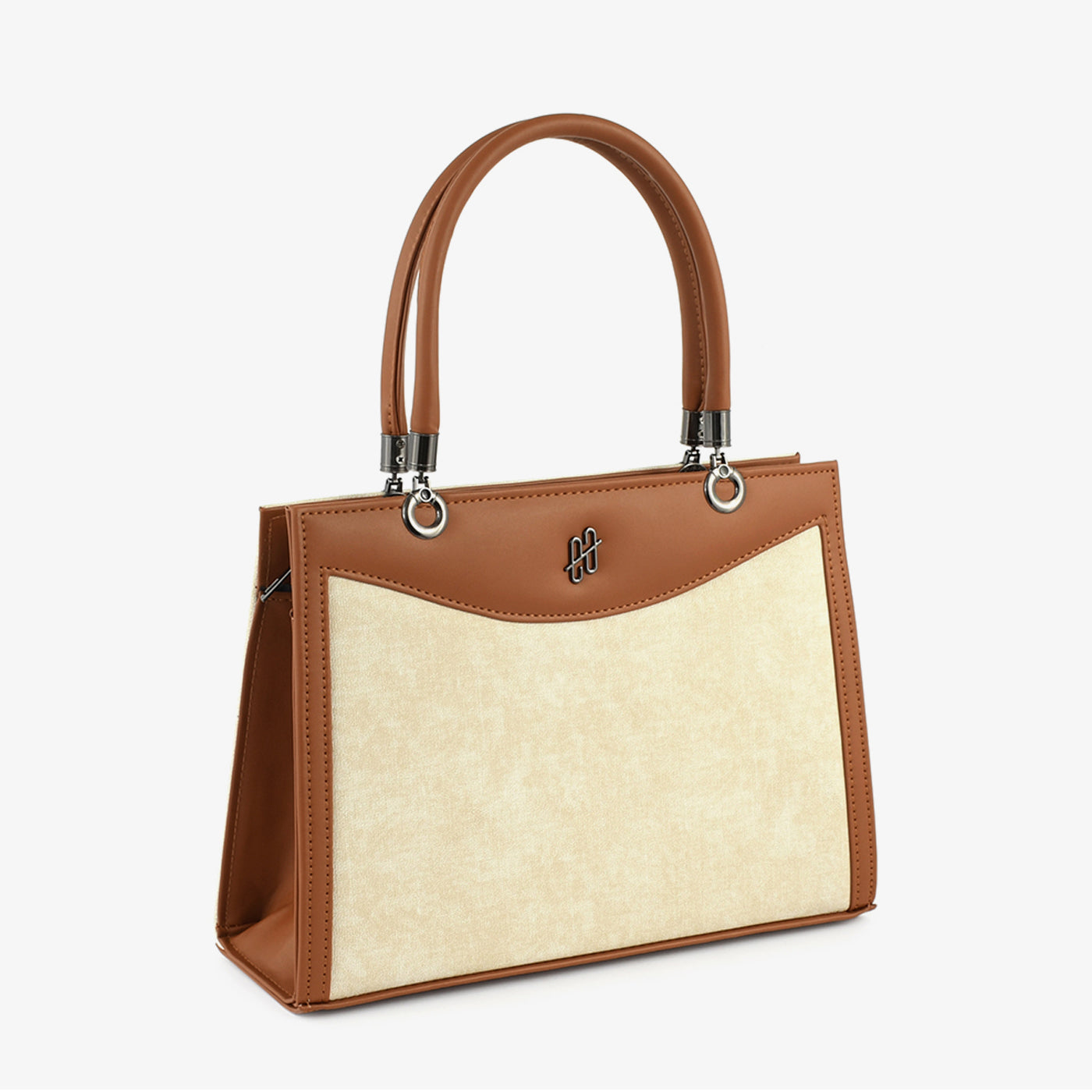 • Design: Structured women's top-handle bag with two-tone faux PU and canvas blocked construction, scalloped panel seam, and gunmetal hardware