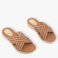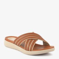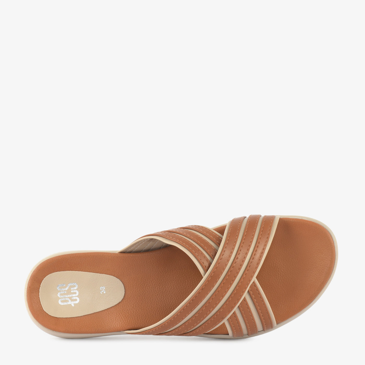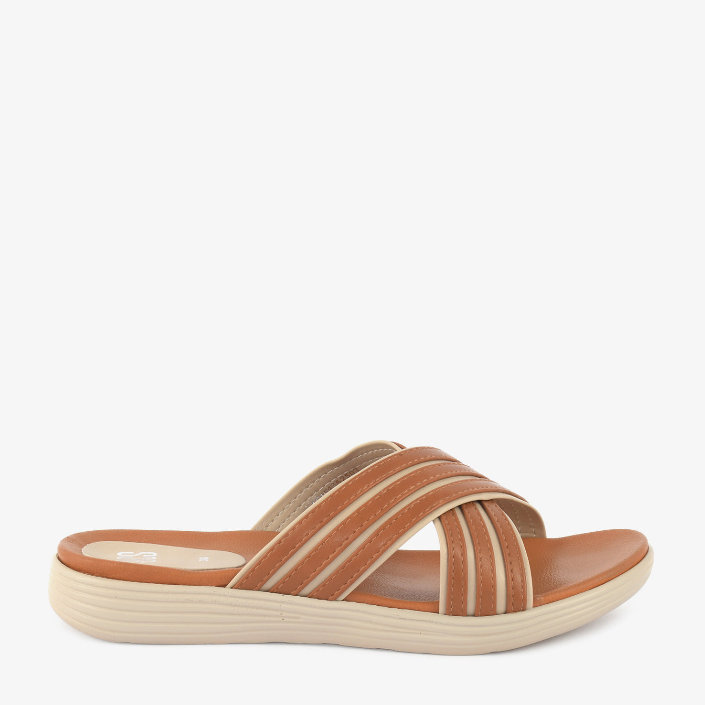 Add a touch of casual sophistication to your look with these Two-Tone Cross Slides. Featuring a stylish cross-strap design in contrasting tones, these slides offer a versatile and eye-catching appeal. The low wedge heel provides comfortable lift for everyday wear.