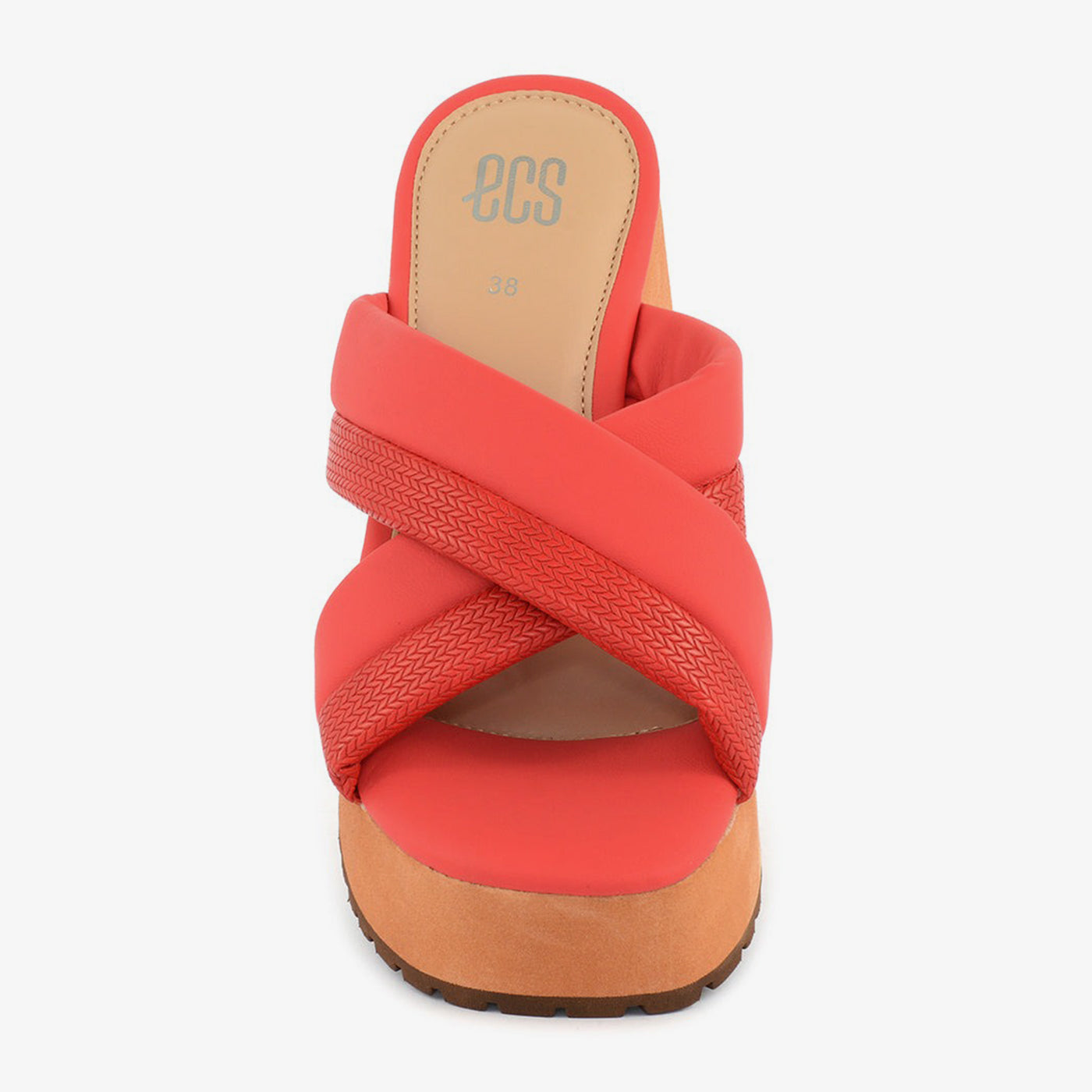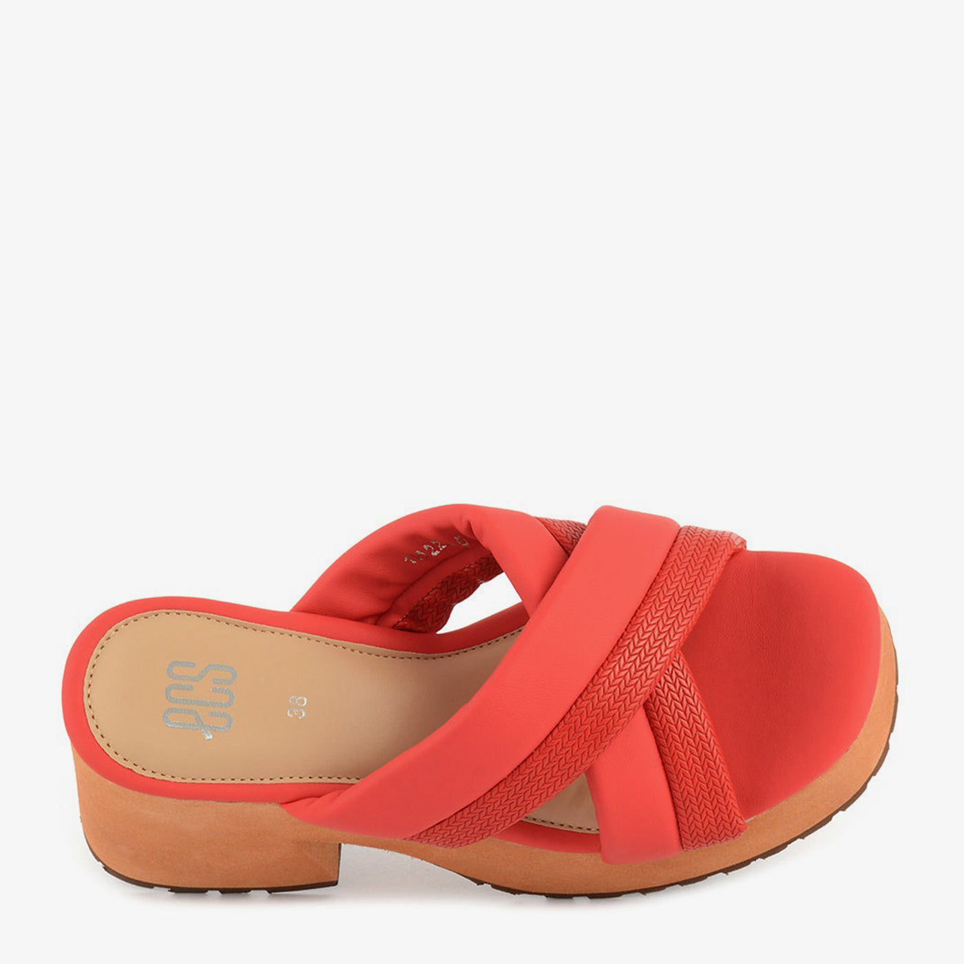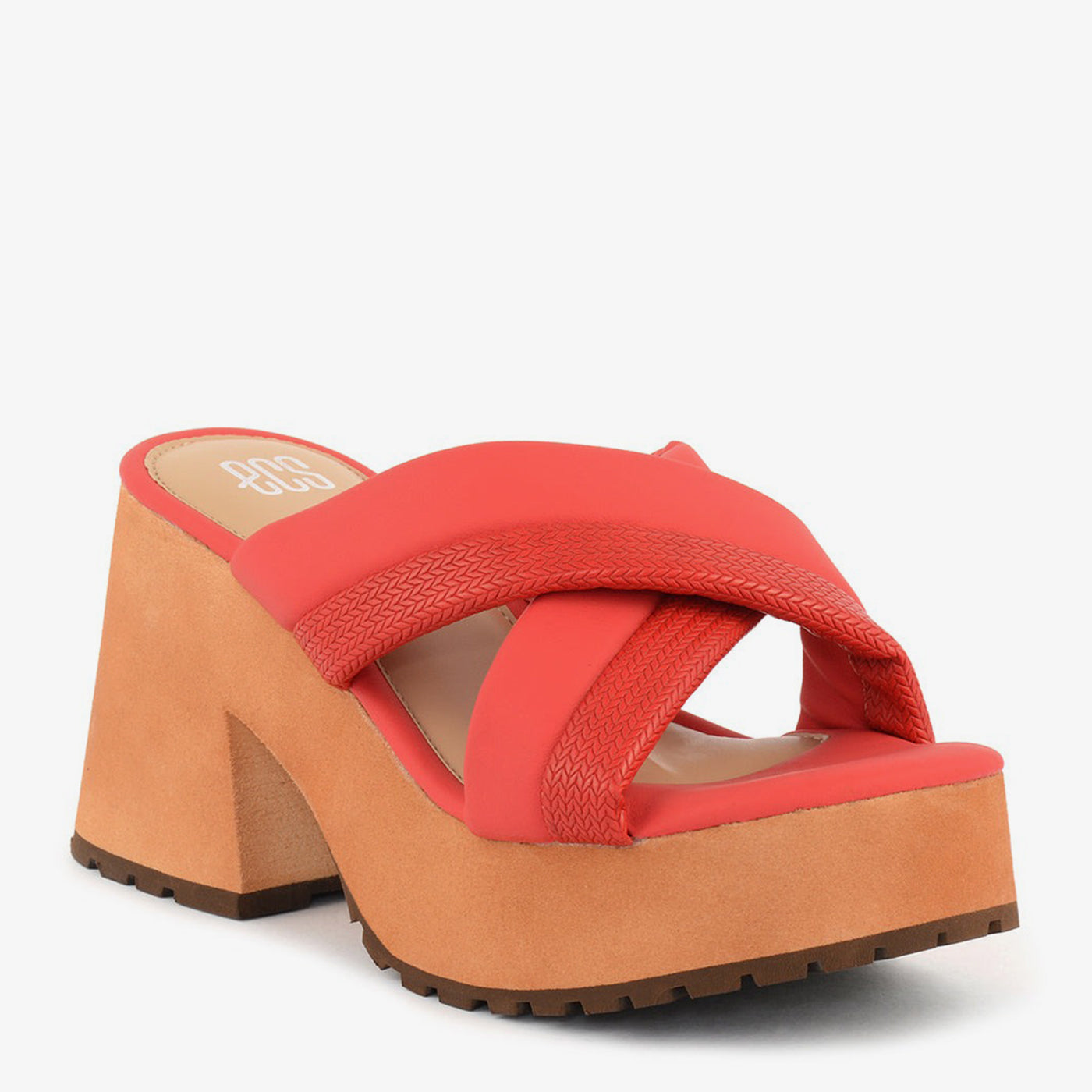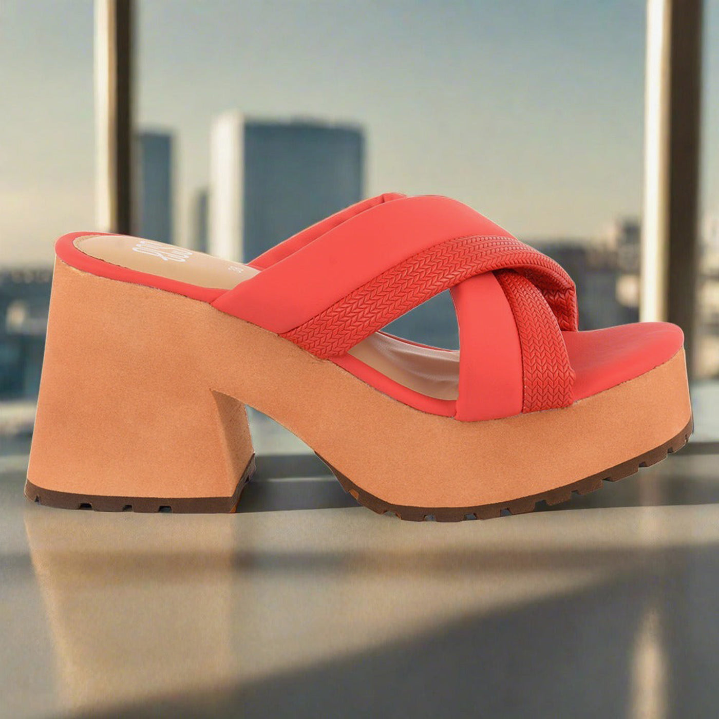 A modern block heel slipper with crossover padded straps for a bold and supportive fit. The raised heel and textured outsole provide elevation without losing comfort.