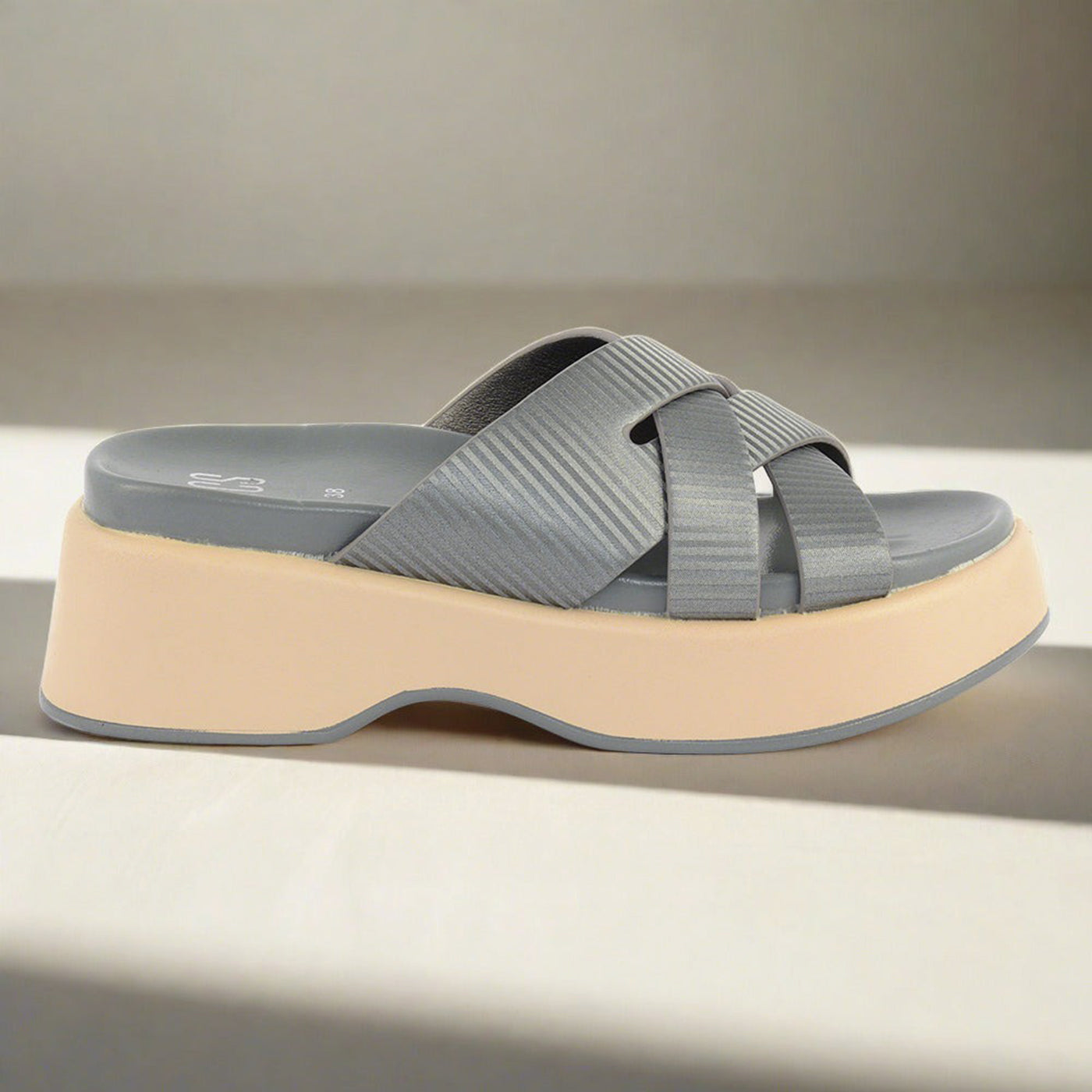 A trendy platform slipper featuring twisted crossover straps and a cushioned sole. The striped finish adds a subtle play of texture and shine for statement casual wear.