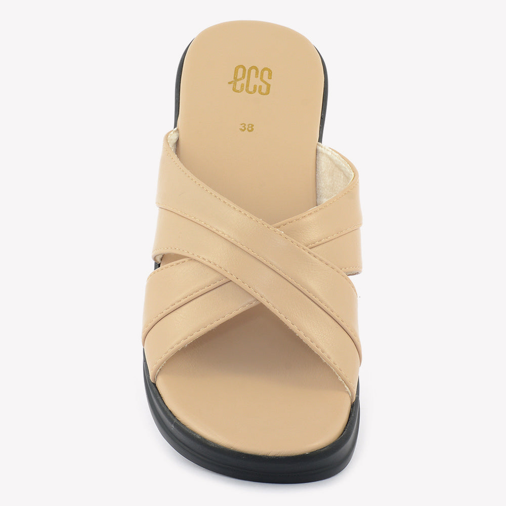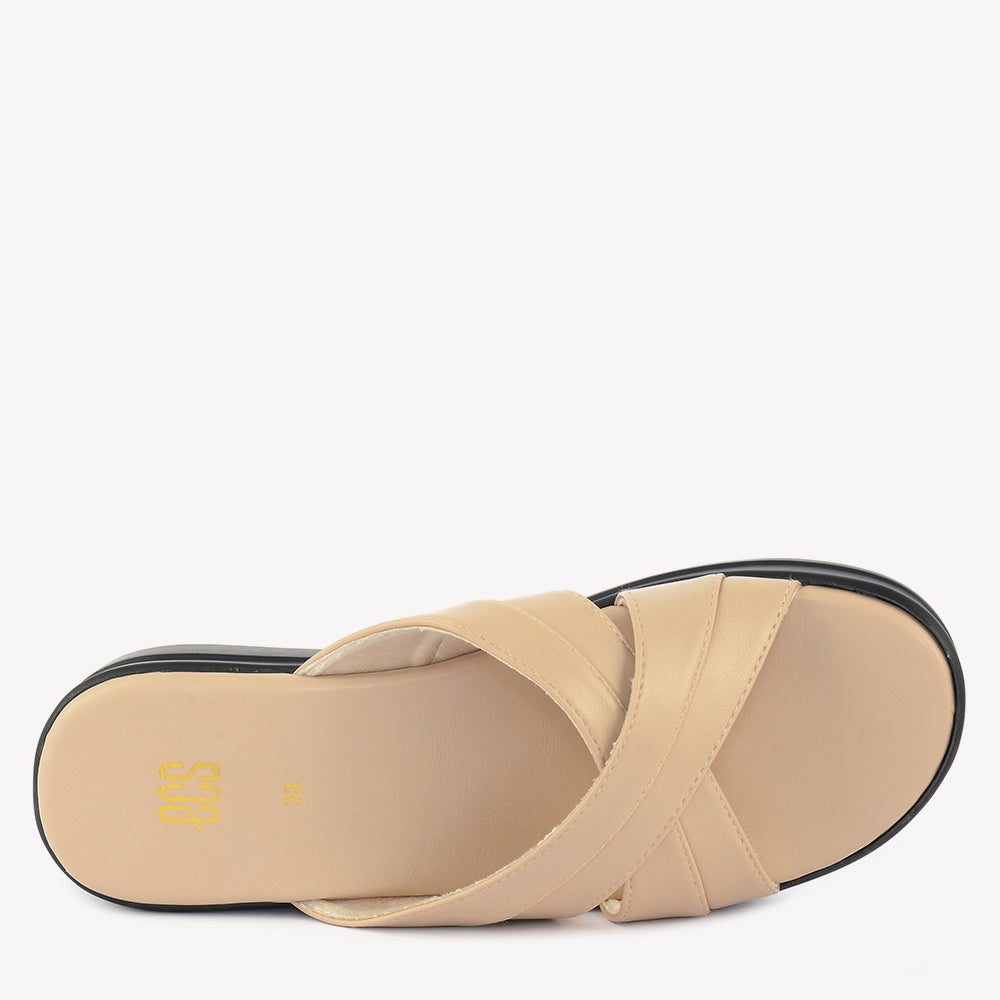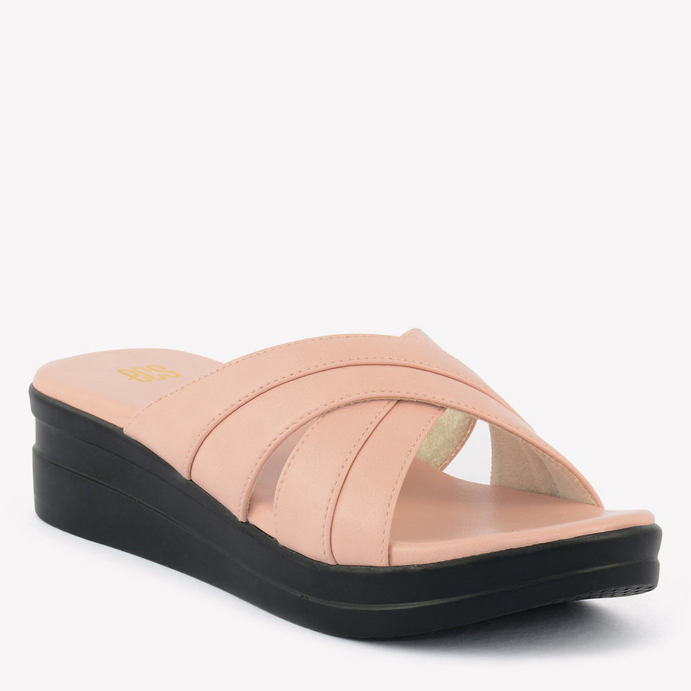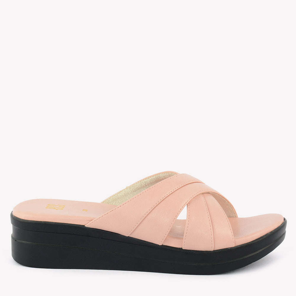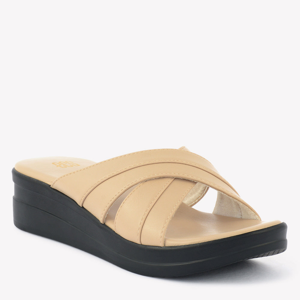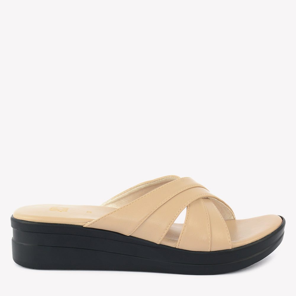 A comfortable wedge slipper with an open toe. It features wide, overlapping straps that create a crisscross design across the foot. Perfect for a relaxed evening in Lahore.