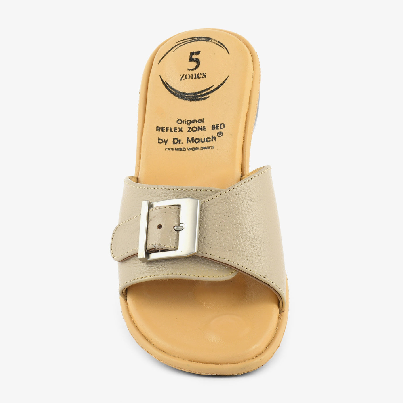 Blending elegance with comfort, this medicated/orthocare slide features a stylish buckle accent and orthopedic cushioning. Built on the 5-zone reflex sole, it promotes better circulation and reduces foot strain. Ideal for anyone seeking relief in every step, with all-day wearability and classic sophistication.