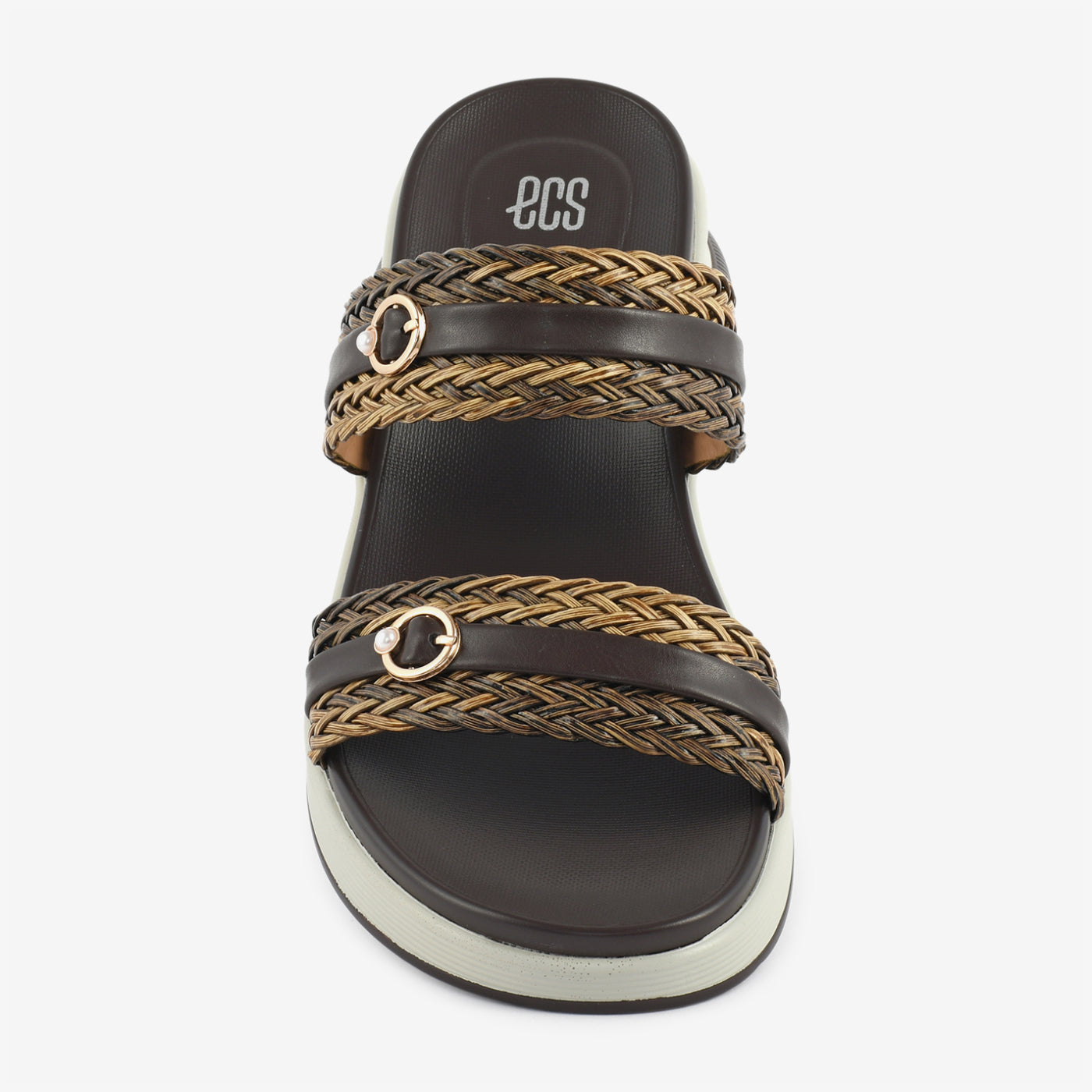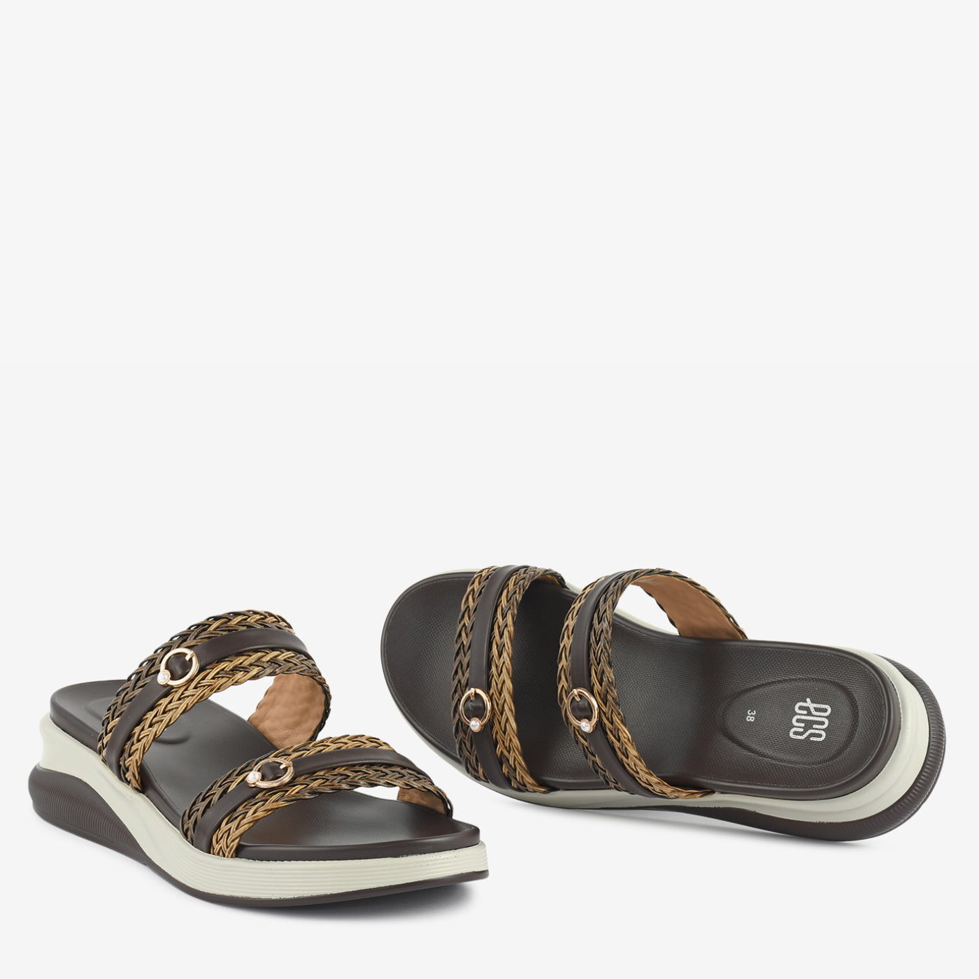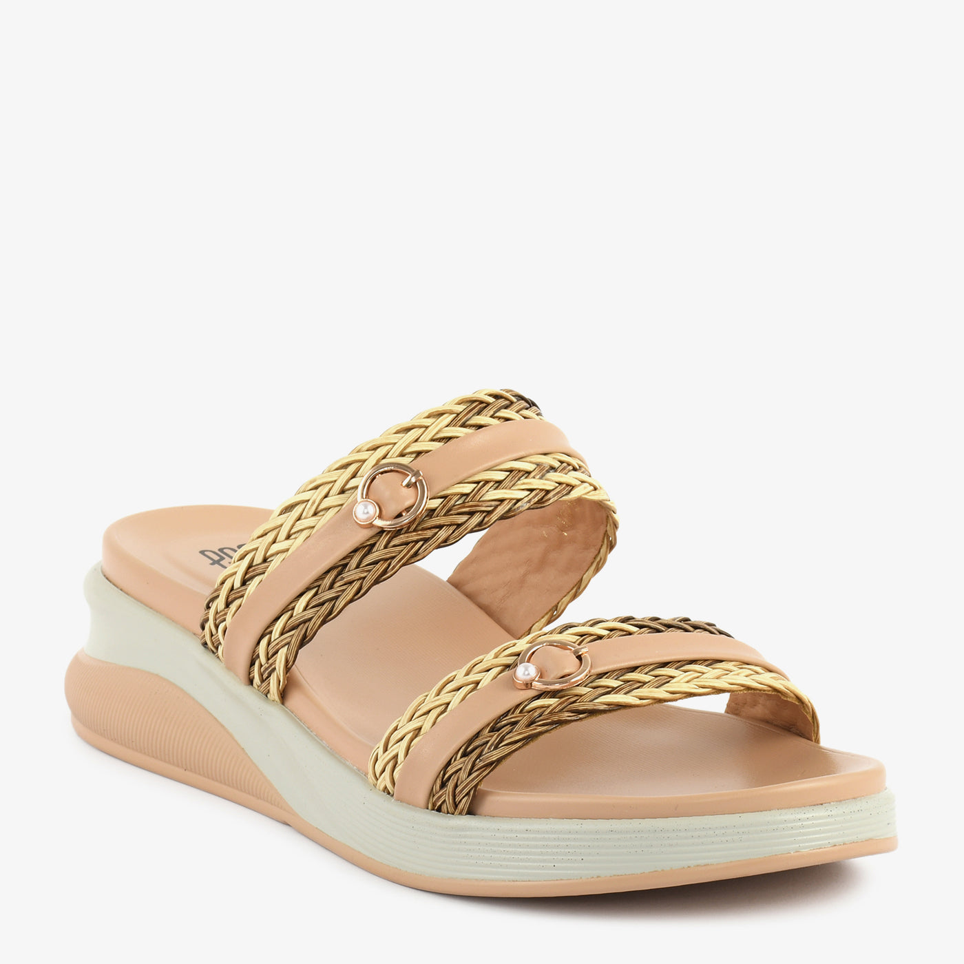 This slipper showcases a stylish blend of texture and everyday comfort. Designed with beautifully woven dual straps, it adds depth and character to the overall silhouette. Subtle metallic ring accents enhance the refined appeal without overpowering the design. The elevated platform-style sole provides gentle height while ensuring steady support throughout the day. A cushioned footbed delivers lasting comfort, making it ideal for extended wear. Its open structure allows ease of movement while maintaining a polished finish. Perfect for casual outings, travel, or relaxed gatherings, it balances fashion with practicality.