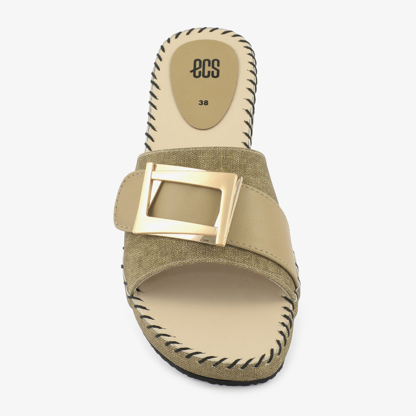 Add a touch of contemporary style to your casual look with these ECS Green Slides. Featuring a unique square buckle detail and a textured green finish, these slides offer a modern and stylish aesthetic. The low wedge heel provides subtle lift and ensures comfort for everyday wear.
