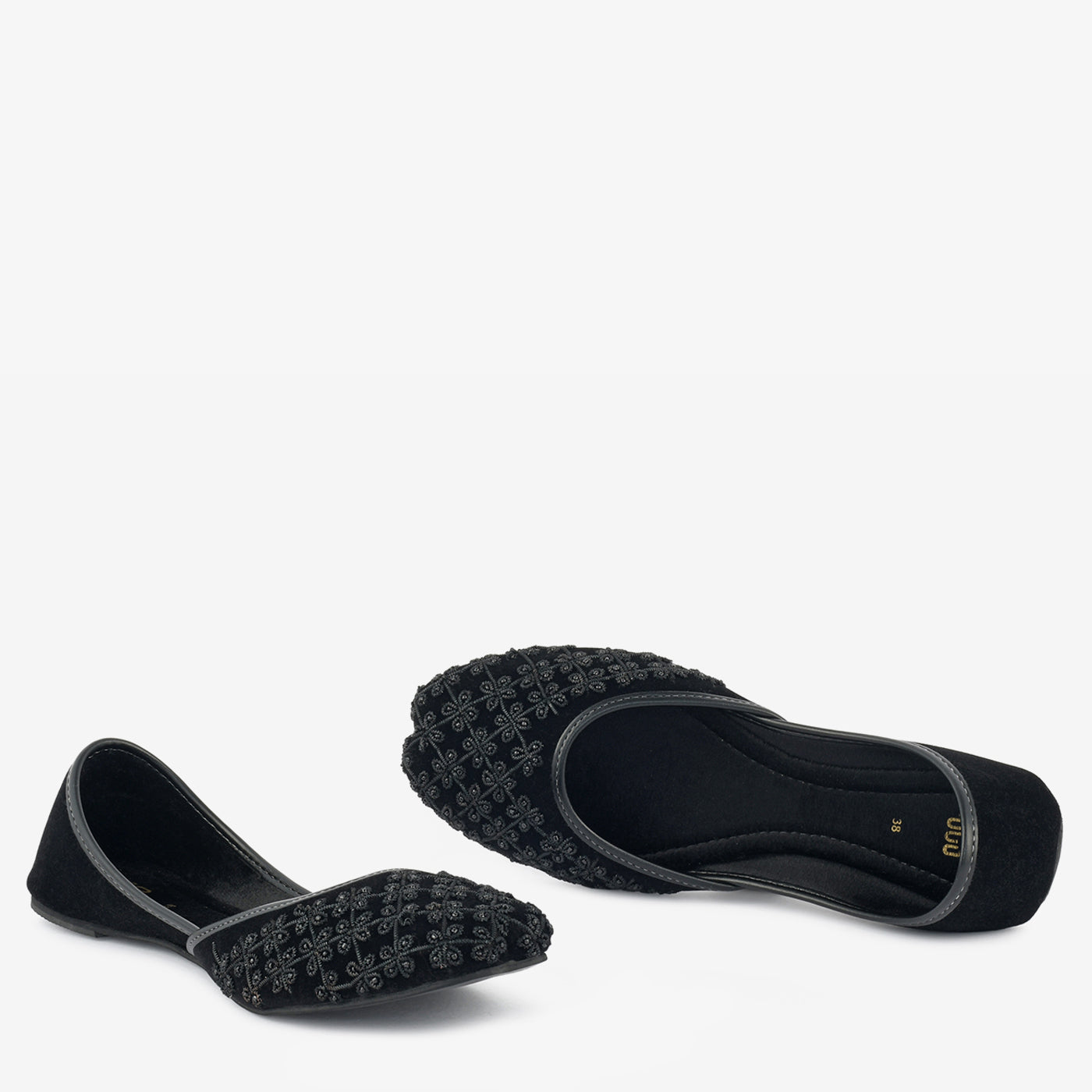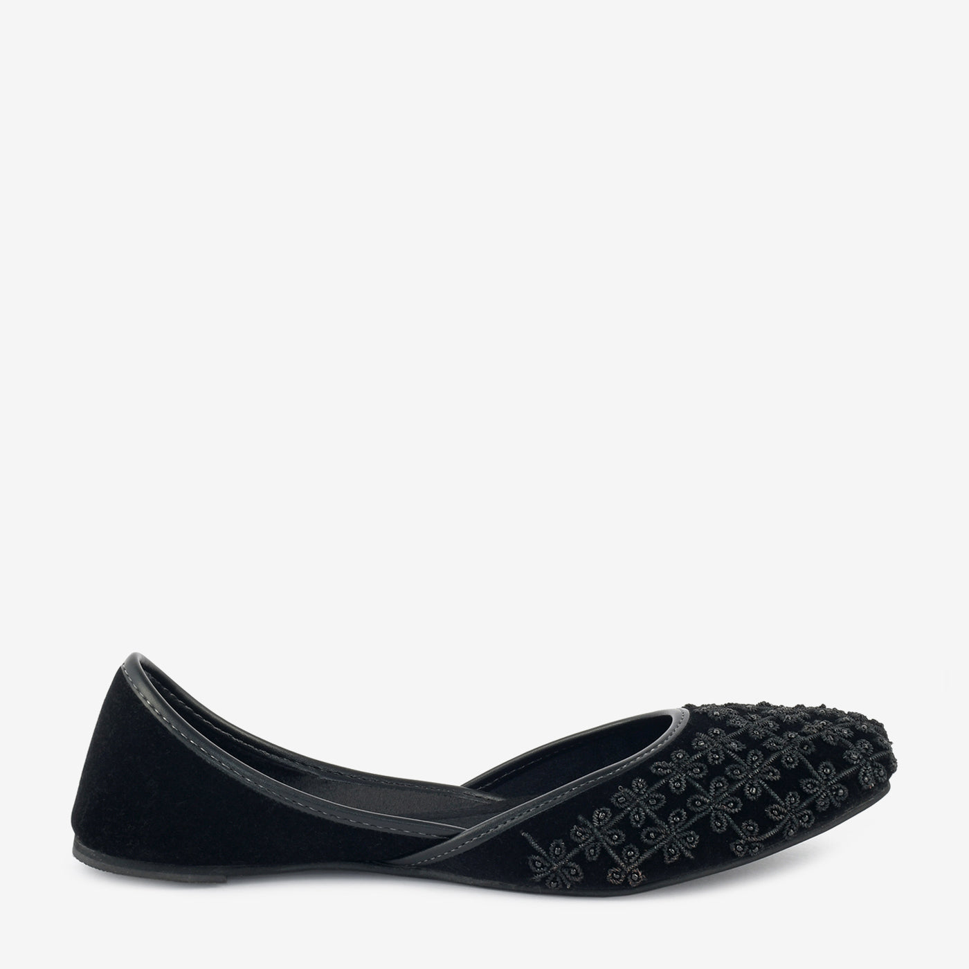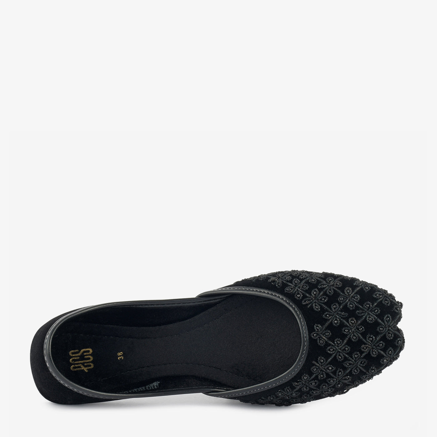 The Intrigue flat captivates with its intricate beaded design on a classic black backdrop. This elegant flat adds a touch of sophistication to any outfit, from casual to dressy.