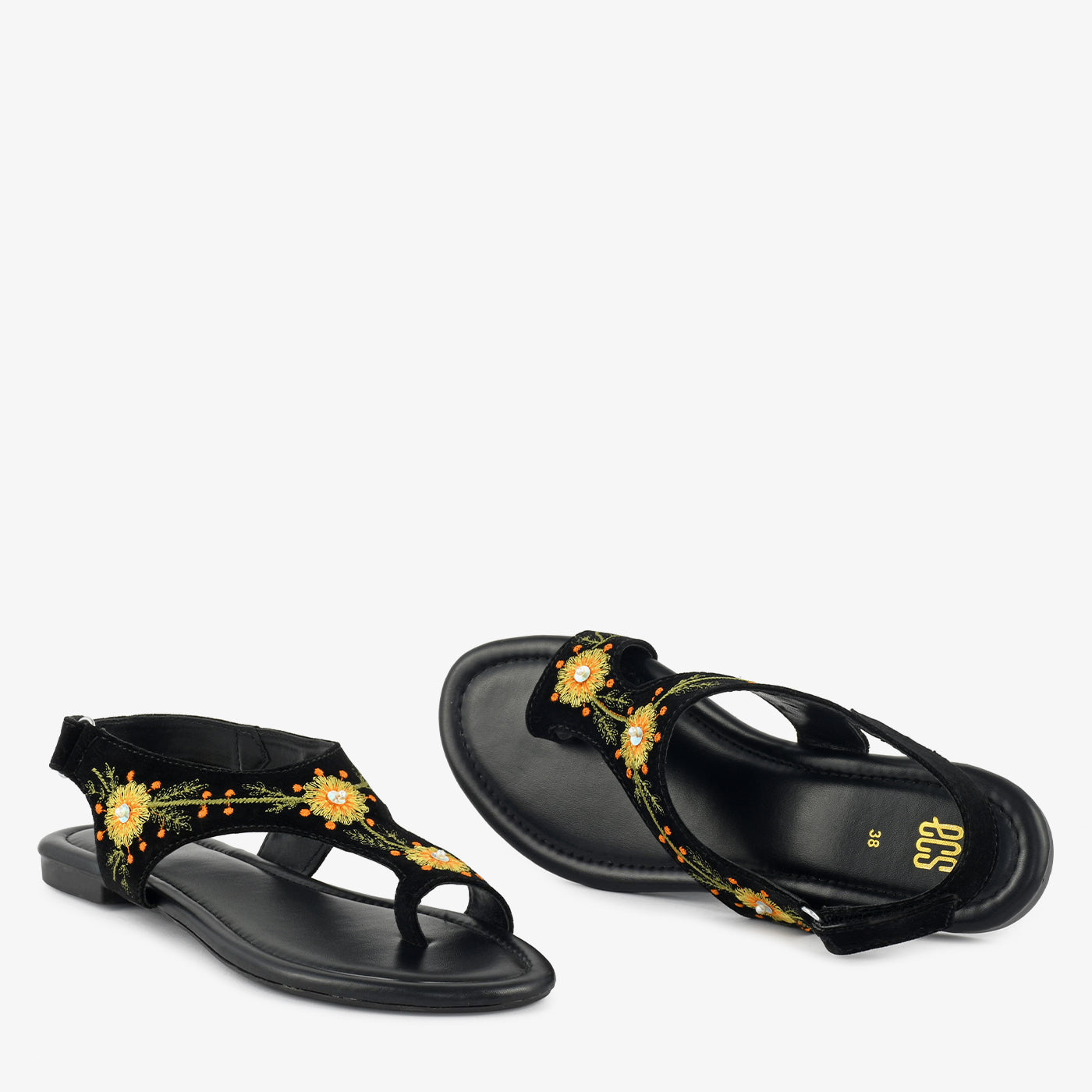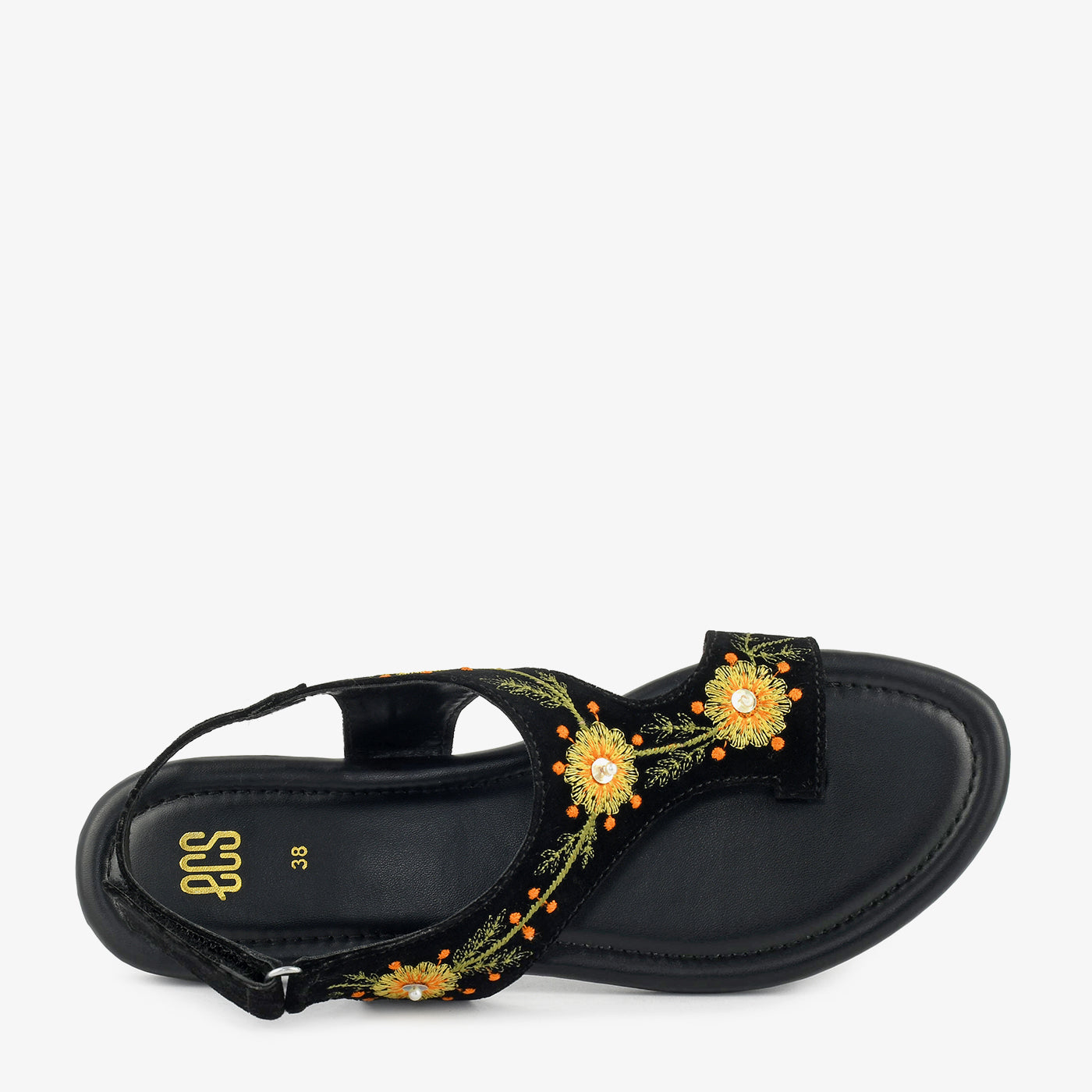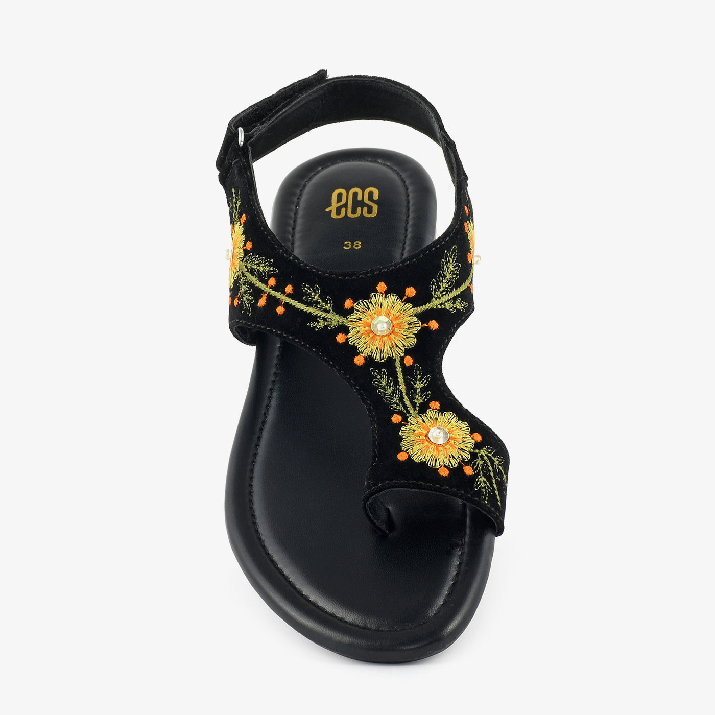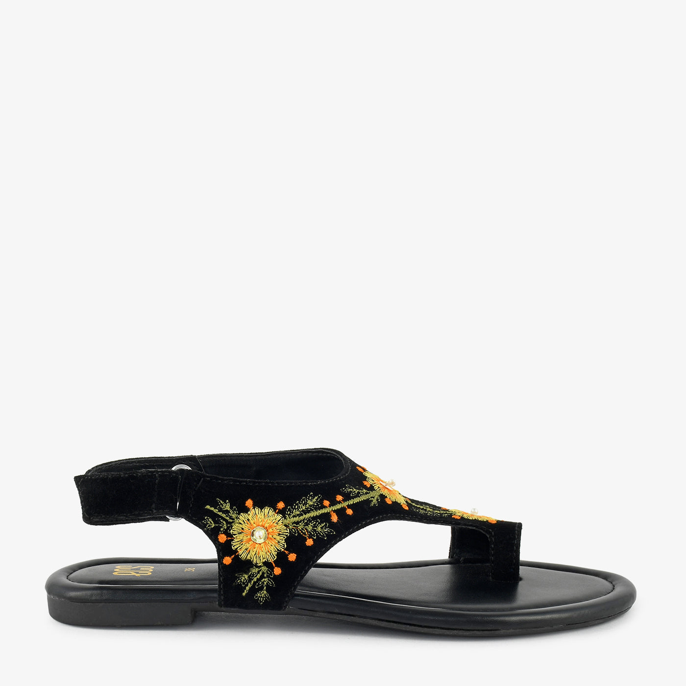 • Design: Open-toe sandal with floral embroidery and secure back strap