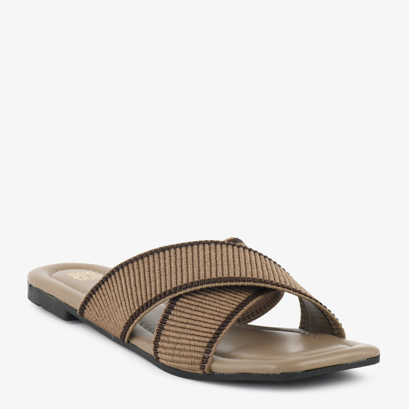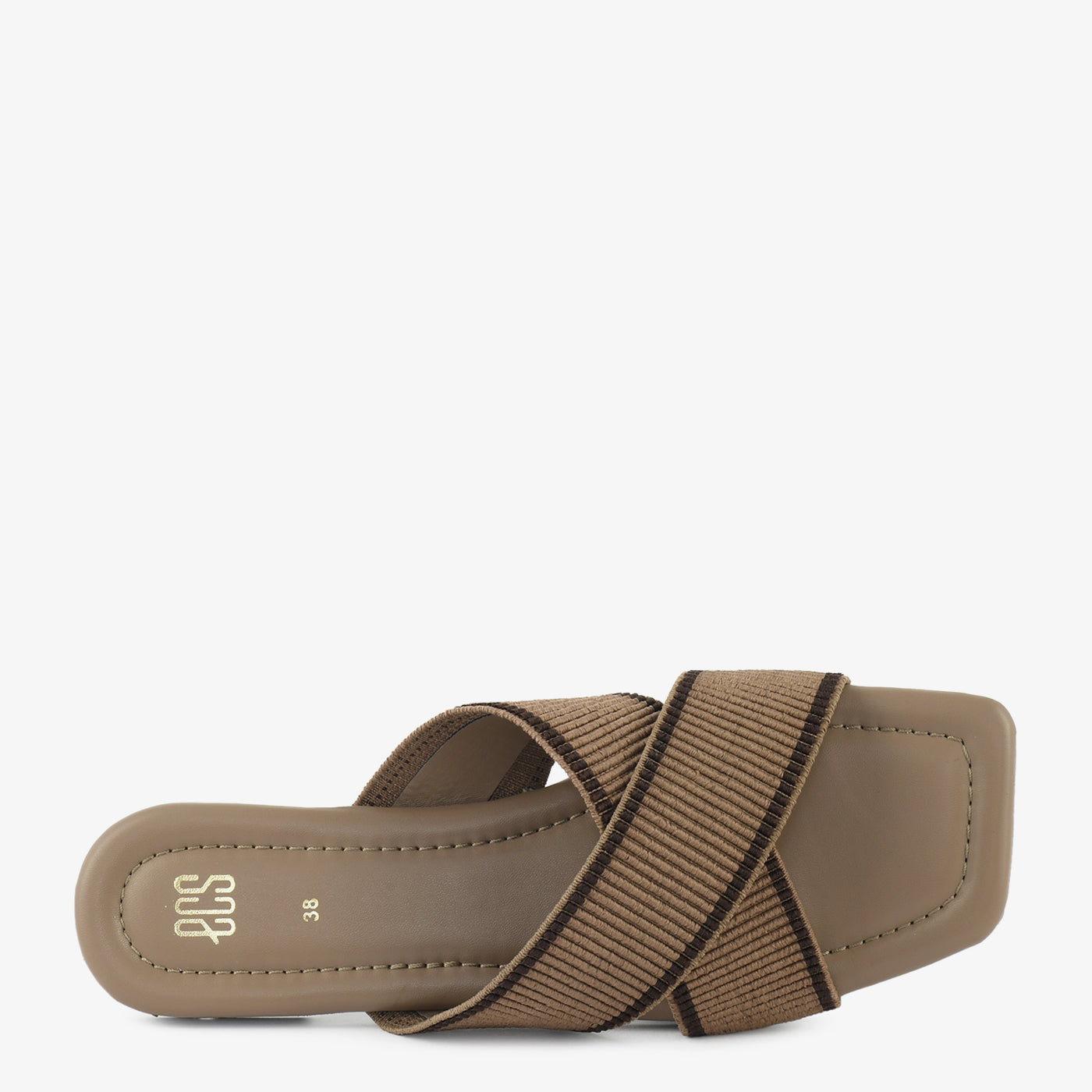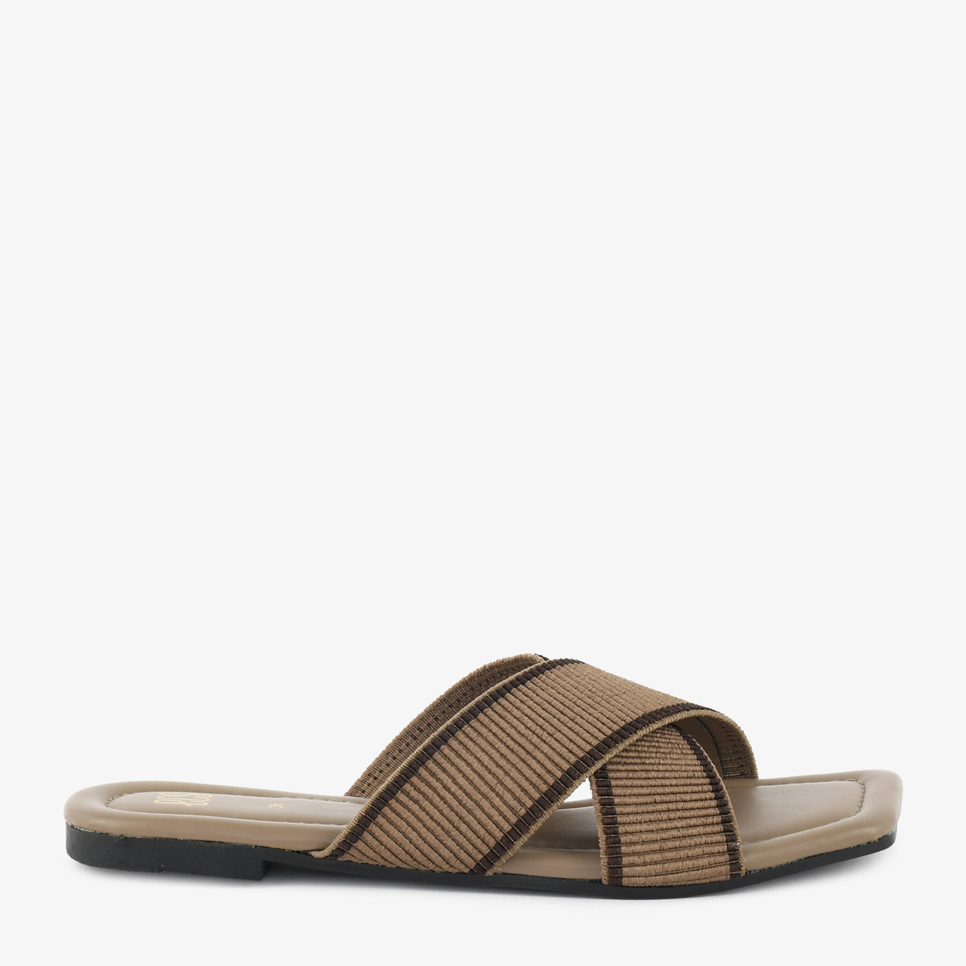 Stay grounded with this earthy brown slipper featuring wide crisscross straps and a clean silhouette. The neutral palette makes it endlessly versatile.