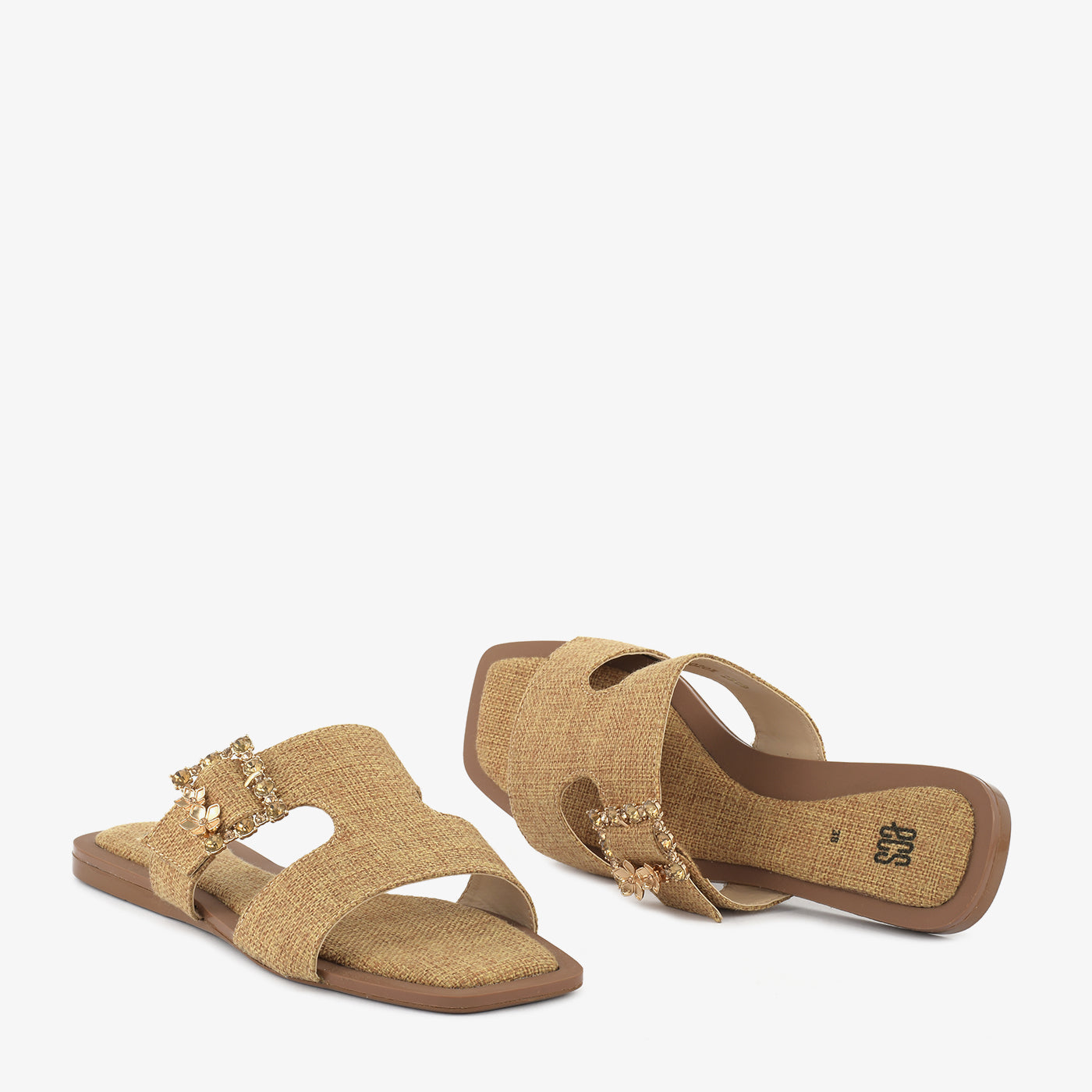 Step into effortless elegance with these woven slide slippers. The textured strap is adorned with a beautiful golden and jeweled buckle, adding a touch of refined glamour to your everyday style. The comfortable flat sole makes them perfect for warm days and casual outings.