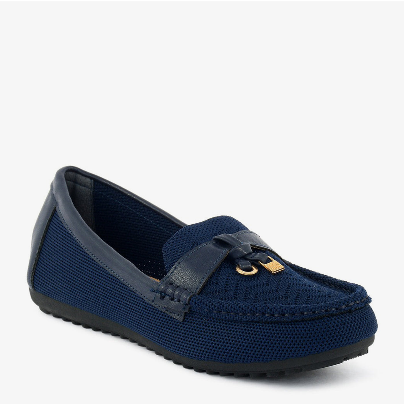 An elegant slip-on with woven texture and sleek metallic detail, perfect for elevated everyday style.