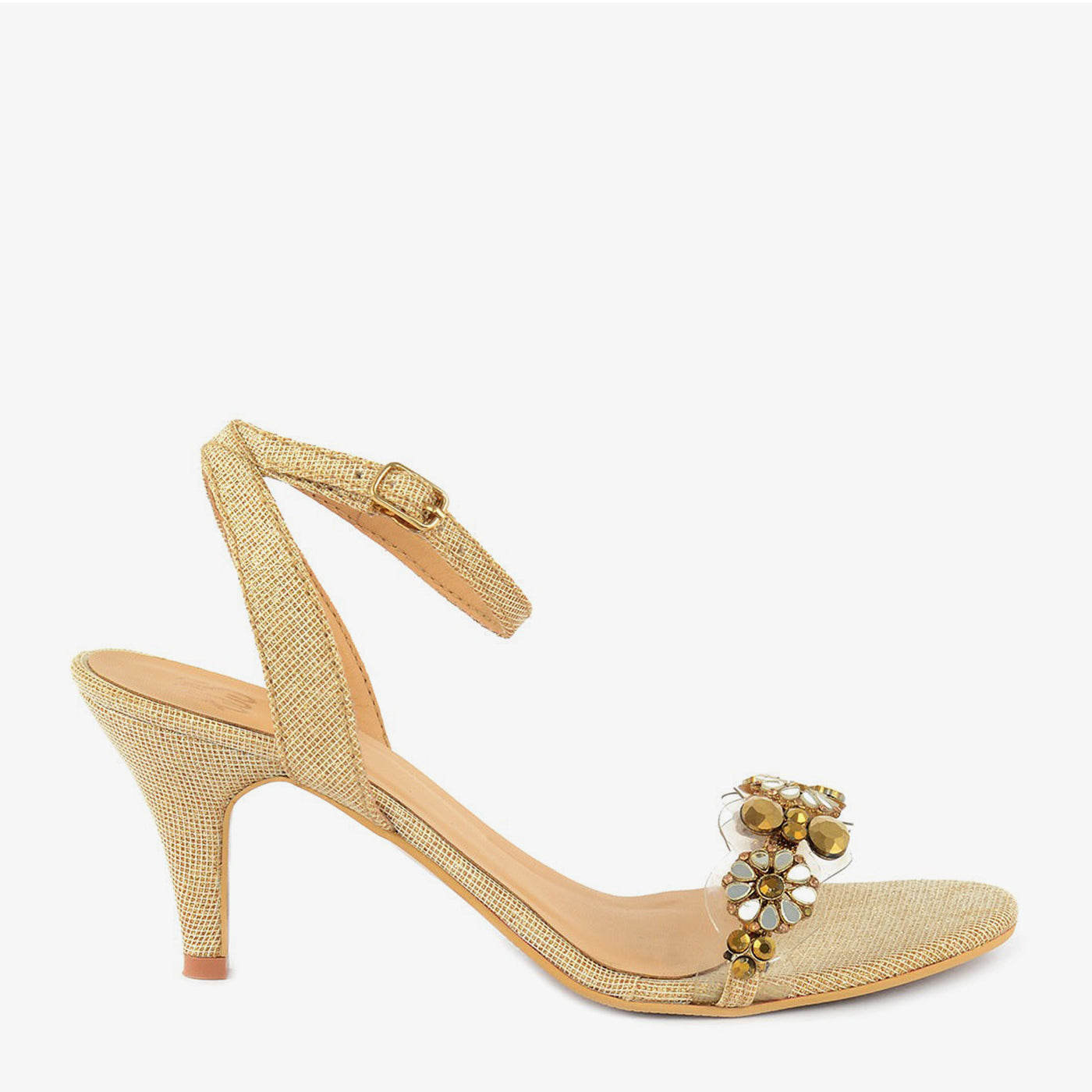 Step into glamorous evenings with these gold-toned heeled sandals, featuring a stylish kitten heel and a delicate transparent strap adorned with floral jewel embellishments. Perfect for adding a touch of sophisticated sparkle to your party wear.