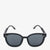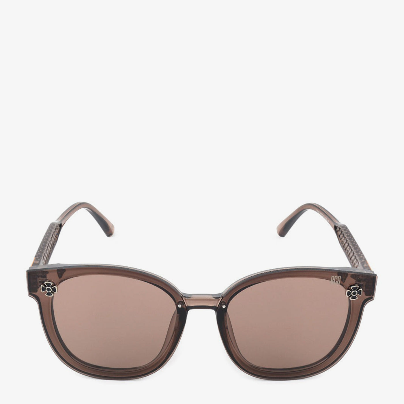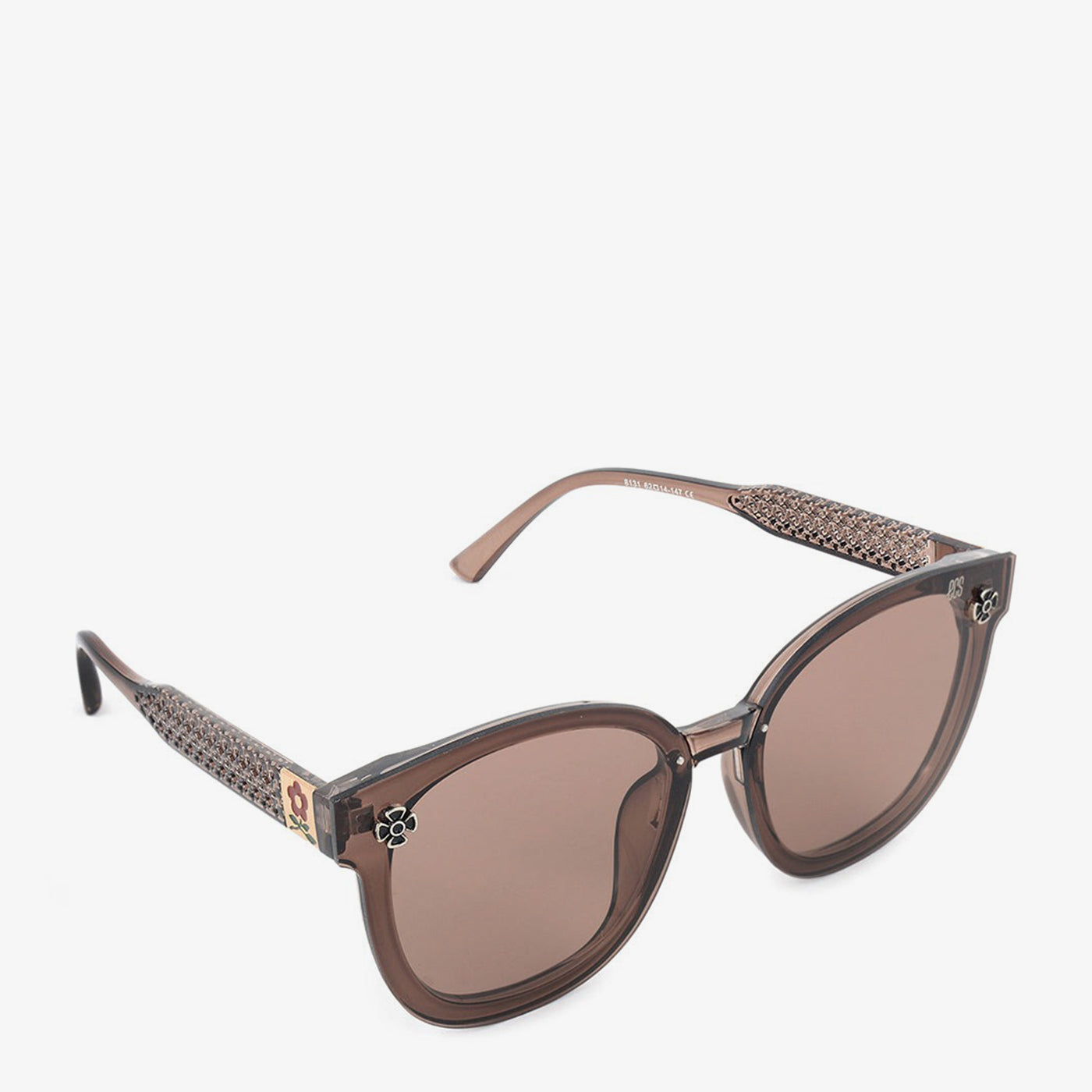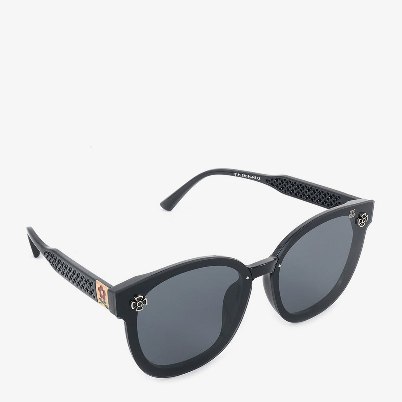 These fashionable black sunglasses feature a slightly rounded frame. The temples are adorned with a delicate silver floral embellishment. A stylish accessory with a touch of elegance.