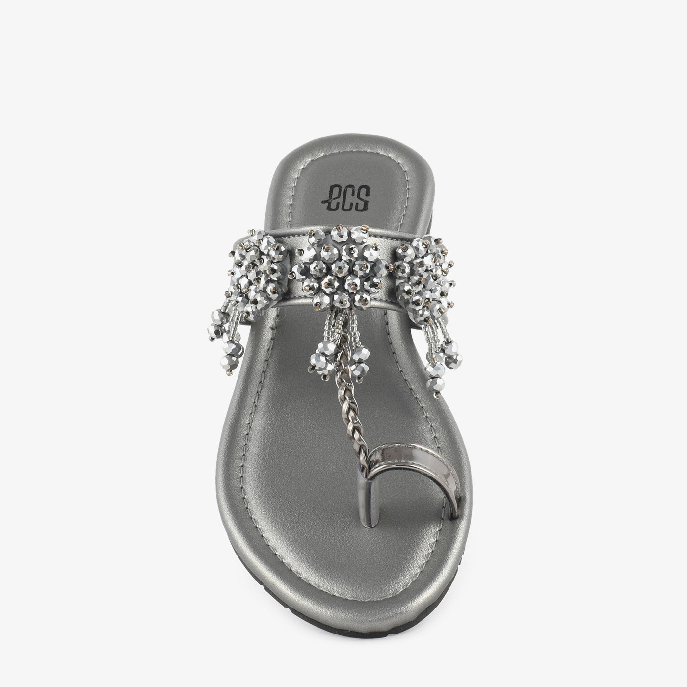 • Material: Smooth synthetic upper with decorative bead embellishments and cushioned footbed