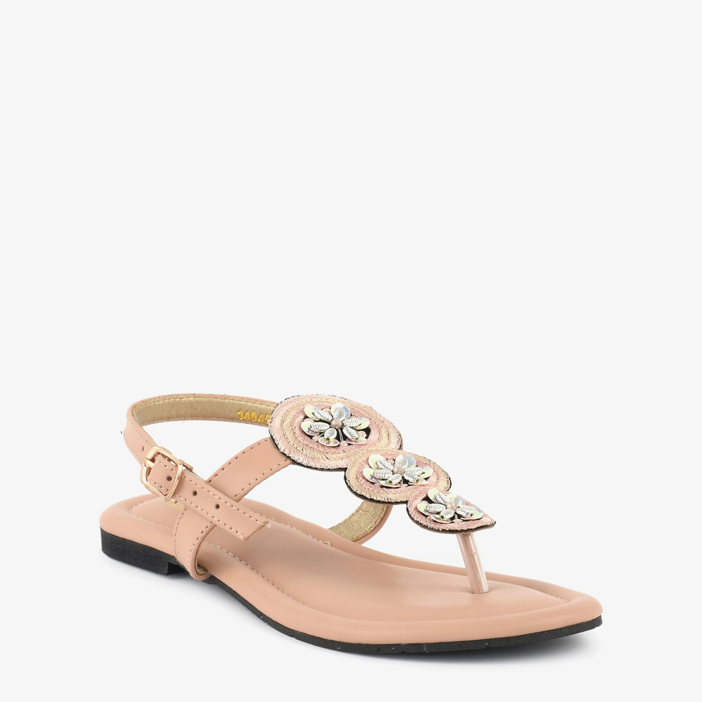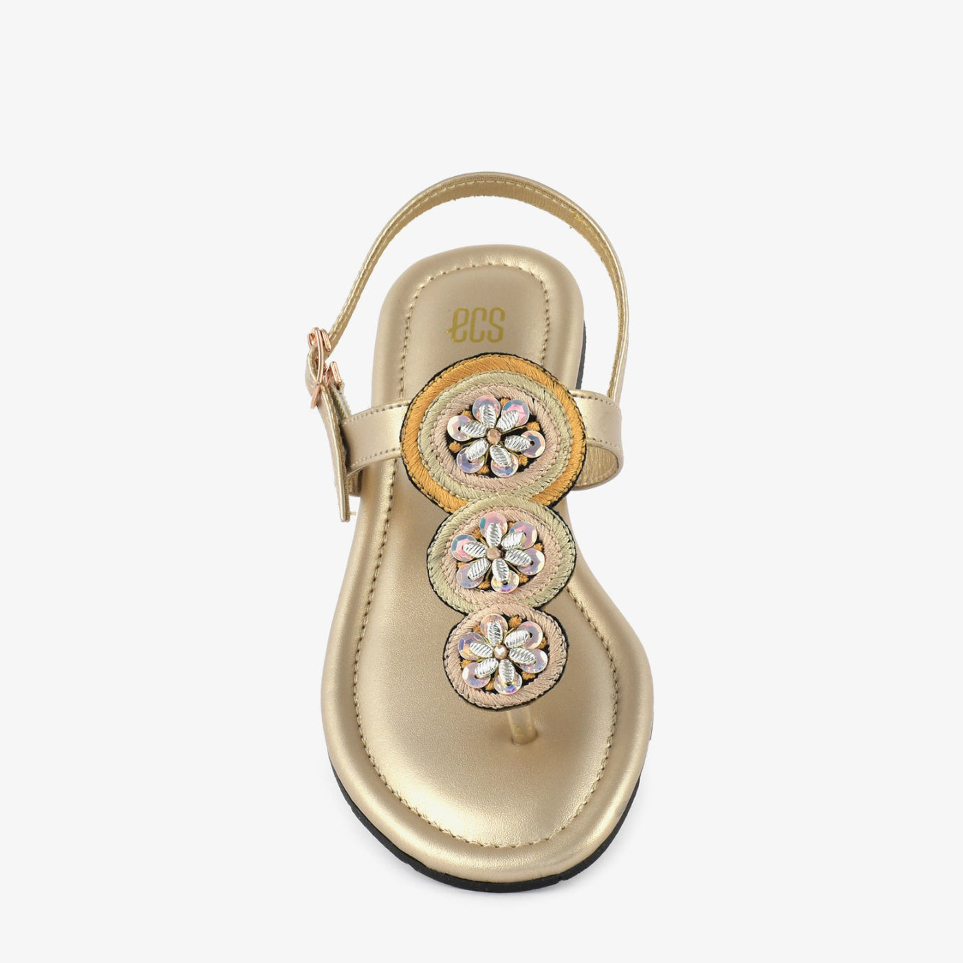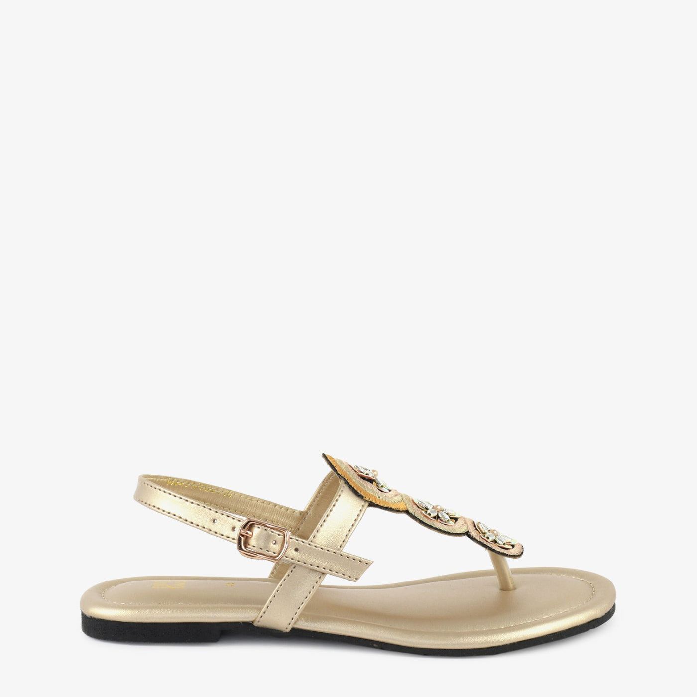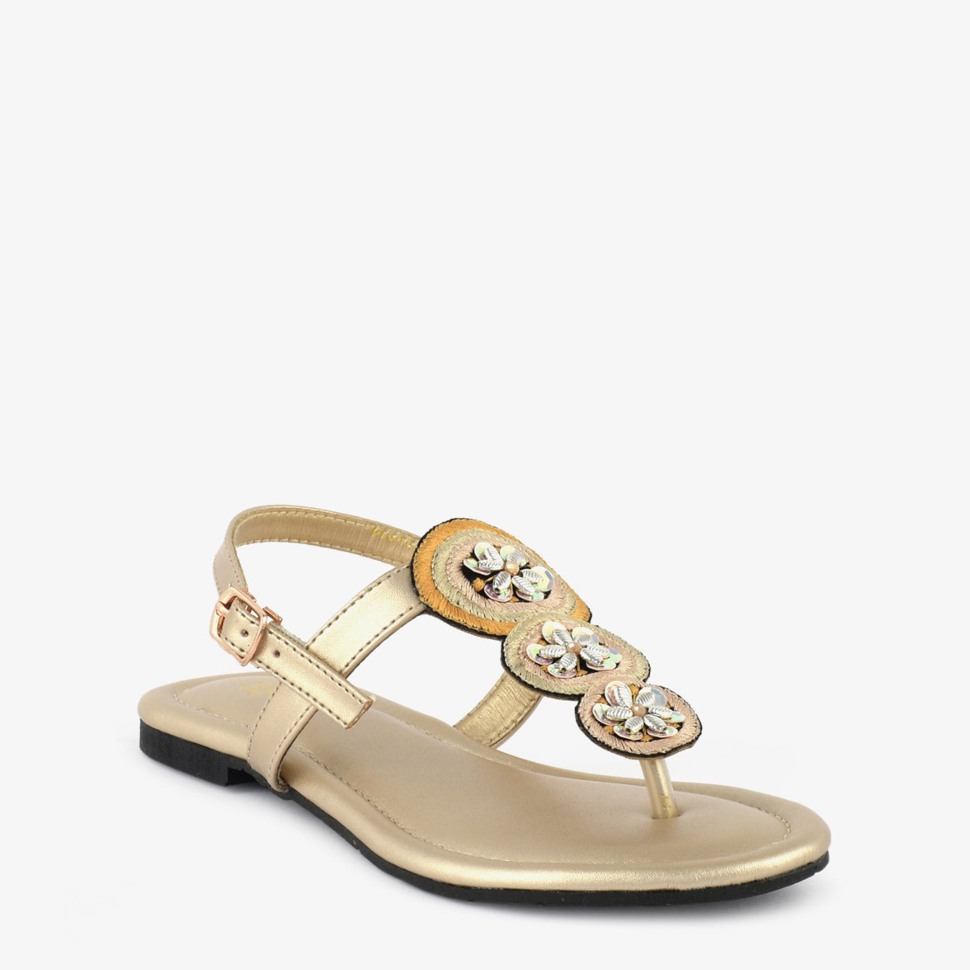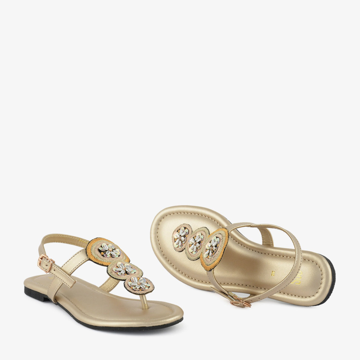 Step into delicate sparkle with the "Golden Bloom Thongs." These charming gold thong sandals feature a comfortable flat design and three floral embellishments adorned with shimmering details. The adjustable ankle strap ensures a secure fit, perfect for adding a touch of subtle glamour to your everyday style in the warm weather of Lahore.