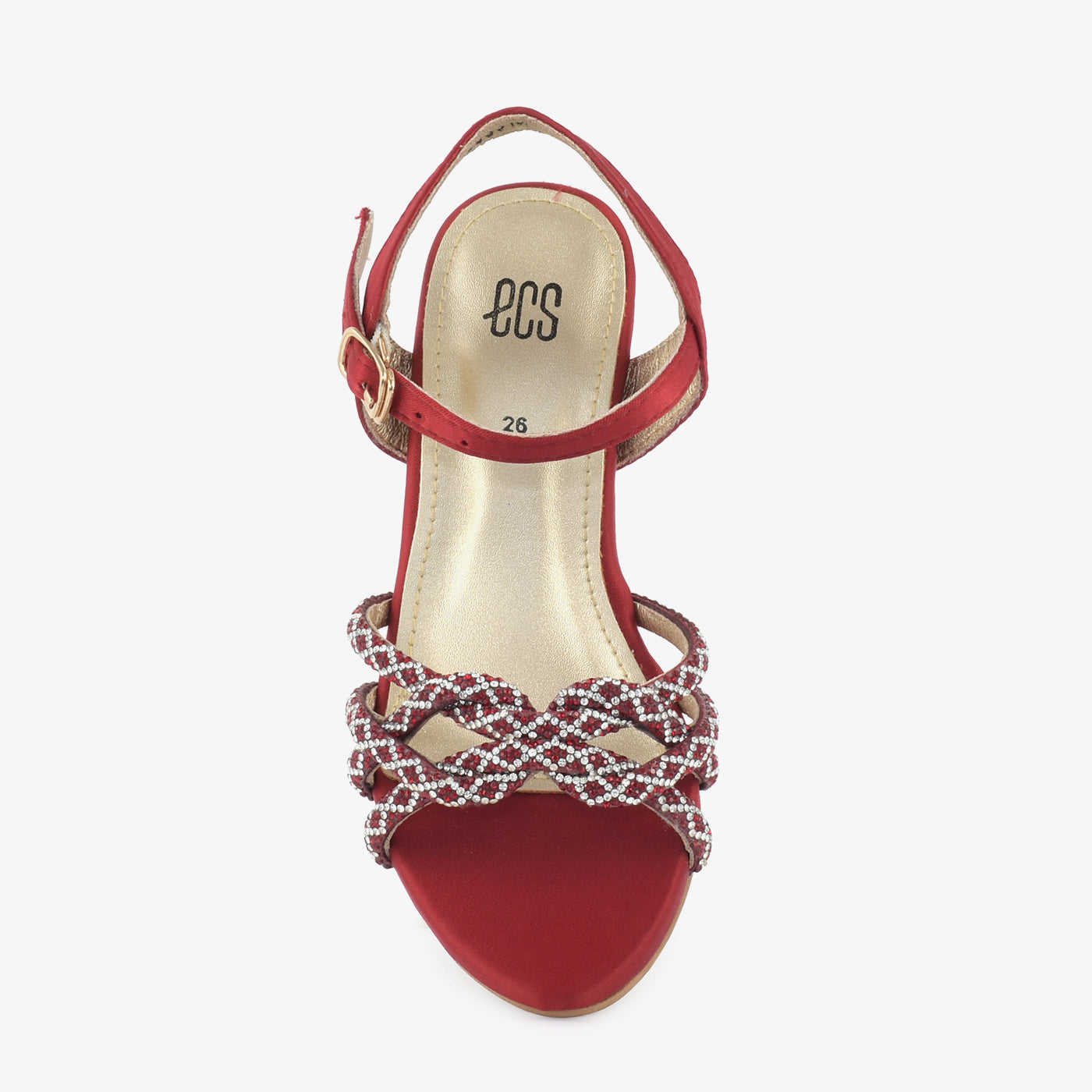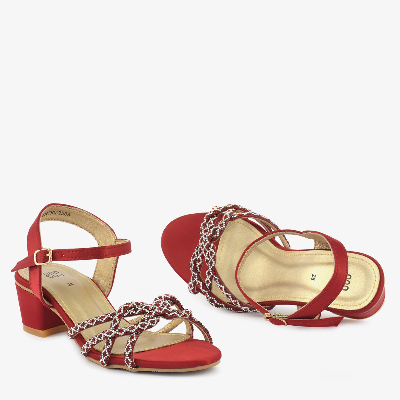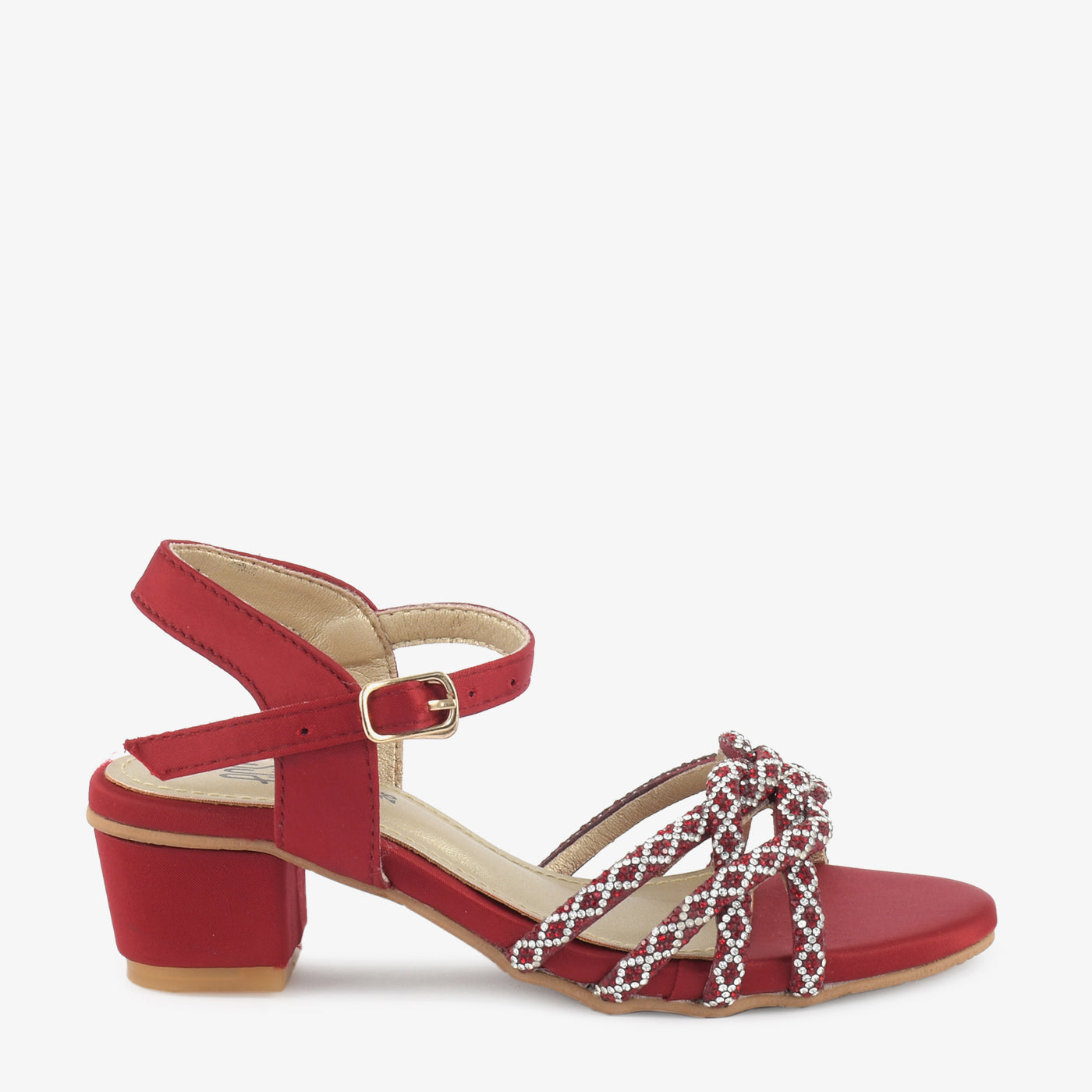 Step into striking style with the Crimson Knot. These heeled sandals for girls feature multiple crisscrossing straps with a unique knotted detail at the front, adorned with small, shimmering embellishments. The low block heel and ankle strap with a buckle closure ensure a comfortable and secure fit for various occasions.