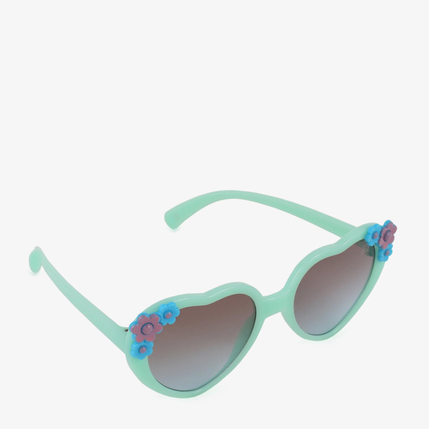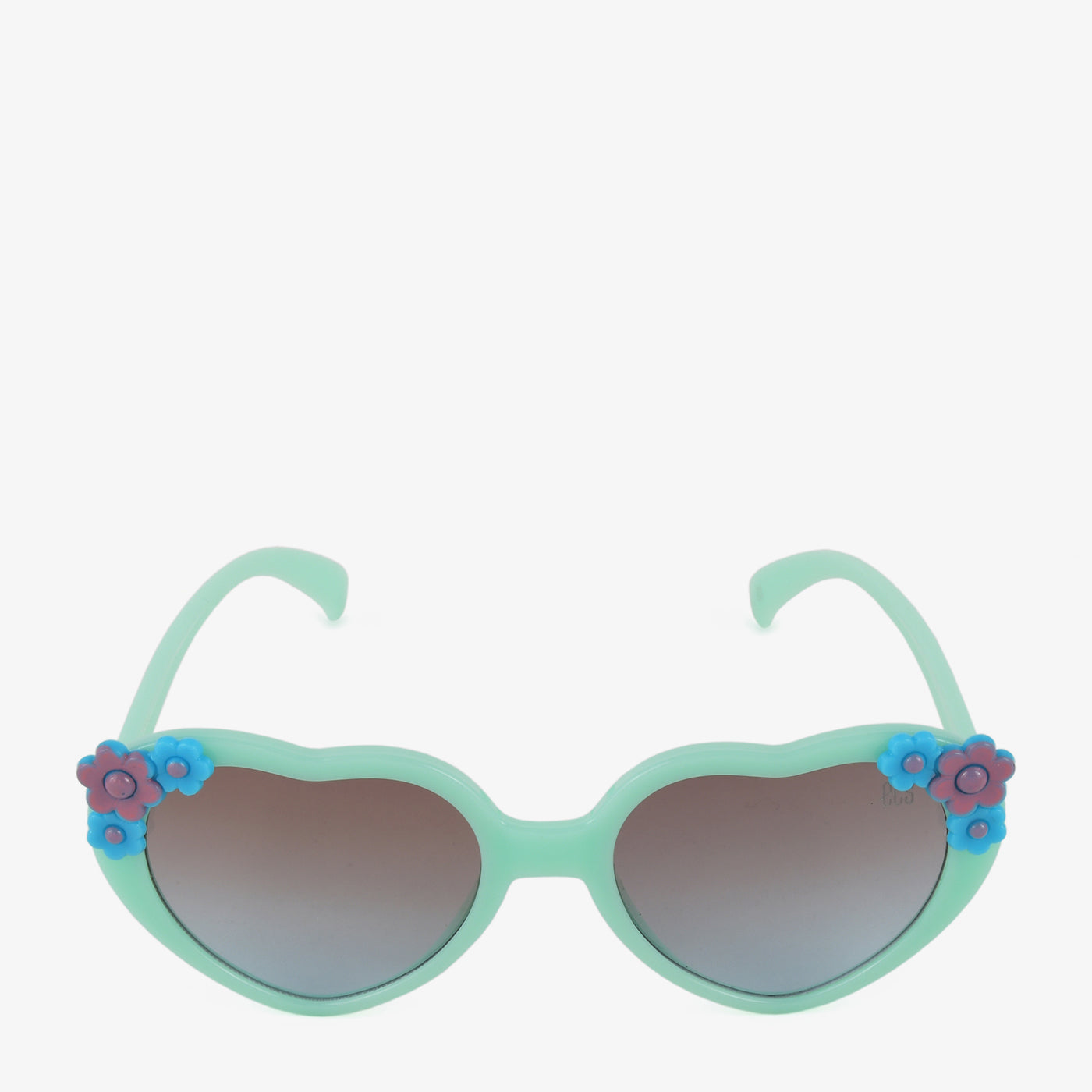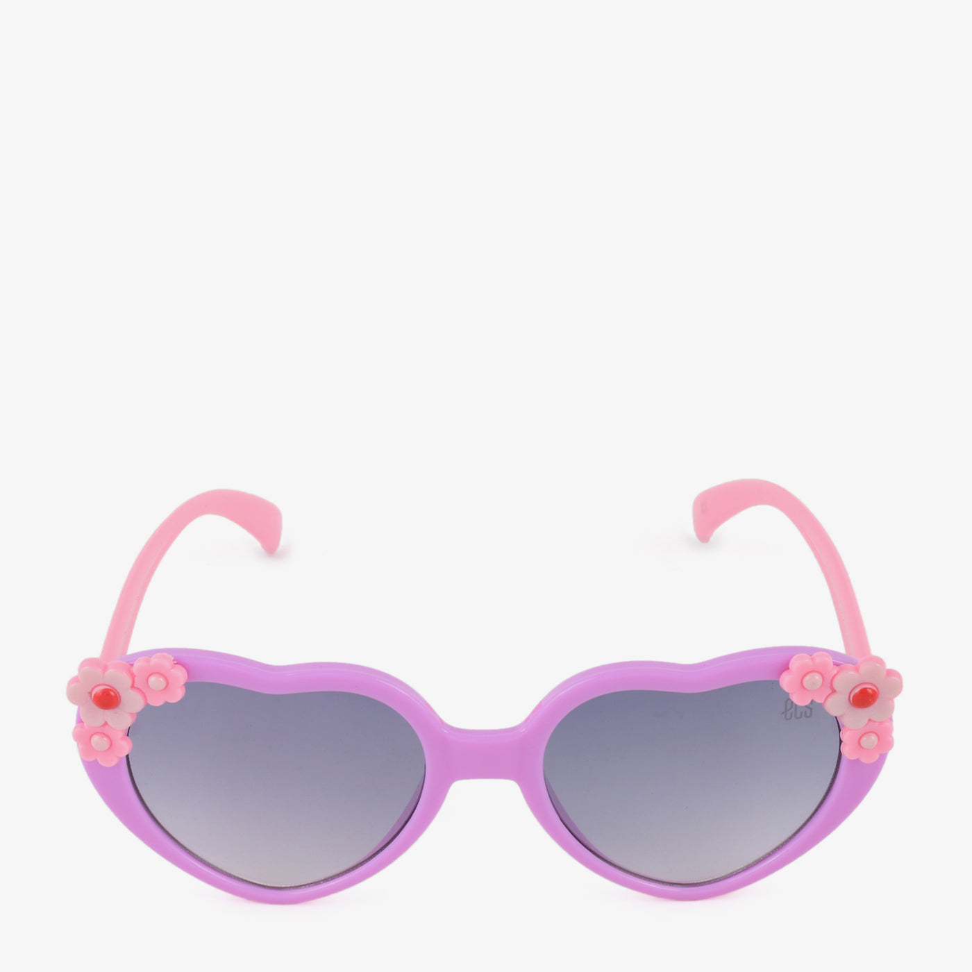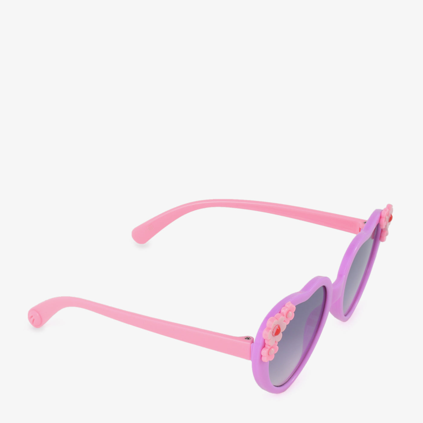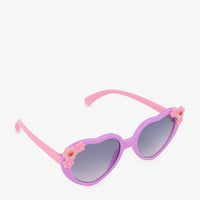 Let your little one shine with these adorable and playful children's sunglasses. They feature heart-shaped, dark-tinted lenses framed by a charming border of floral petal-like details, set on a plastic frame. These sunglasses are perfect for adding a fun and vibrant touch to any child's outfit.