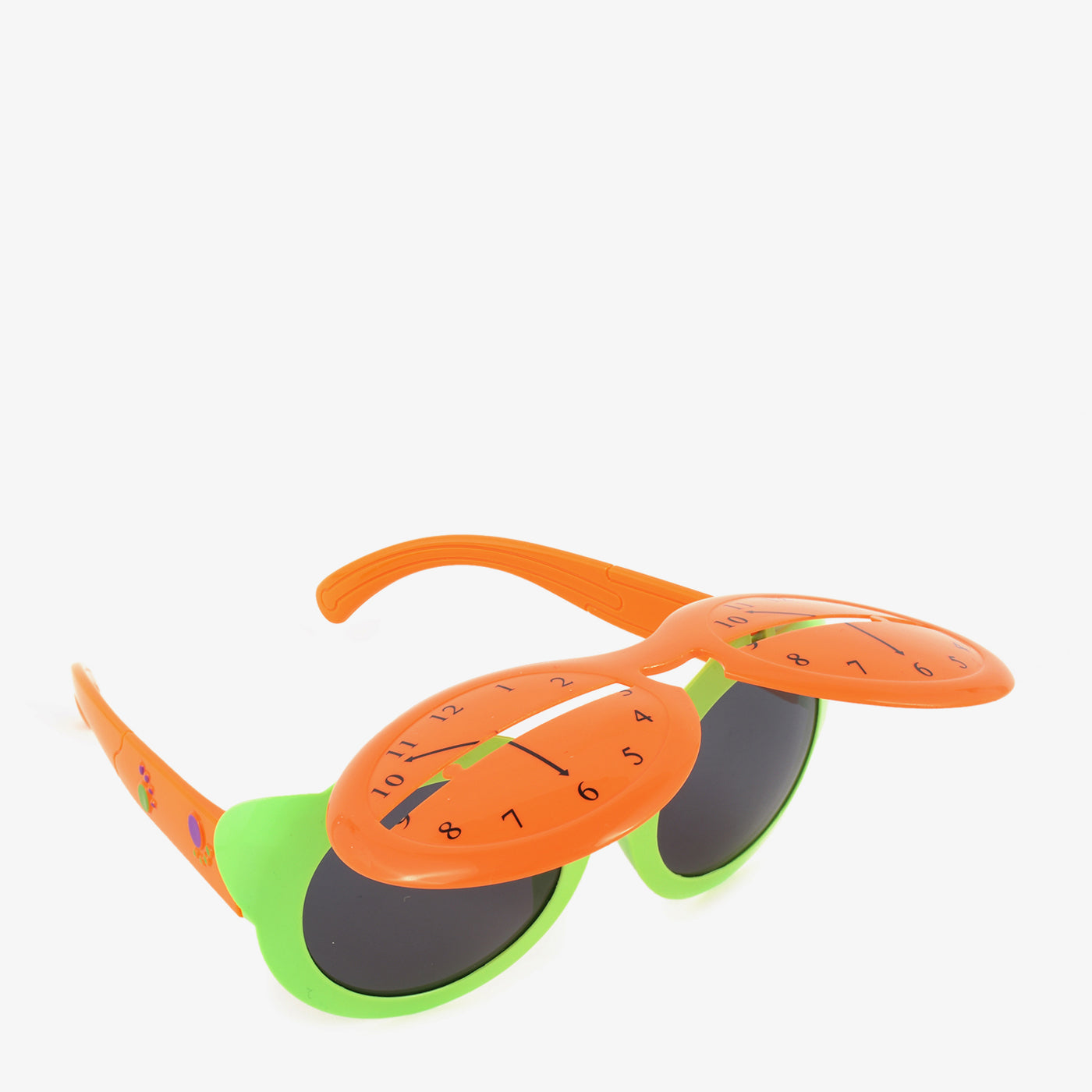Add a playful twist to sunny days with the "Shades." These fun orange and green sunglasses feature a whimsical clock design on each lens. Perfect for adding a touch of quirky style to any outfit for your little one.